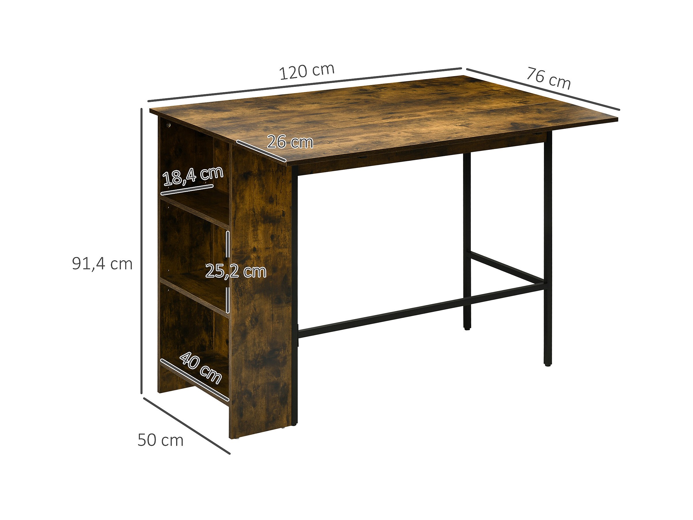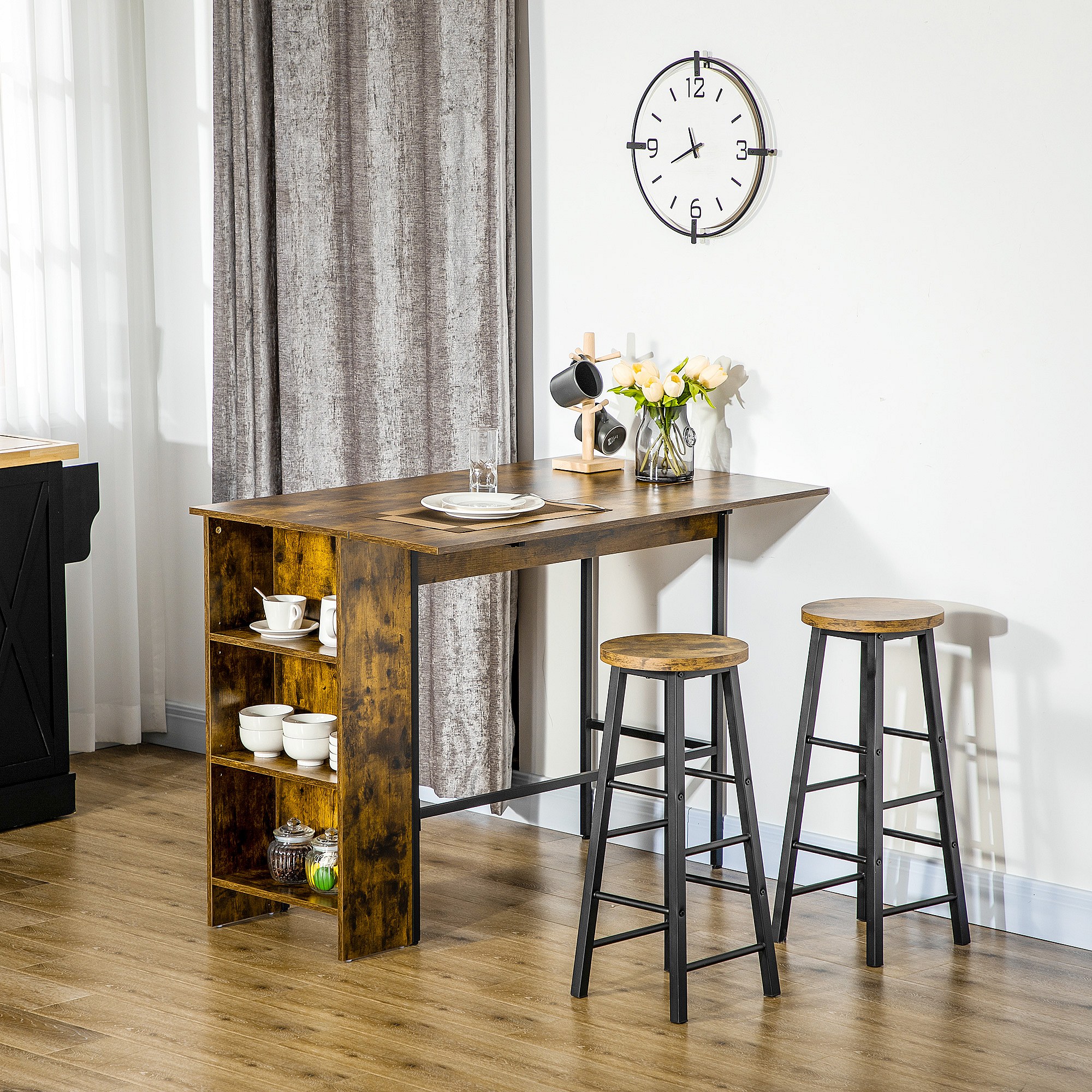 Table de bar extensible design industriel - 3 étagères intégrées - châssis métal noir aspect bois vieilli