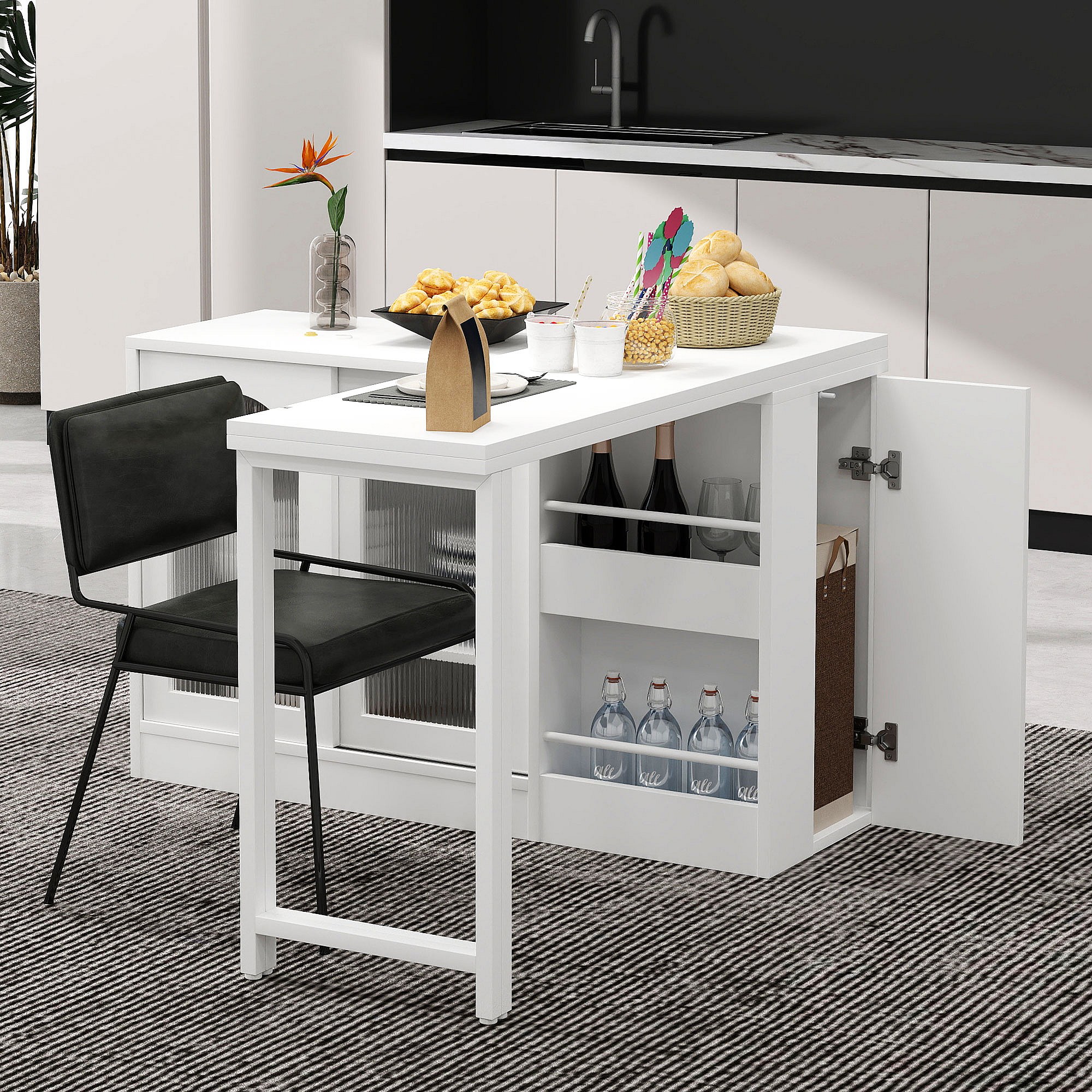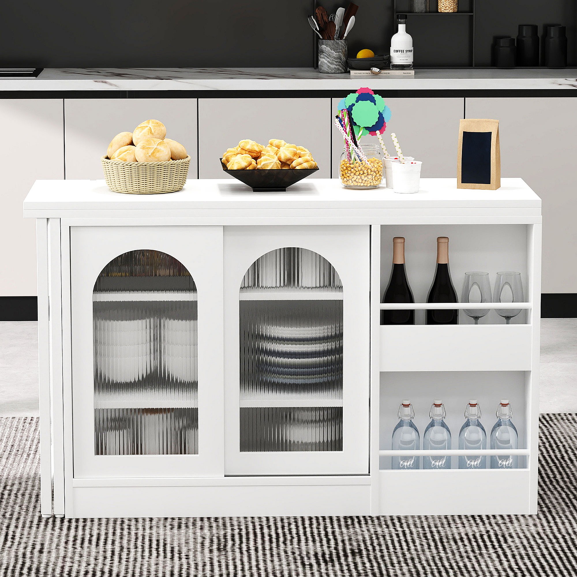 Table de bar extensible rotative à 360°avec portes vitrées - 121.5 x 40 x 76.7 cm - MDF - blanc