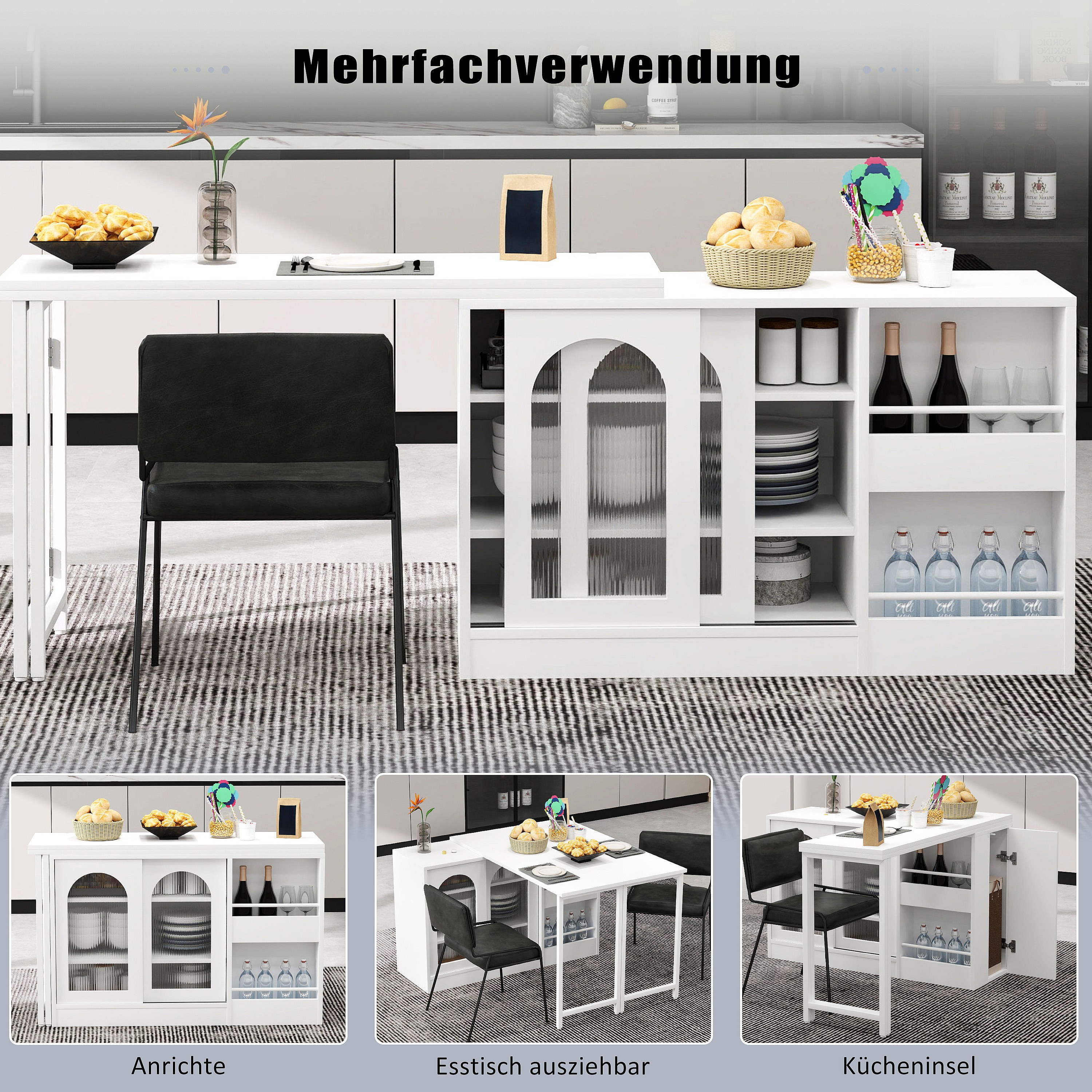 Meuble de bar extensible - 138-204 x 39 x 104 cm - table à manger rotative à 360 °- avec 2 portes + 1 tiroir - MDF - blanc