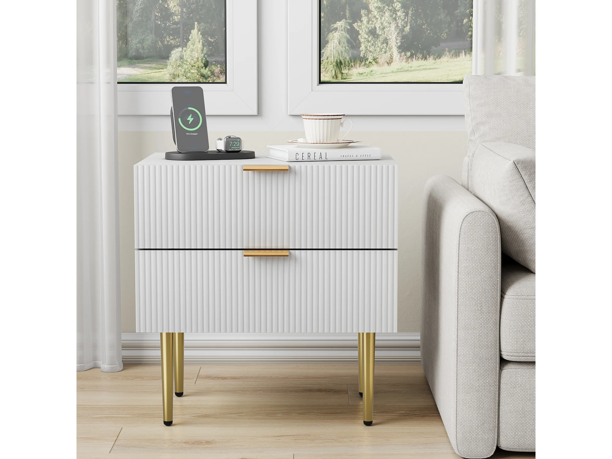 Table de chevet à 2 tiroirs - Table de chevet avec pieds en métal - motif ondulé blanc - pour chambre à coucher