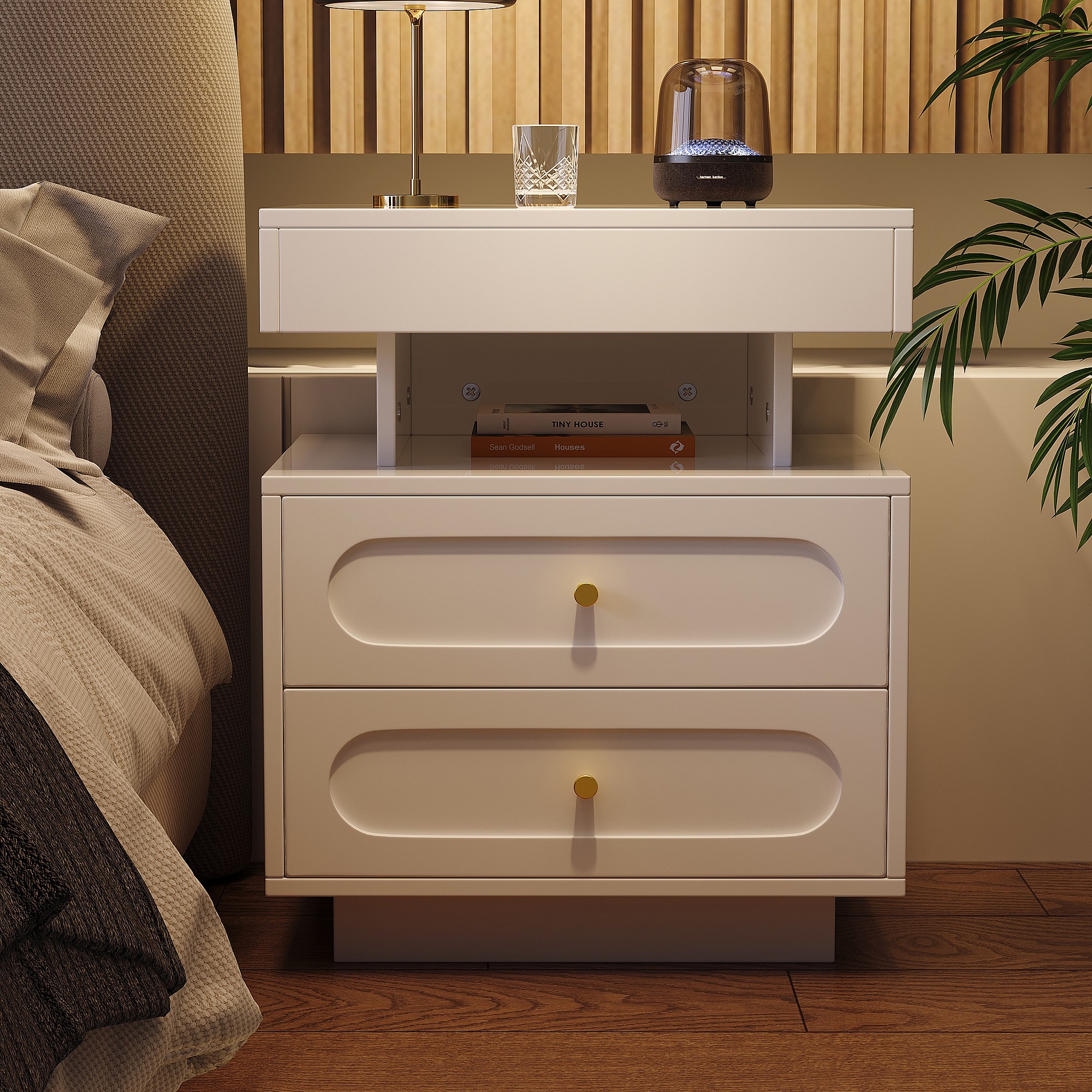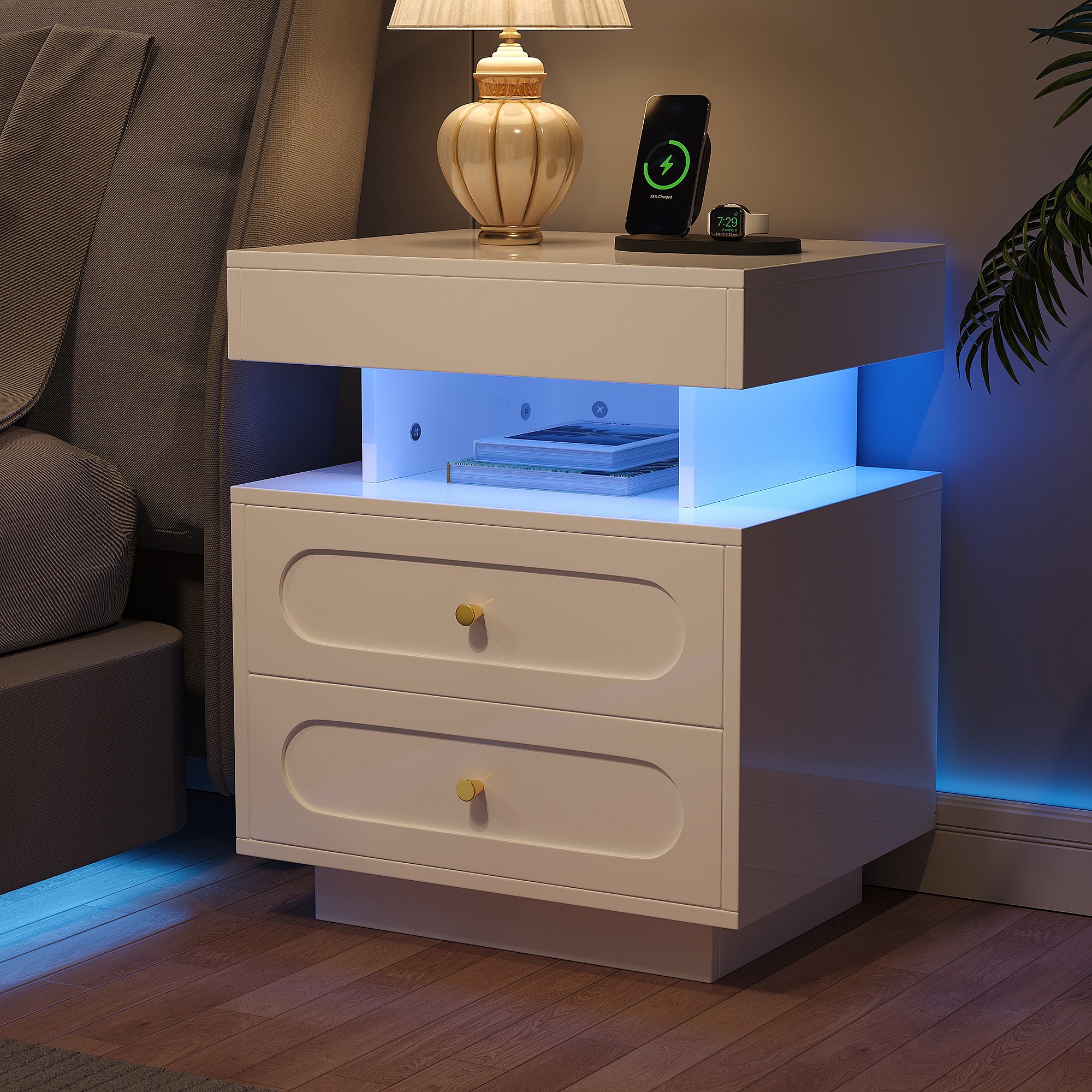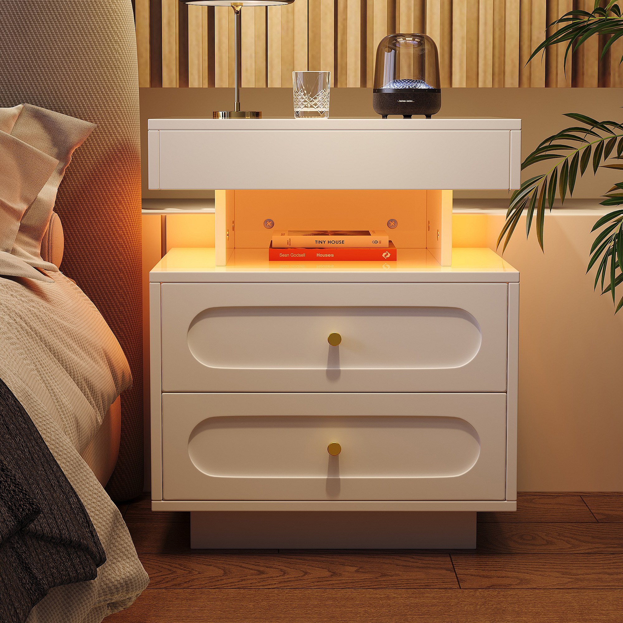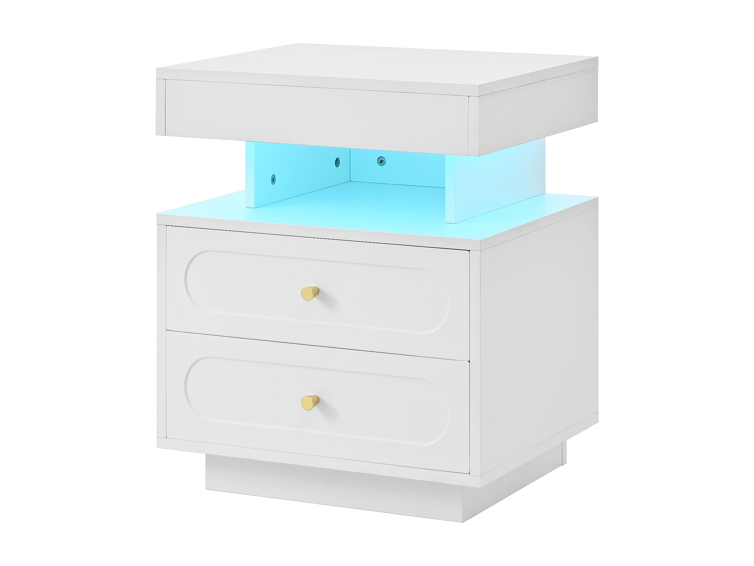 Table de chevet avec Led + 2 tiroirs + 1 rangement ouvert - 50 x 40 x 60 cm - aggloméré - blanc