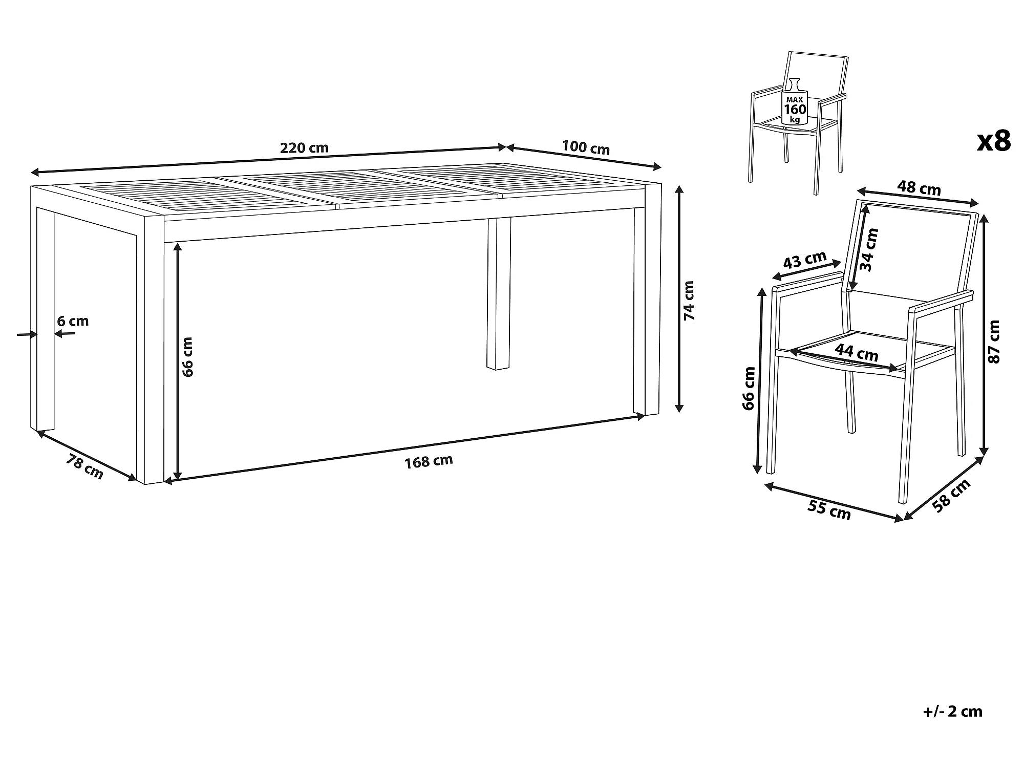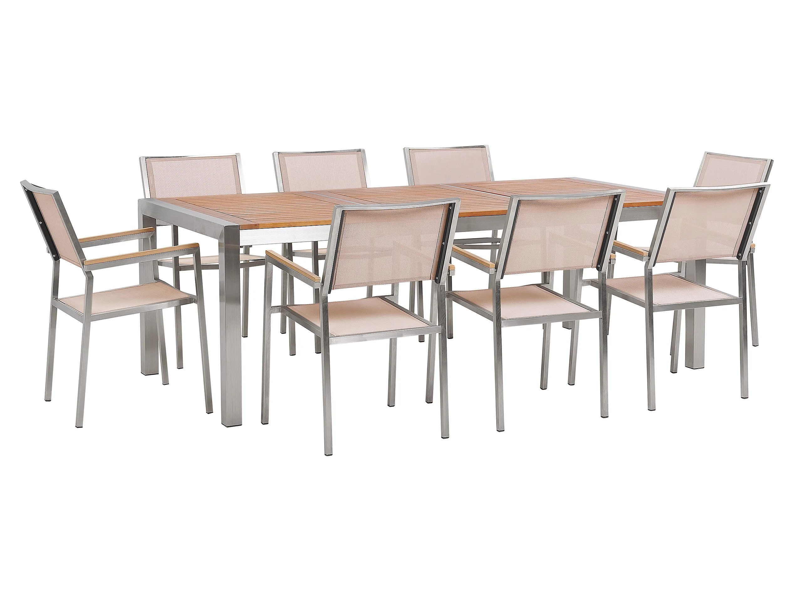 Salon de jardin : 6 fauteuils en métal + 1 table à manger en bois d'acacia + 6 coussins d'assise - Beige