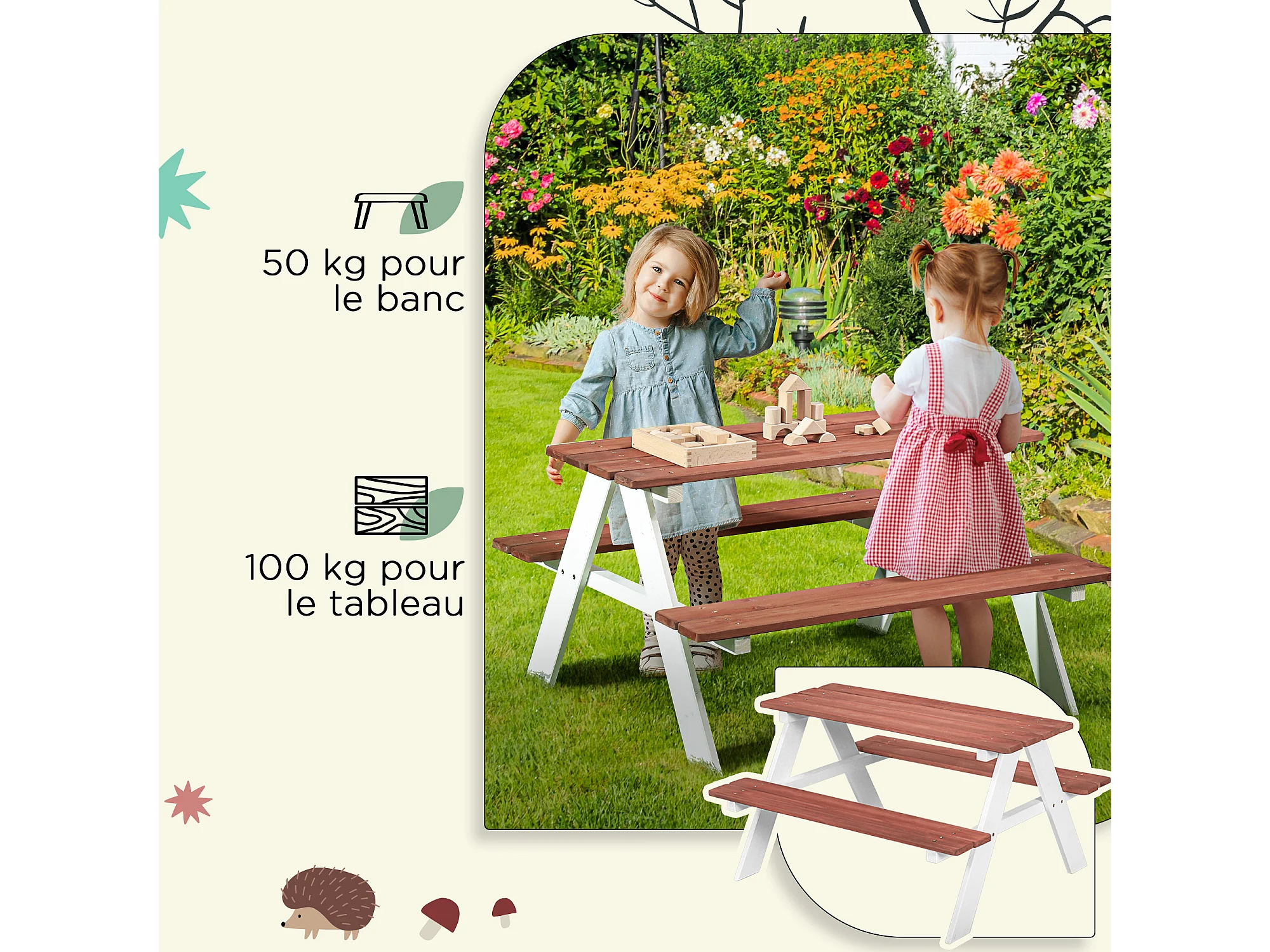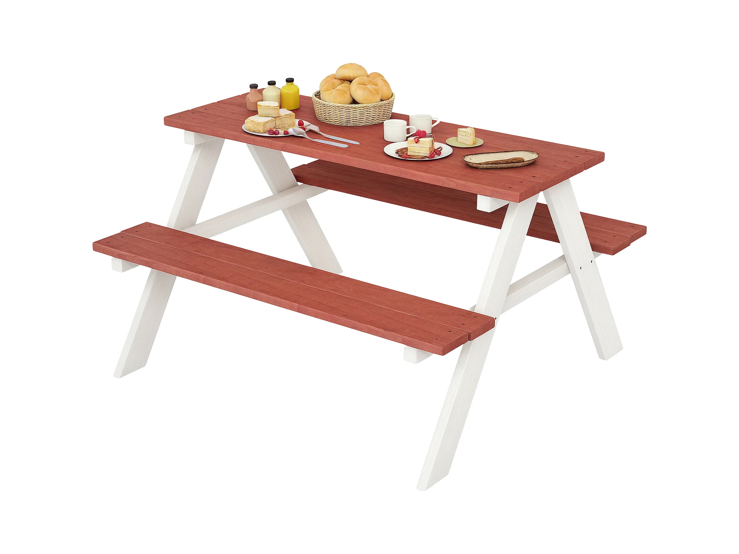 Table de pique-nique enfant - 2 bancs - assises, plateau à lattes - bois sapin blanc brique