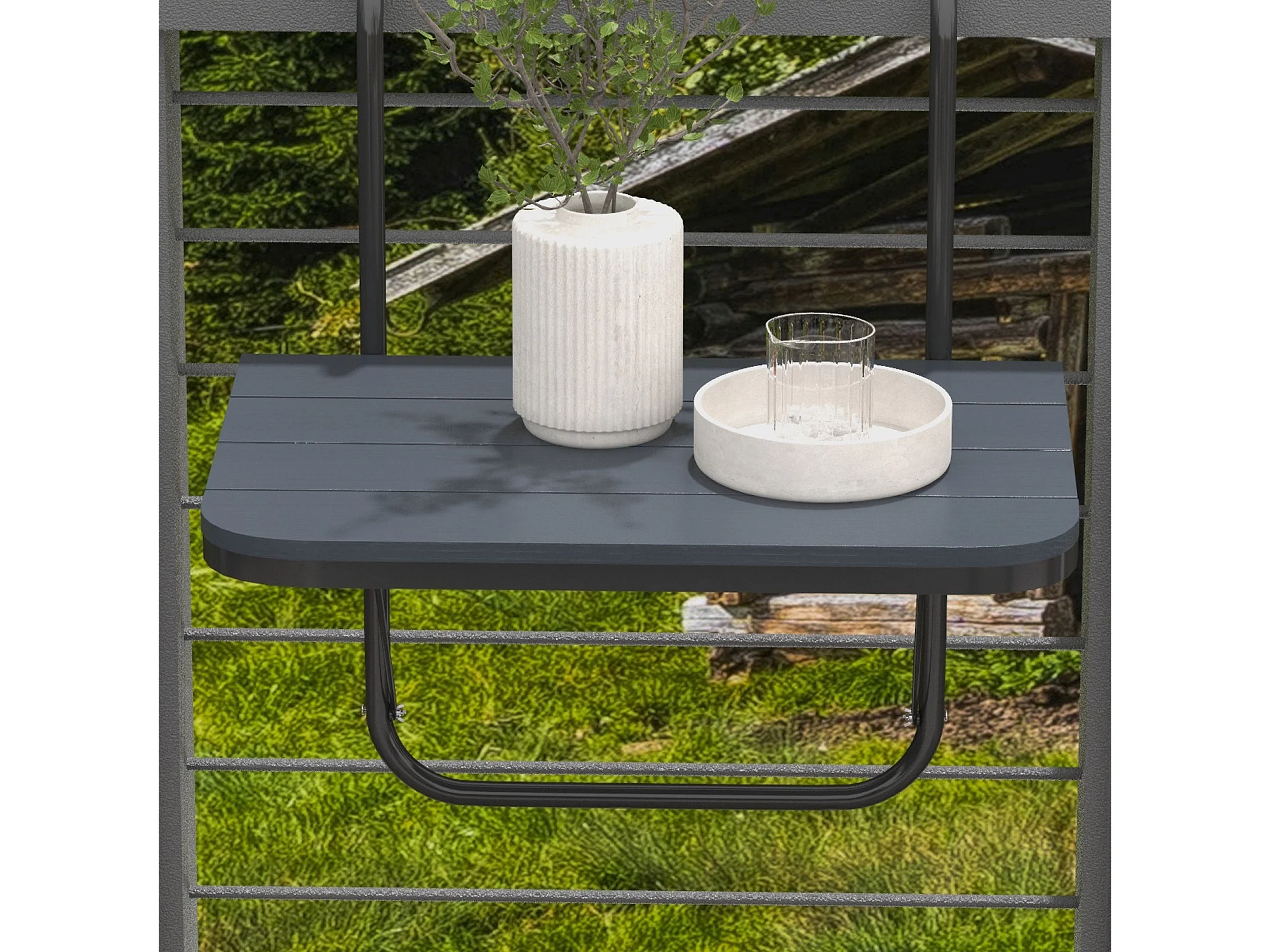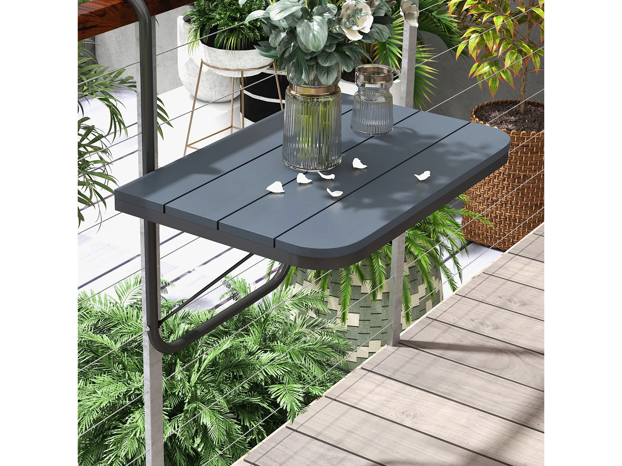 Table suspendue de balcon pliable dim. plateau 60L x 40l cm hauteur réglable 57-72H cm métal époxy noir