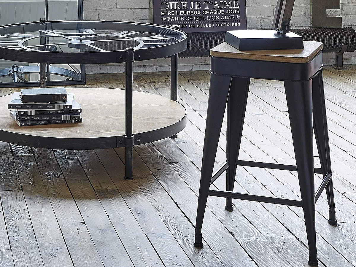 Tabouret industriel acier brillant et assise en bois massif marron Reko 60cm-Couleur Noir