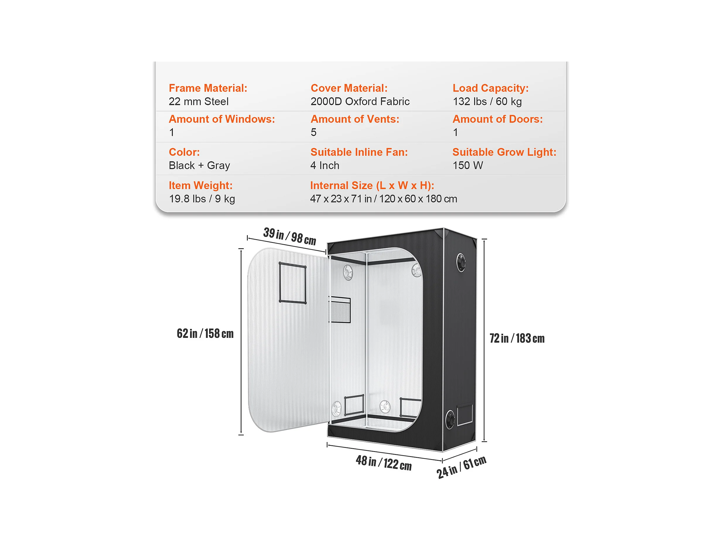 Tente de Culture SucceBuy Tente de Culture Intérieure Hydroponique Grow Tent 122 x 61 x 183 cm avec Fenêtre et Plateau