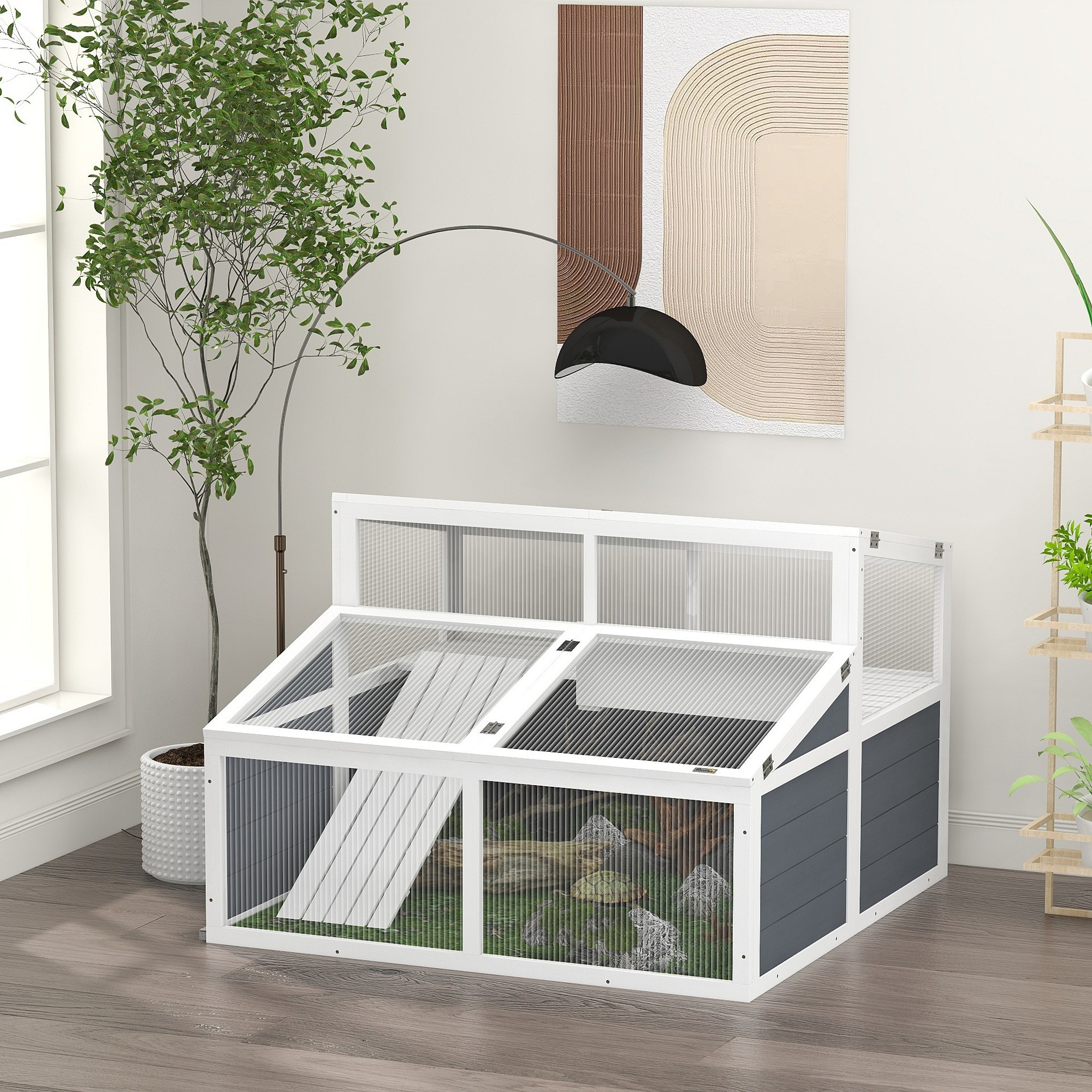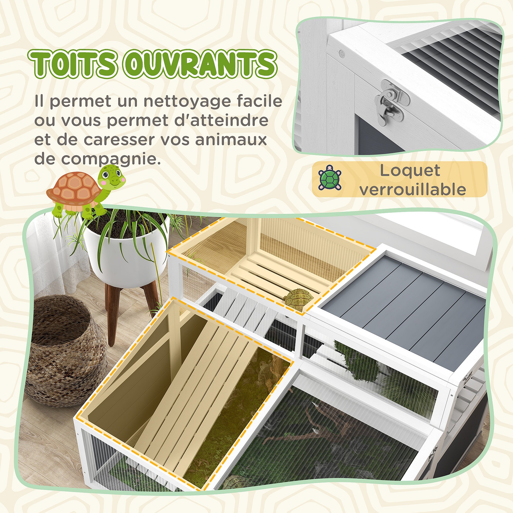 Terrarium enclos tortue 2 espaces toit polycarbonate 3 portes rampe bois gris blanc