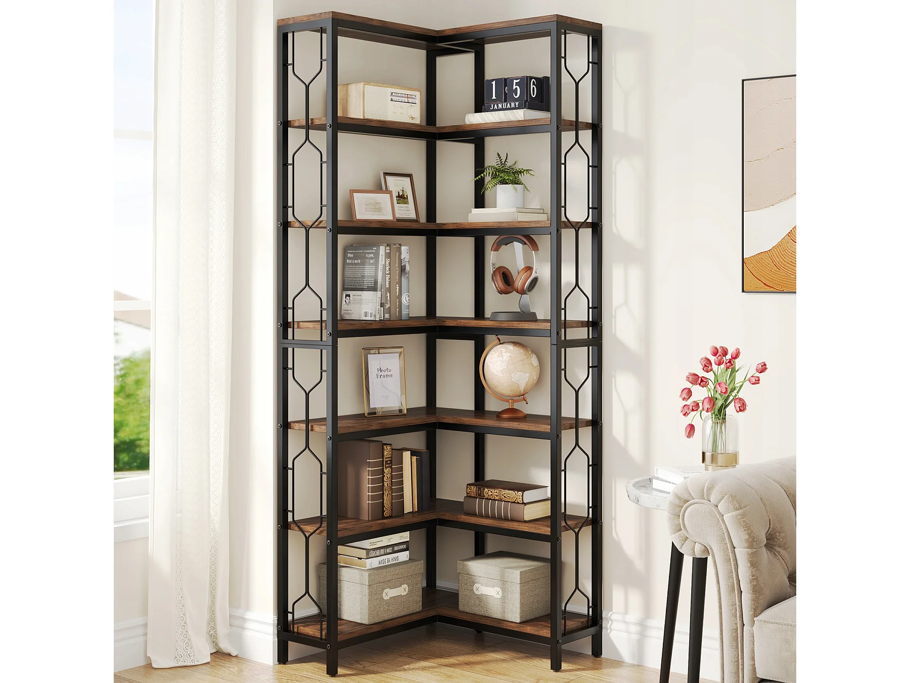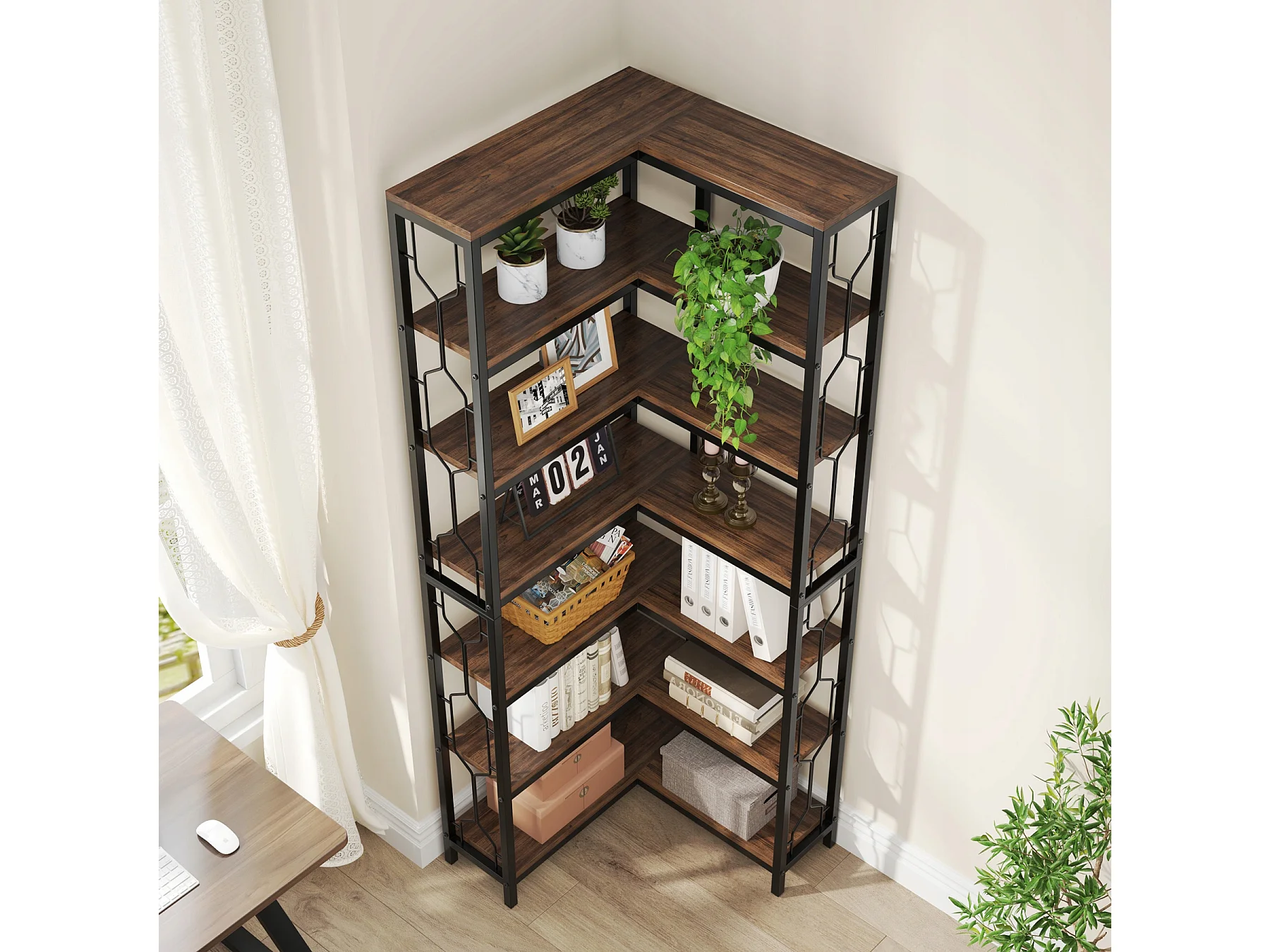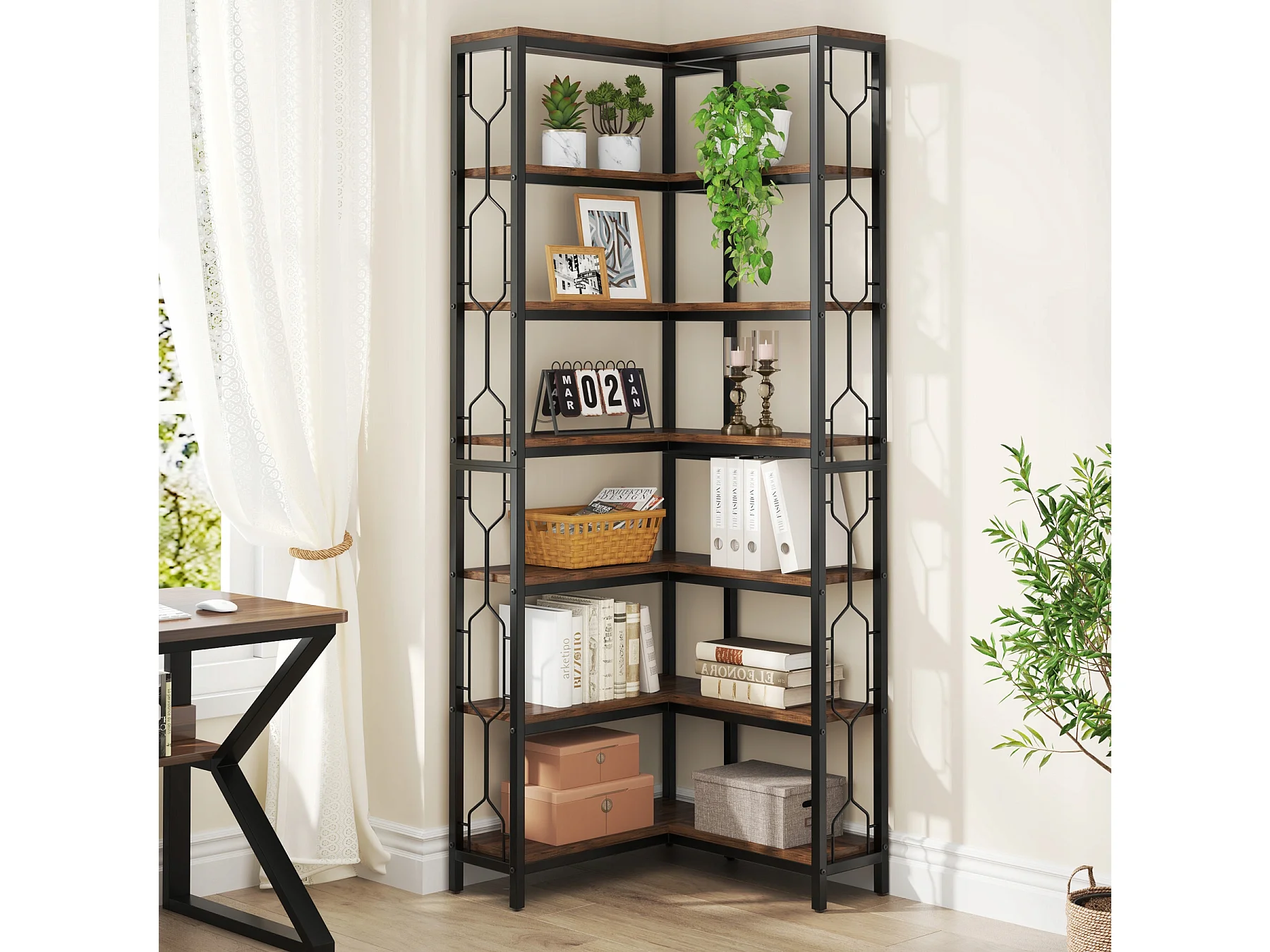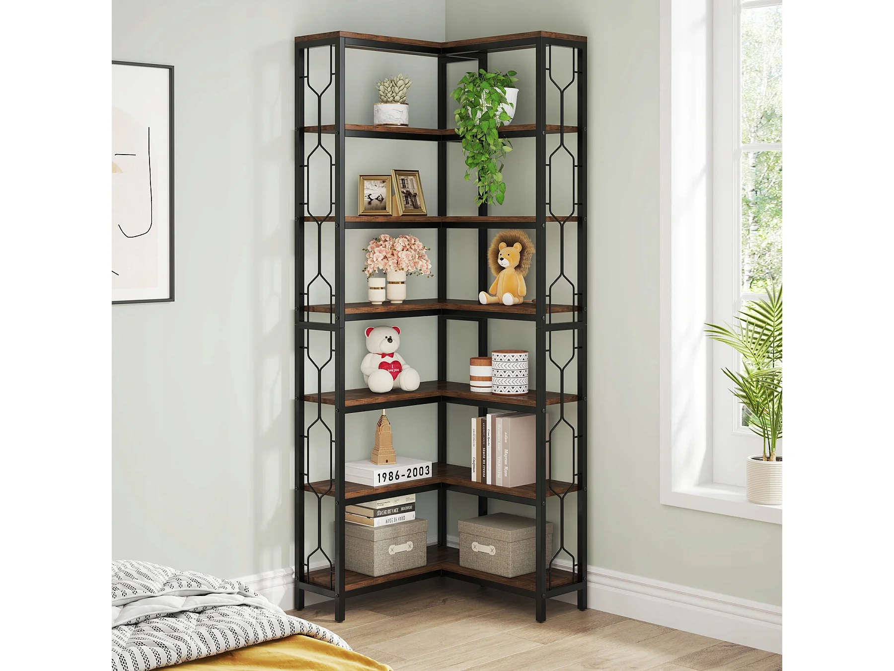 Bibliothèque d'angle, étagère Industrielle à 7 Niveaux, étagères d'angle en Bois et Métal, étagère d'affichage autoportante pour Le Salon