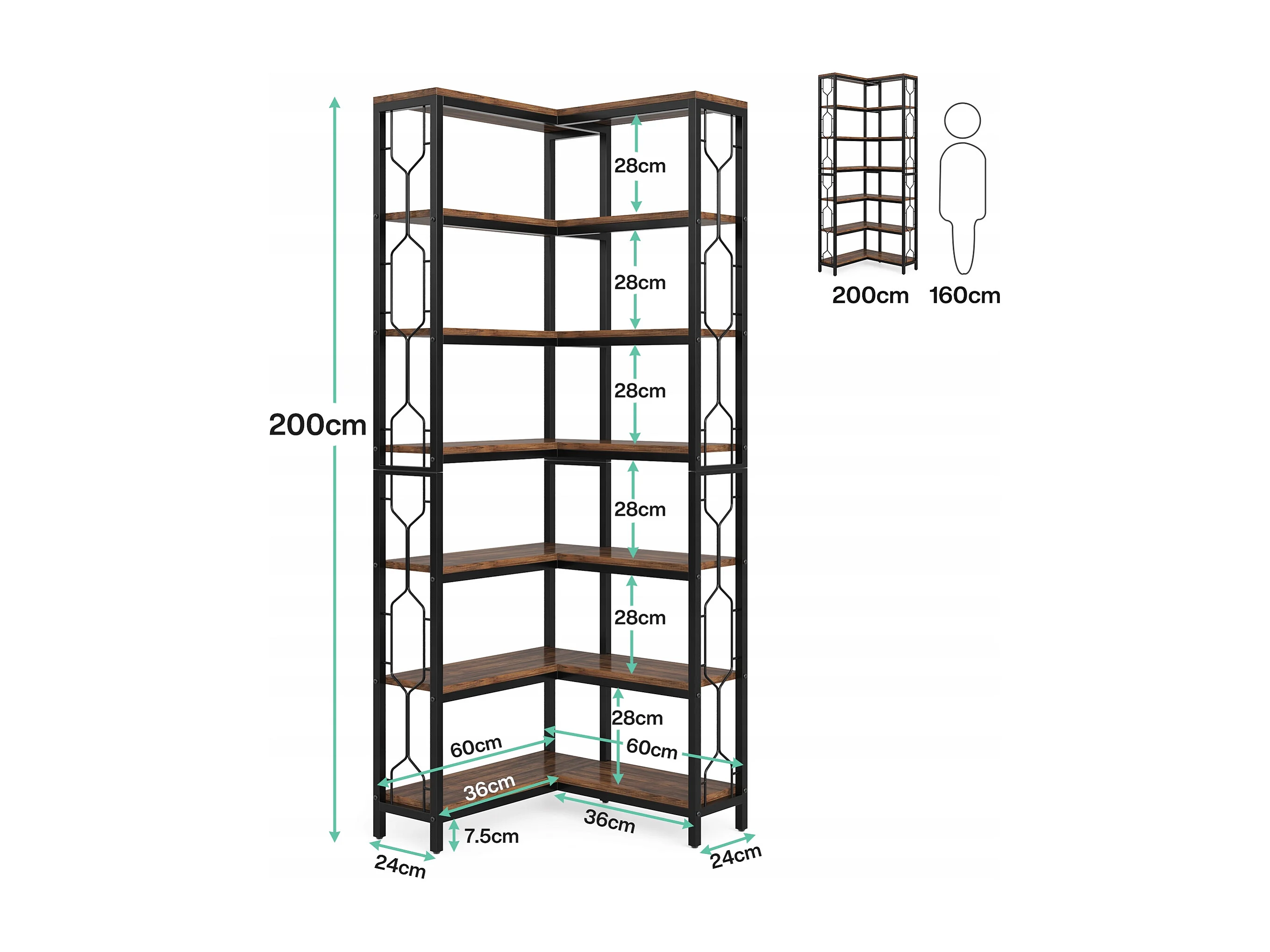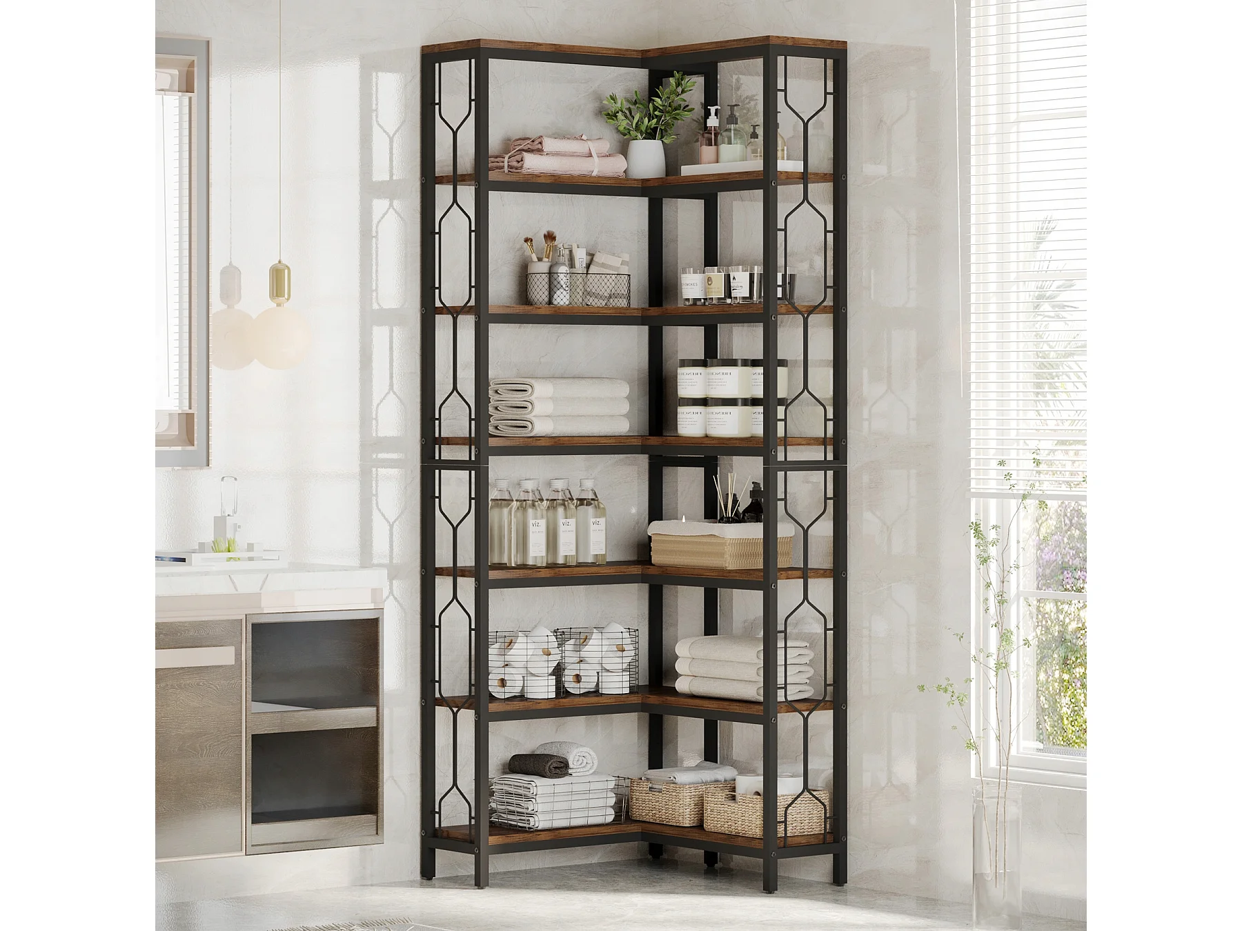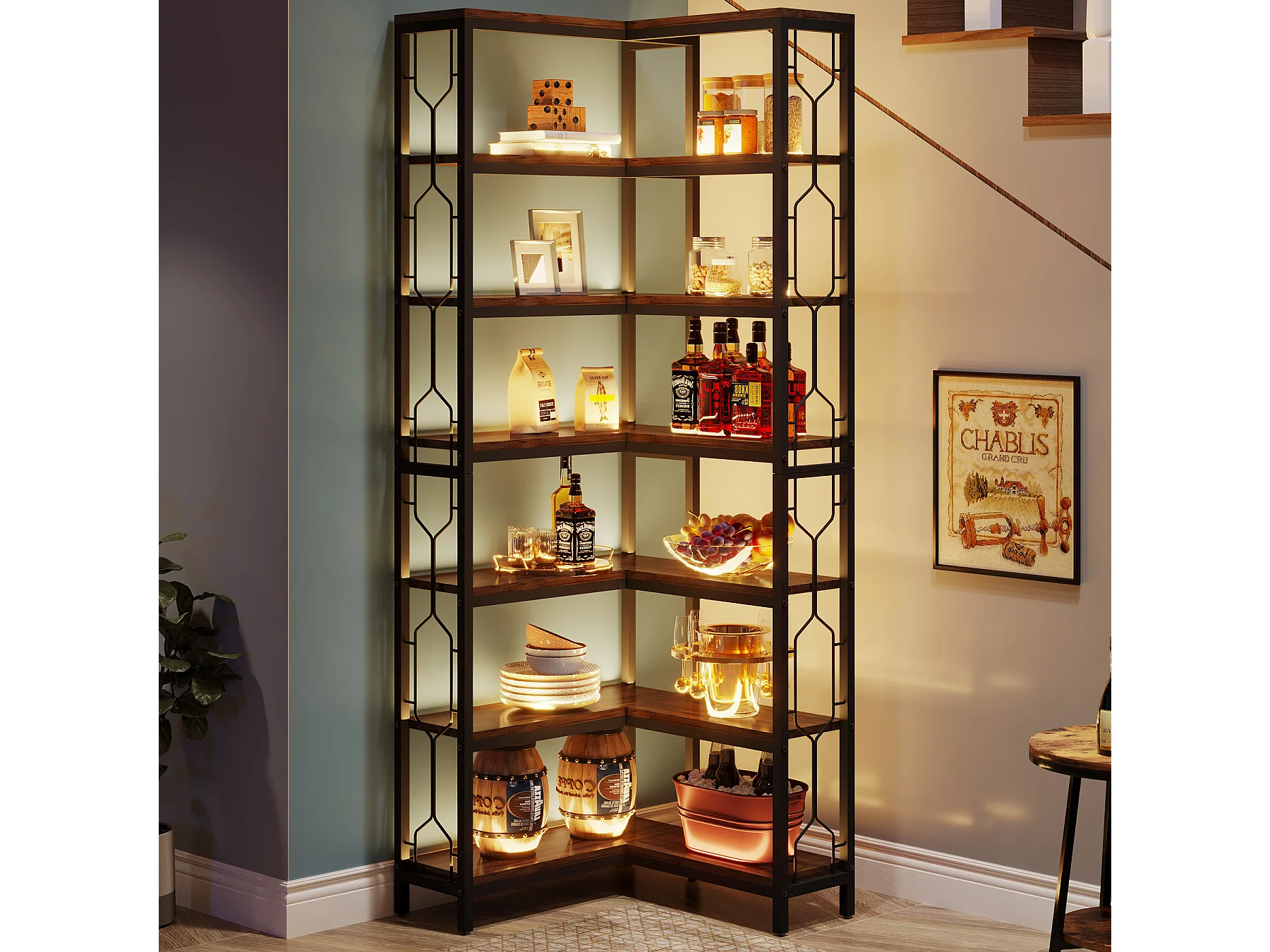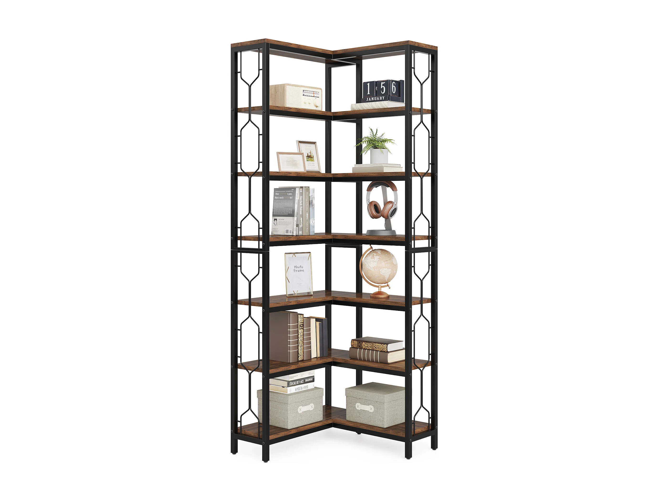 Bibliothèque d'angle, étagère Industrielle à 7 Niveaux, étagères d'angle en Bois et Métal, étagère d'affichage autoportante pour Le Salon