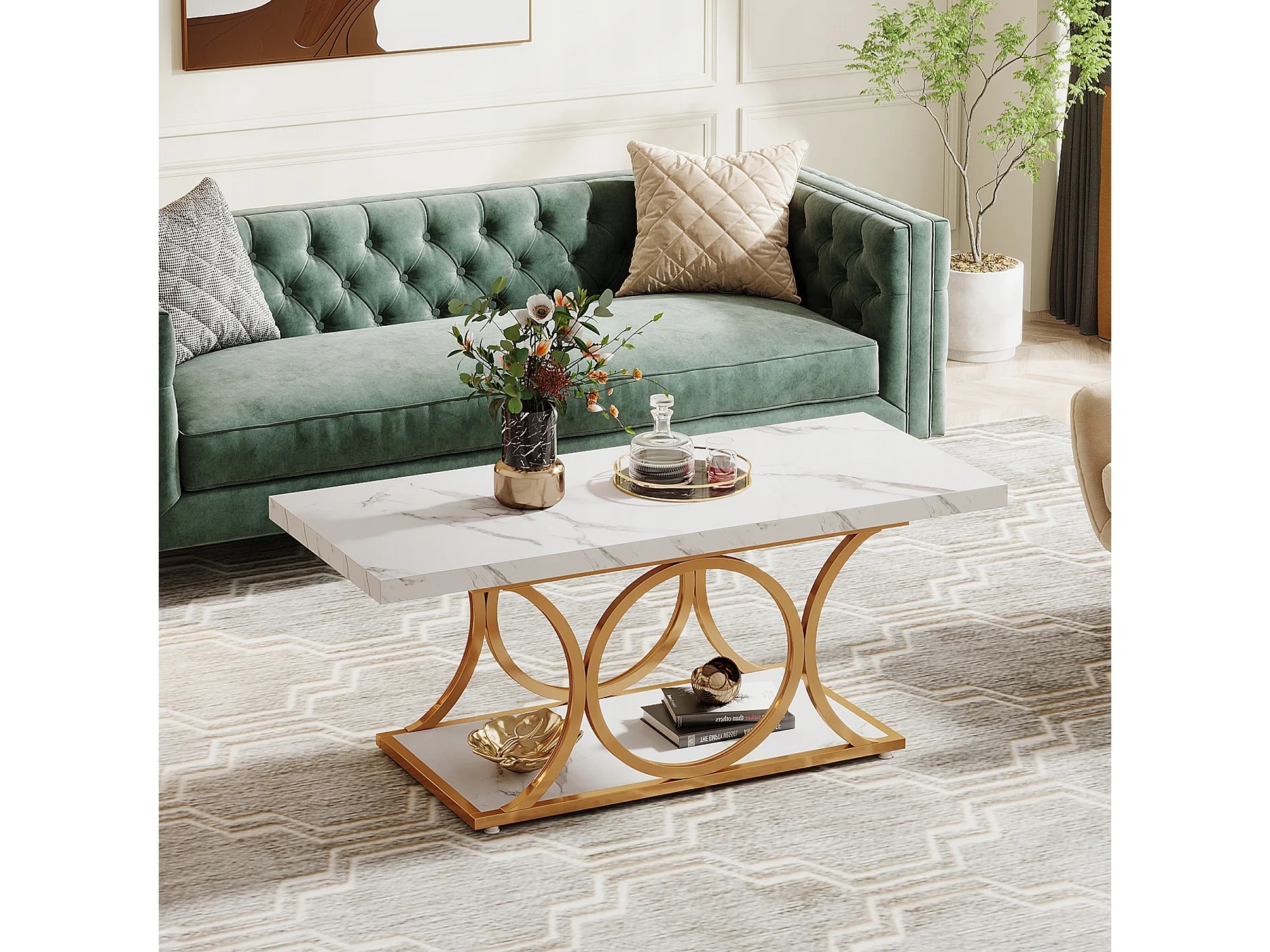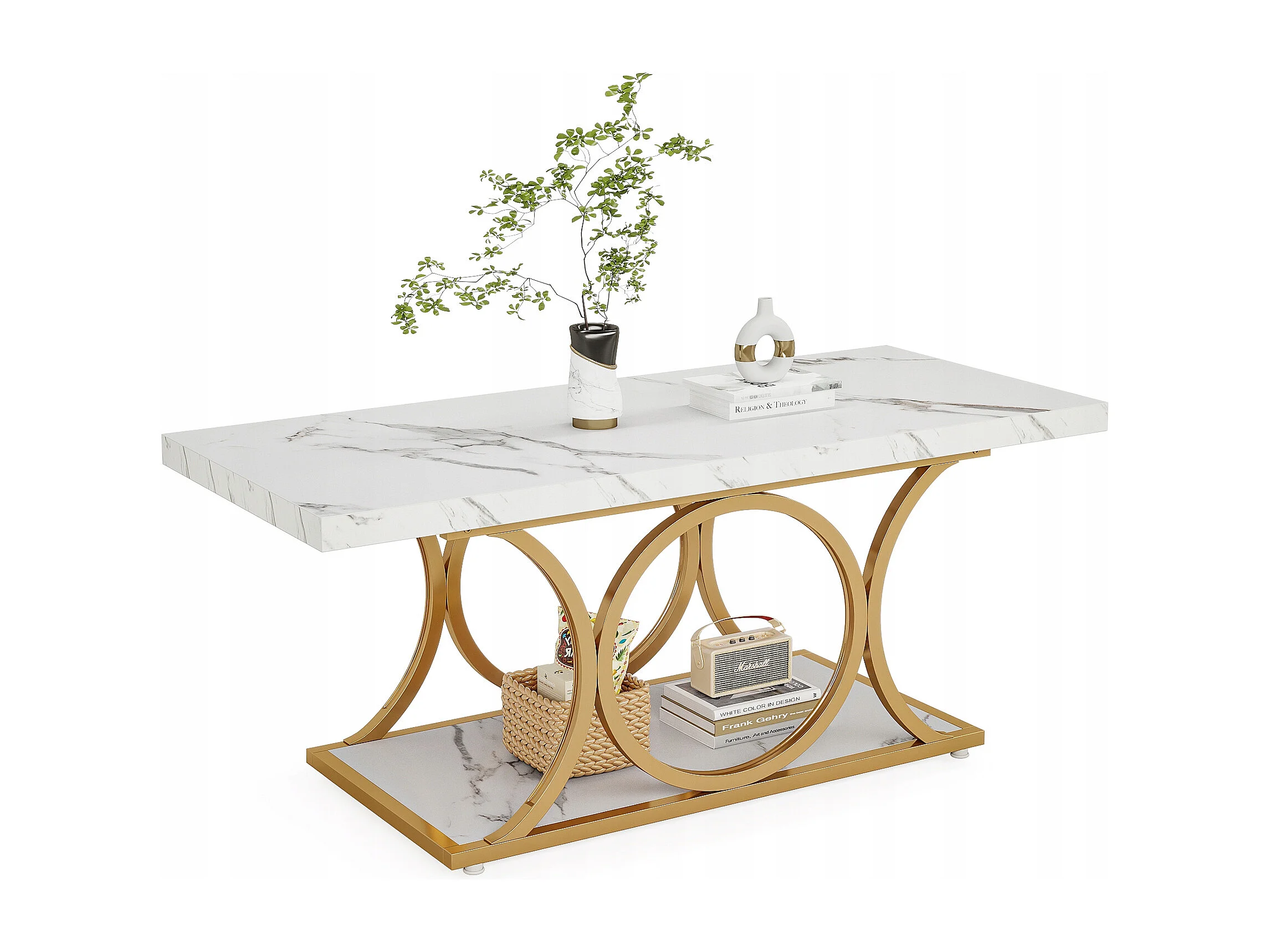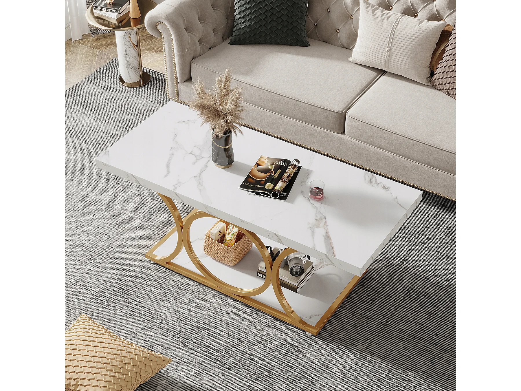 Table basse moderne pour le salon, table basse à 2 niveaux en bois imitation marbre avec pieds géométriques en métal
