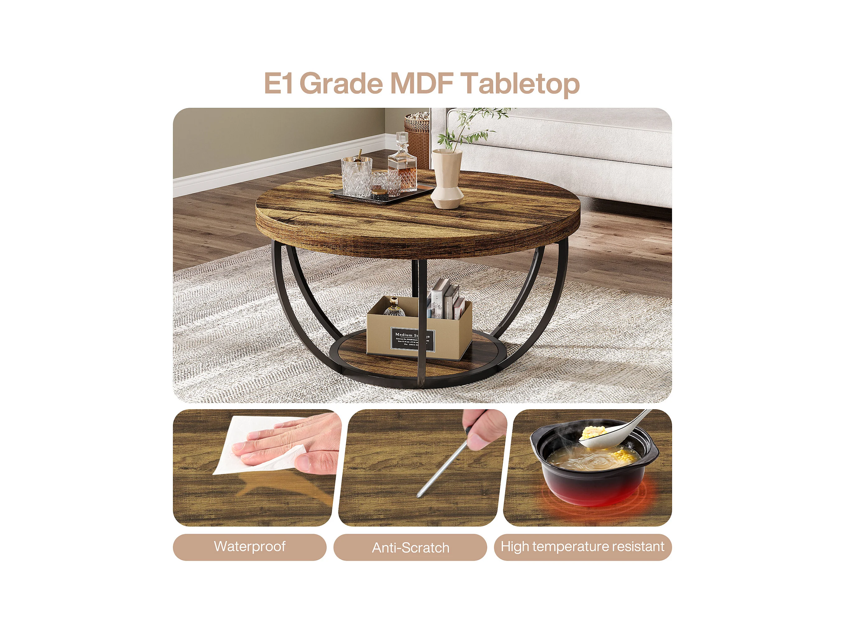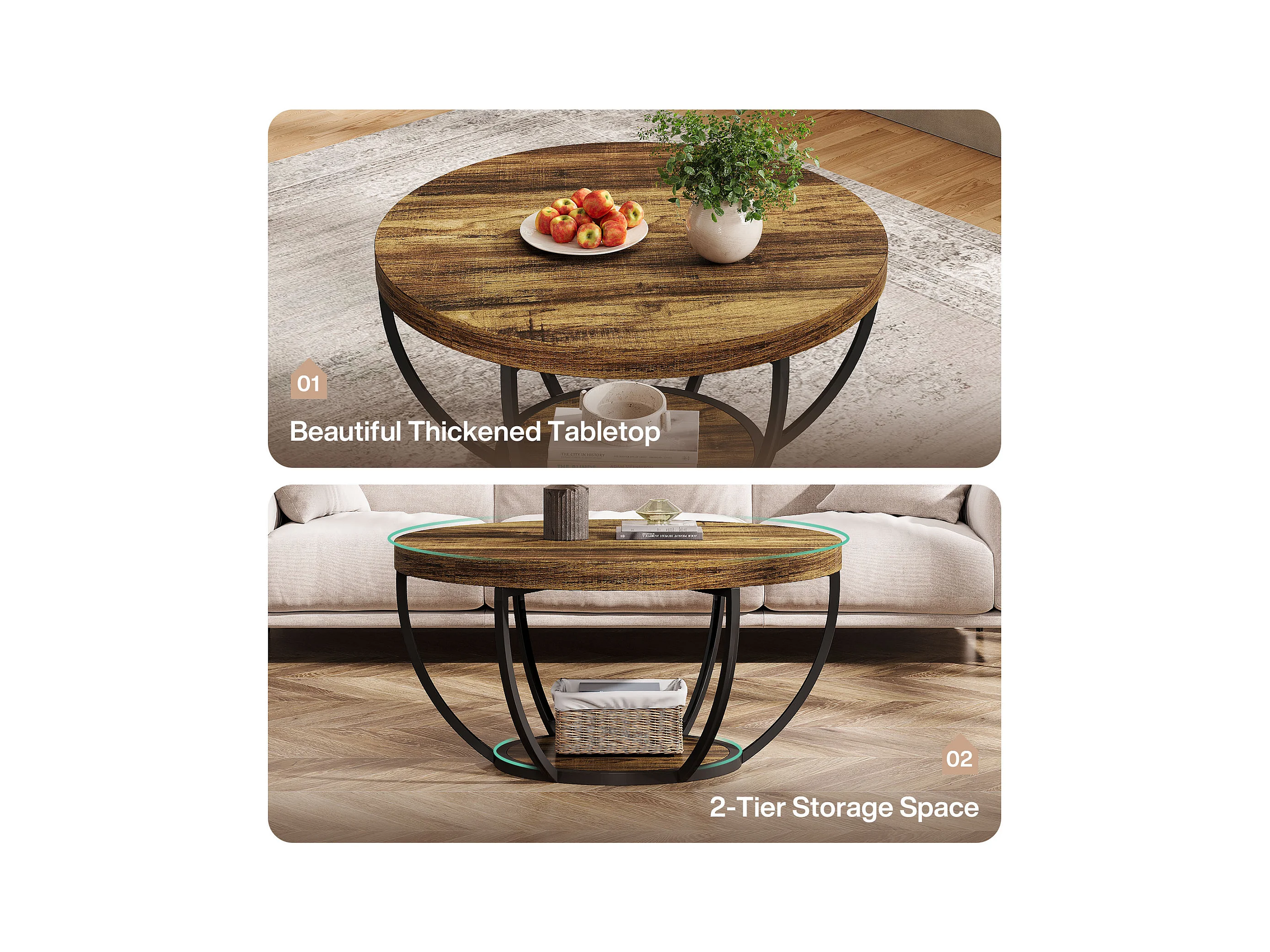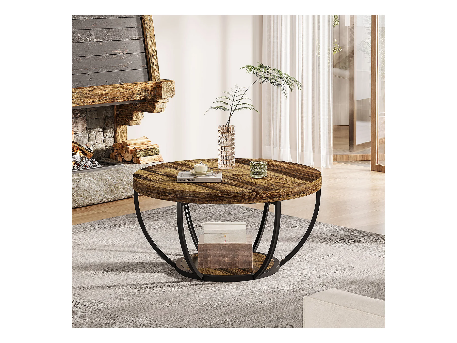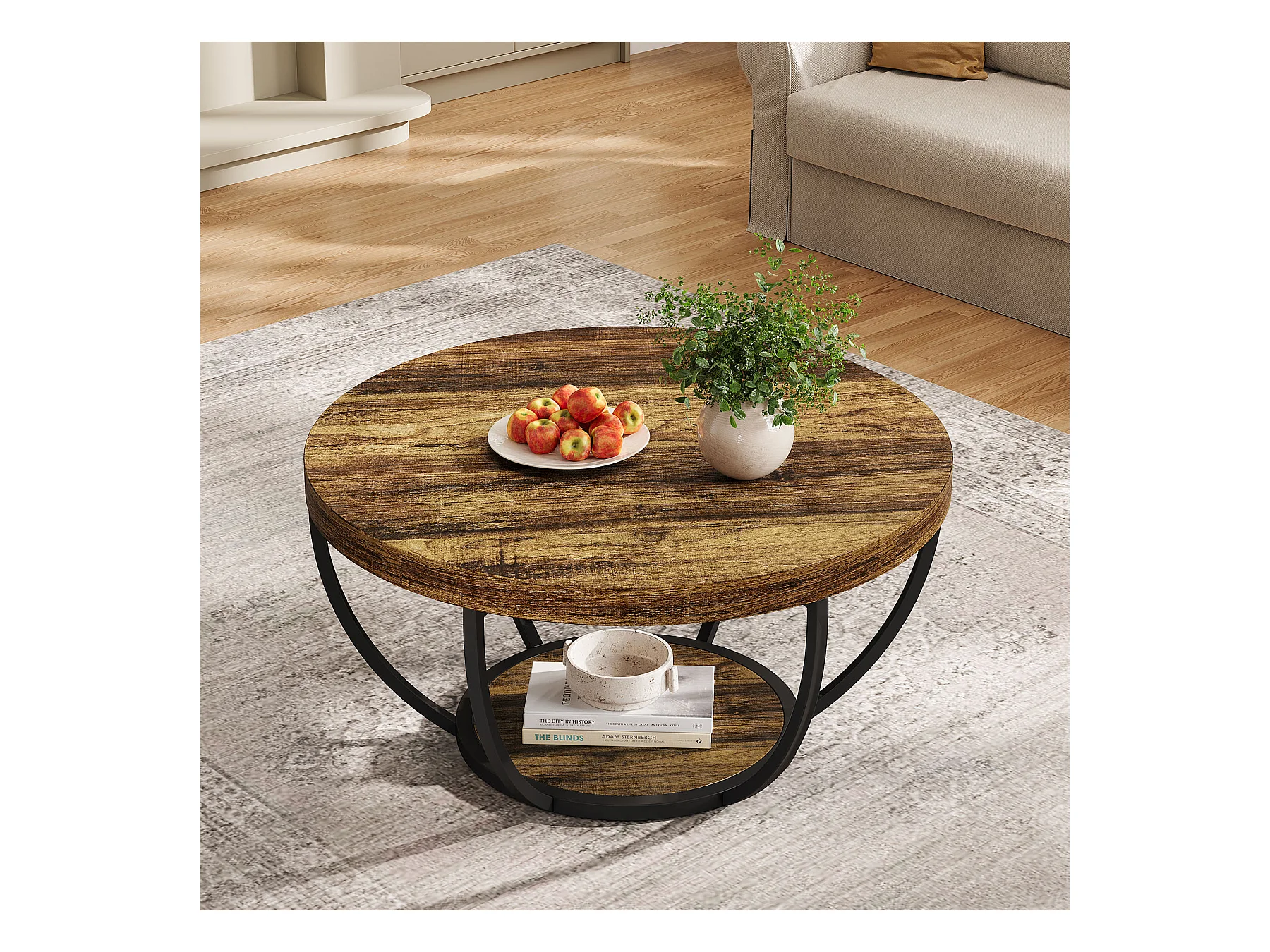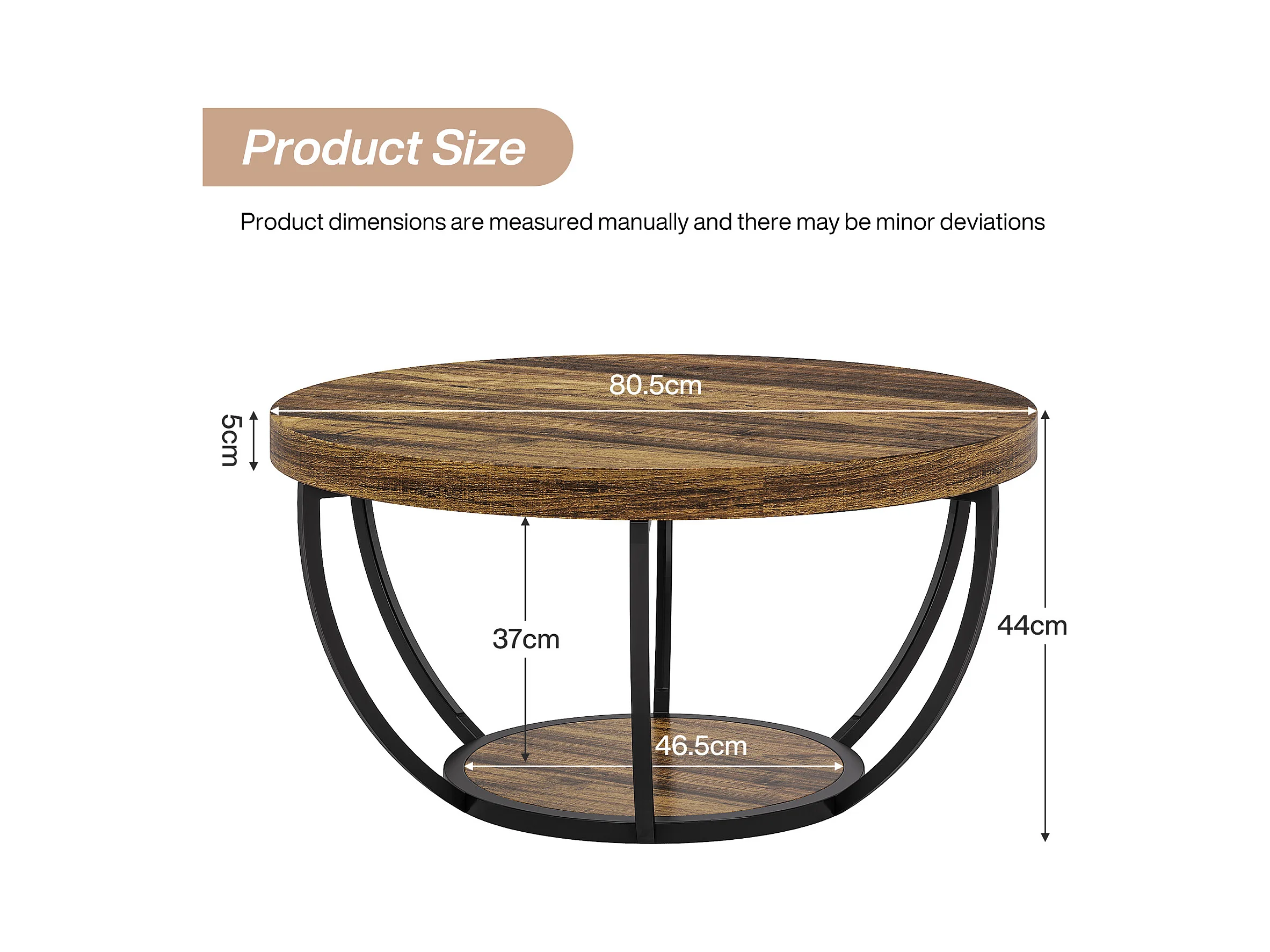Table basse ronde industrielle à 2 niveaux avec étagères de rangement, table centrale moderne en bois de 80 cm