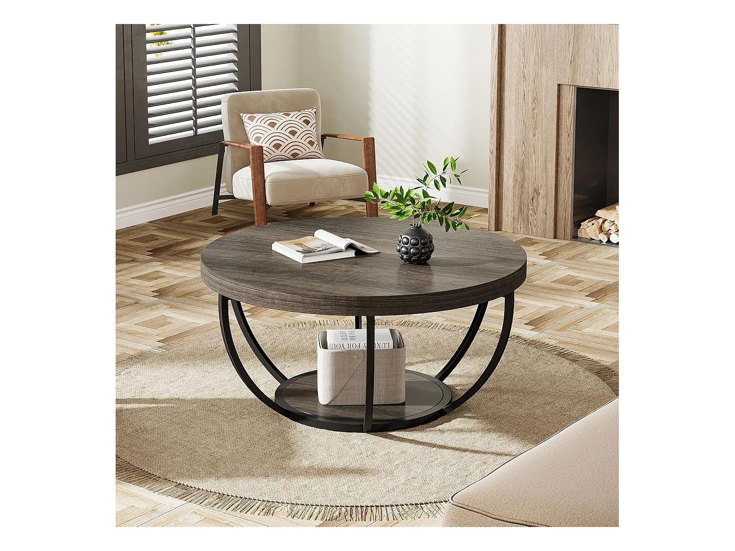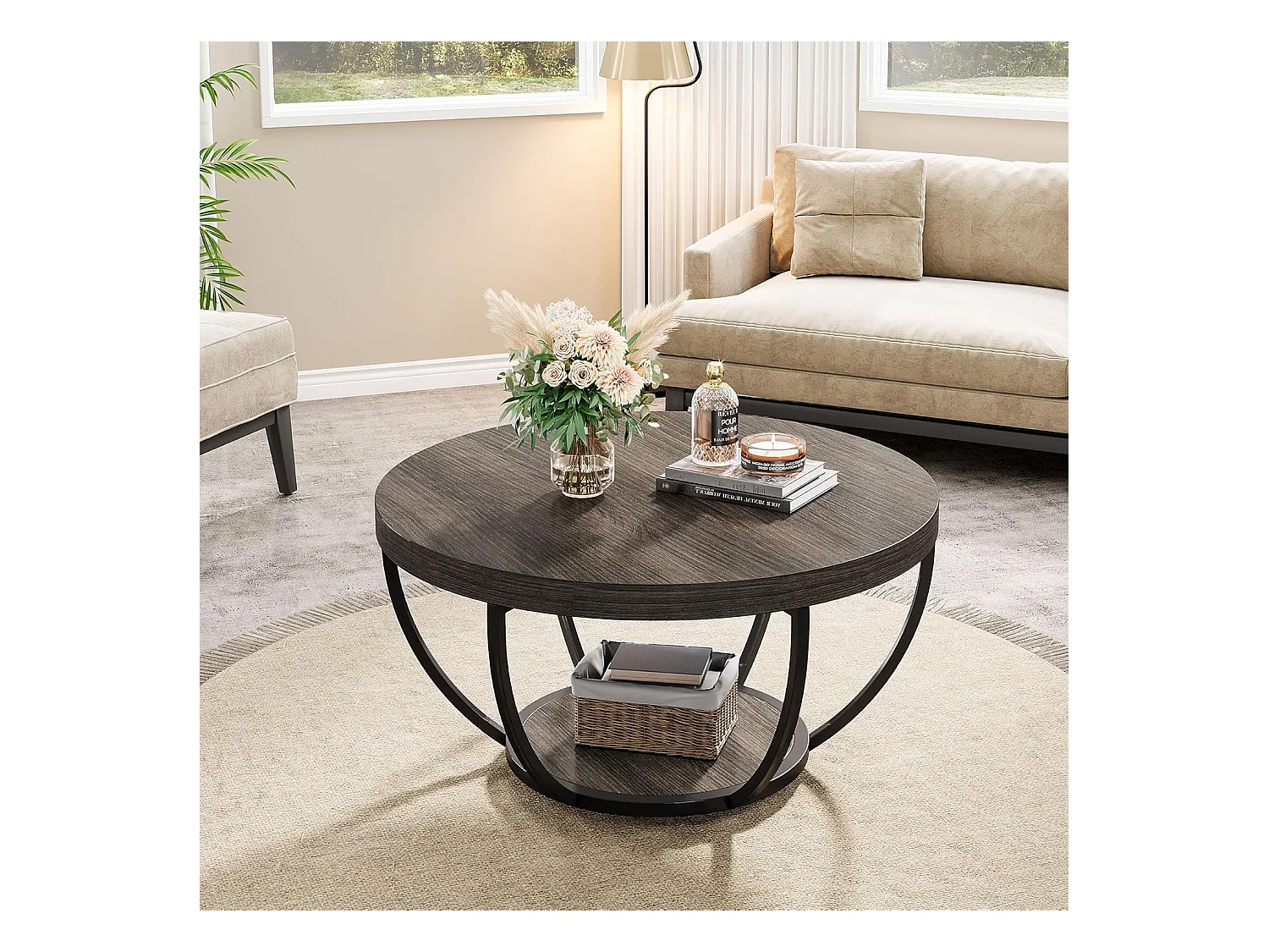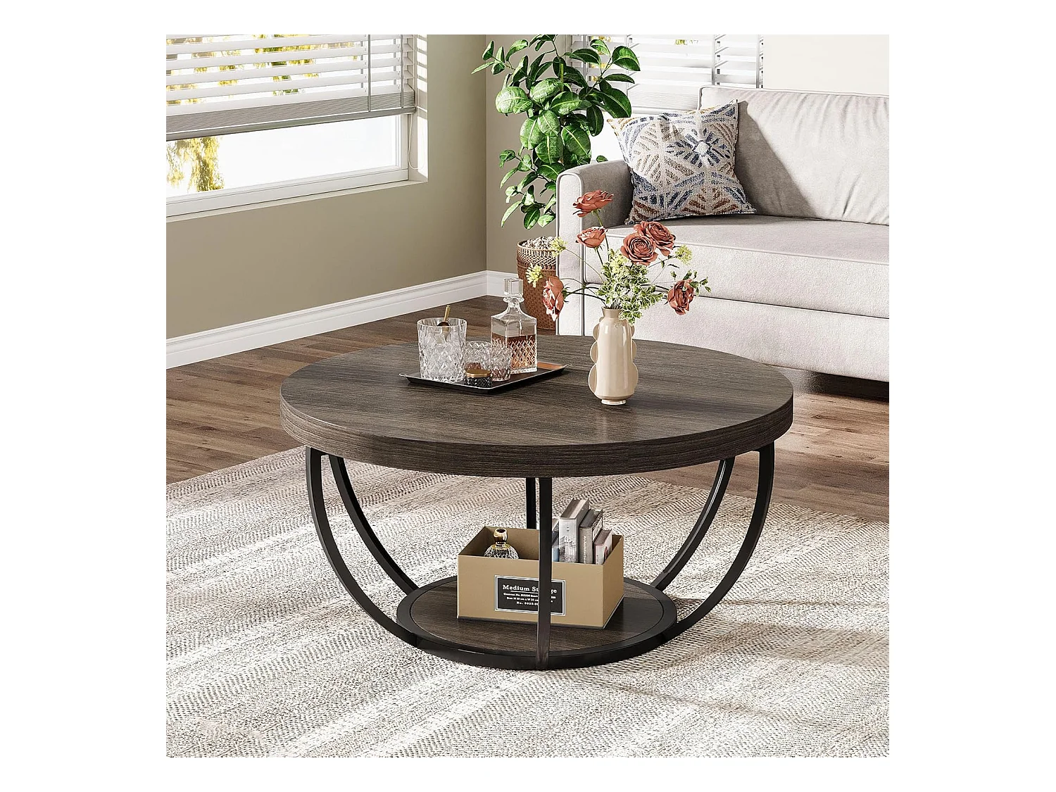 Table basse ronde, table basse industrielle à 2 niveaux avec étagères de rangement, accent moderne en bois central