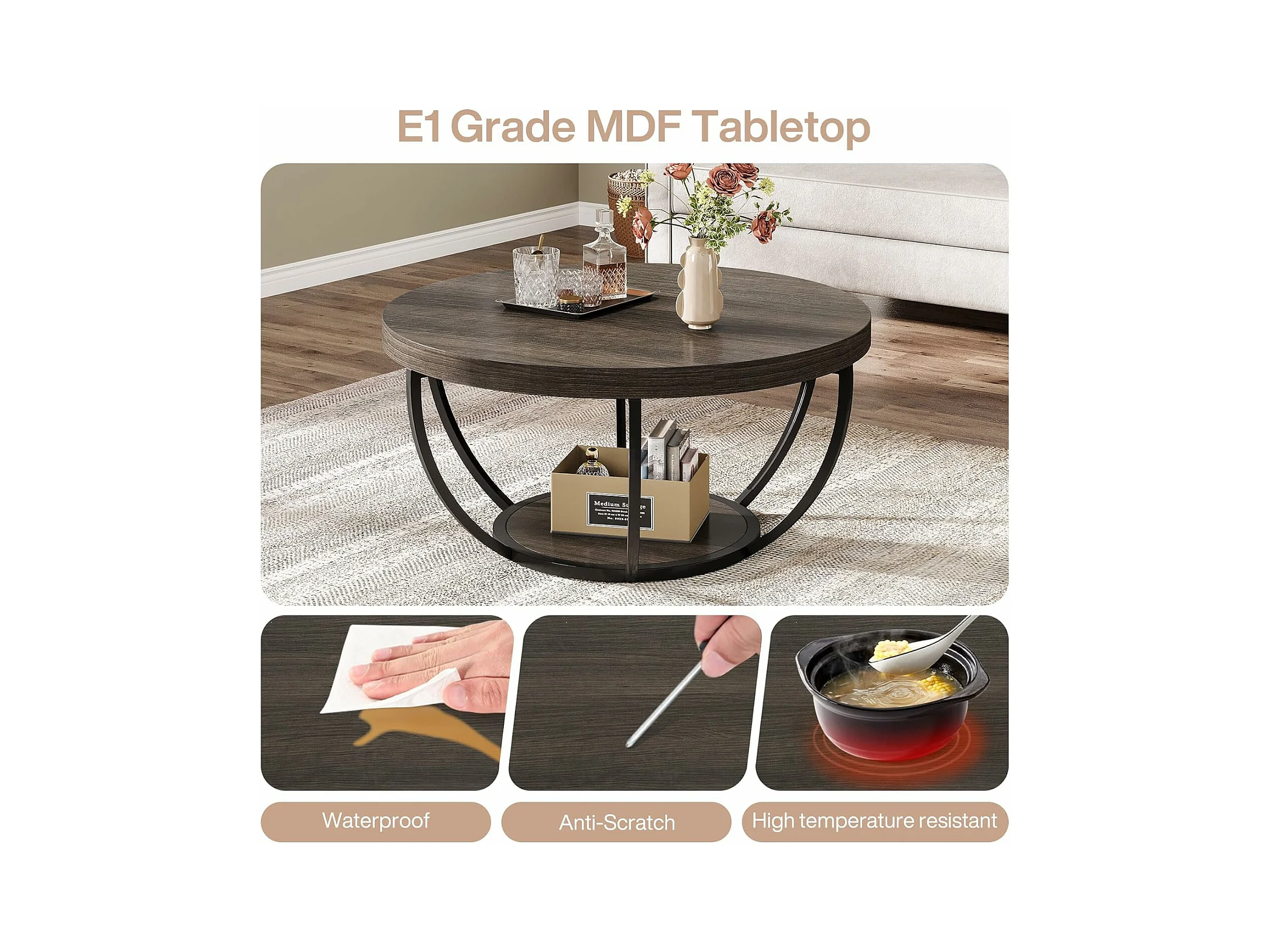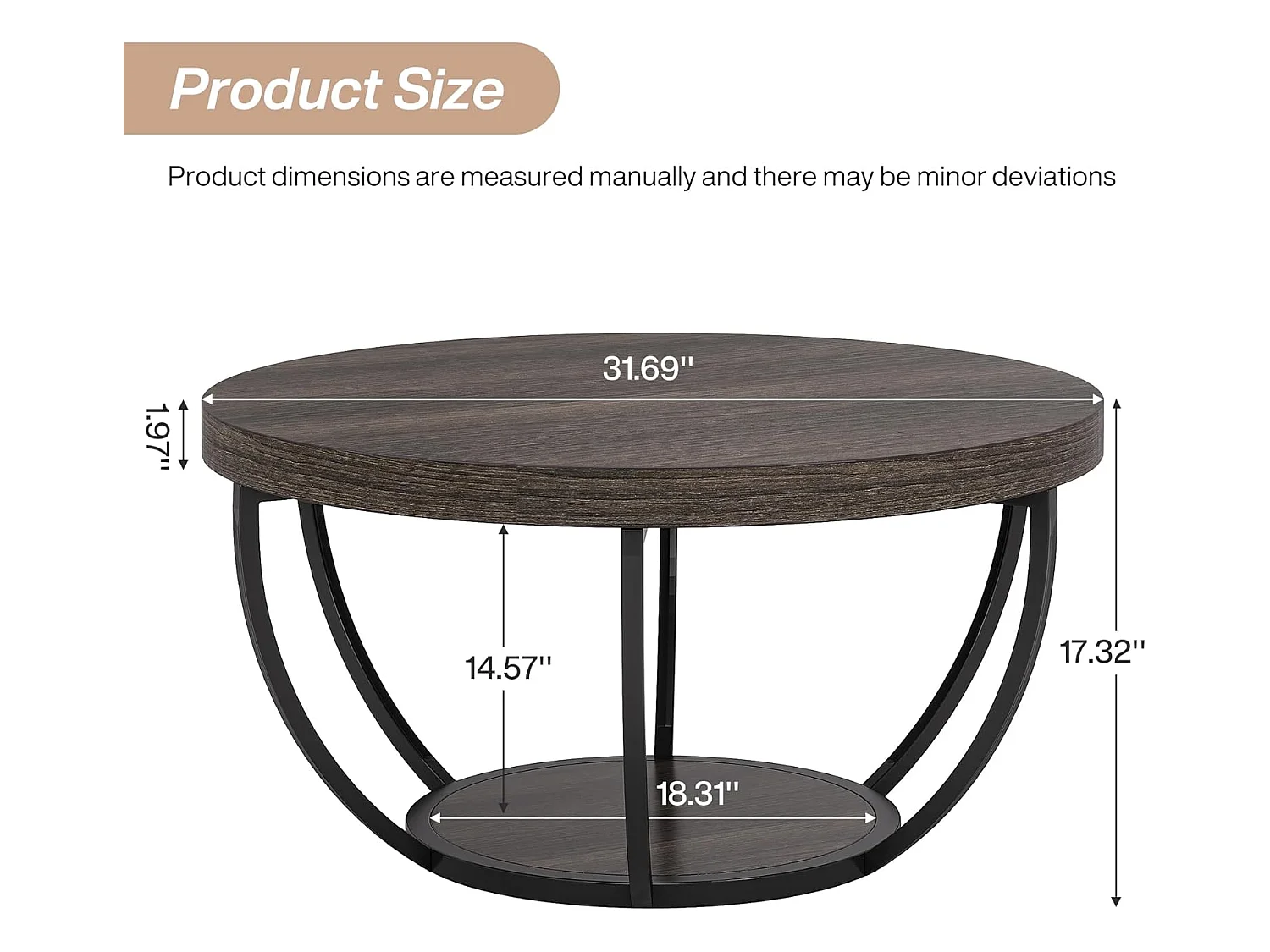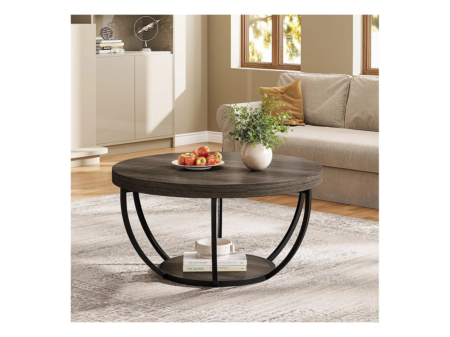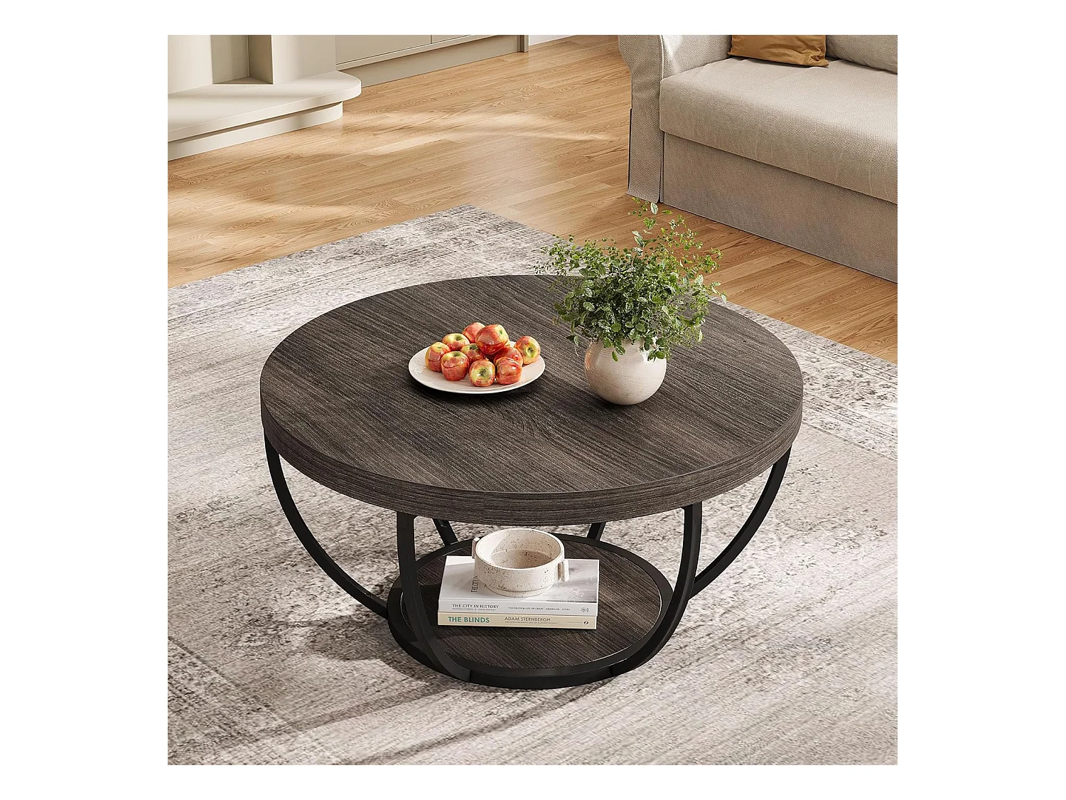 Table basse ronde, table basse industrielle à 2 niveaux avec étagères de rangement, accent moderne en bois central