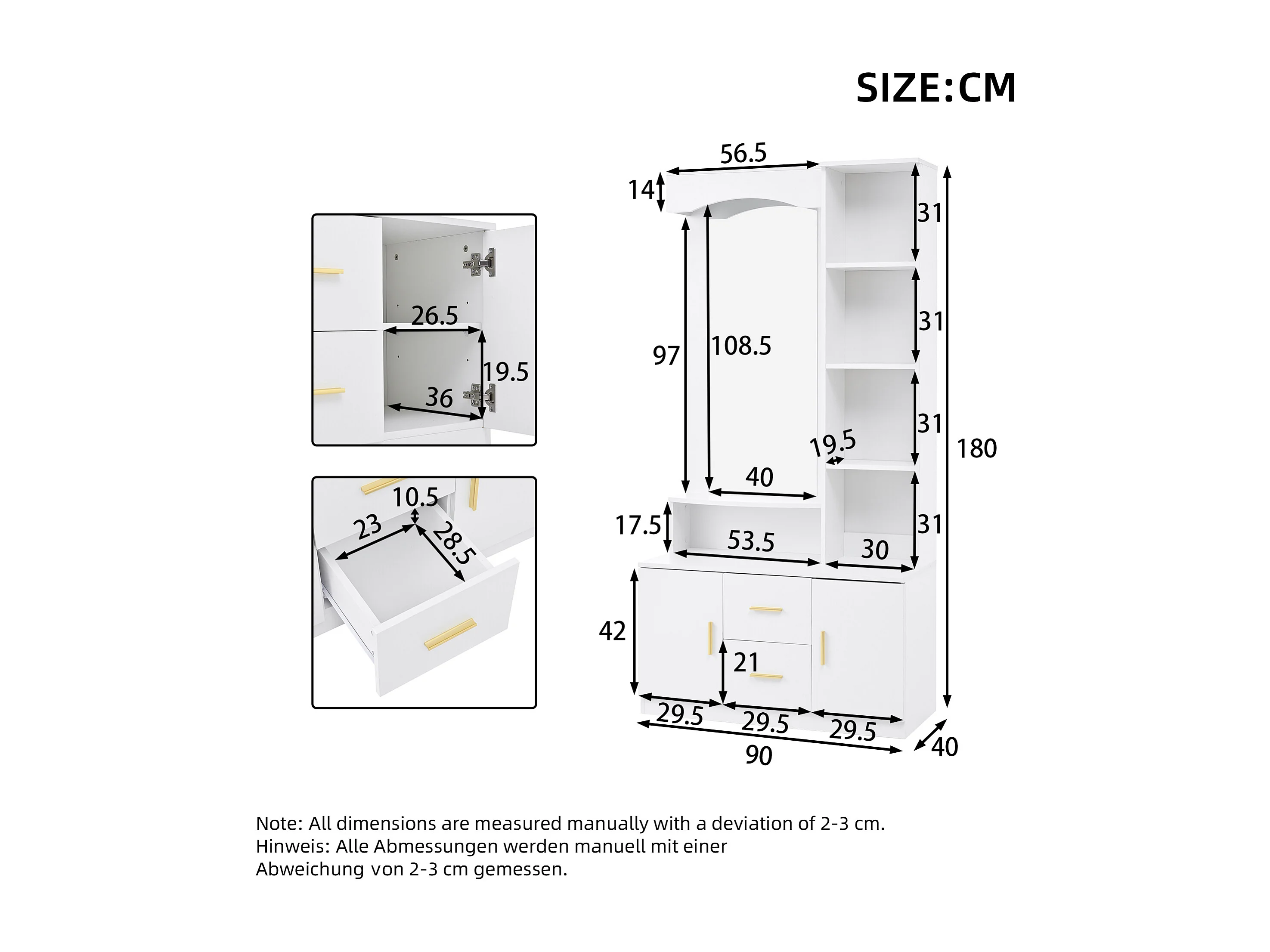 Ensemble vestiaire d'entrée 90x40x180cm - avec meuble à chaussures et miroir - 2 tiroirs et 2 portes - avec étagères - Blanc