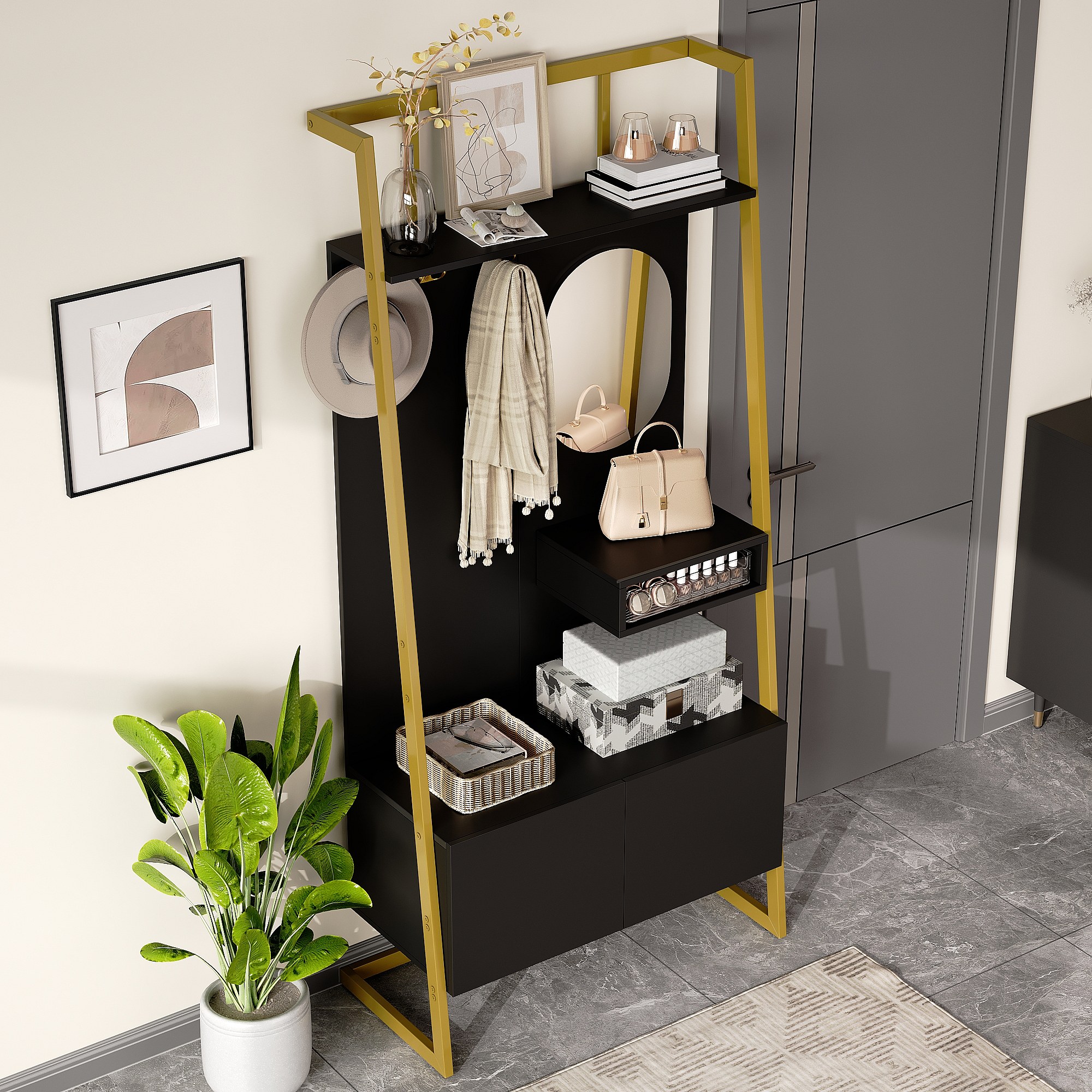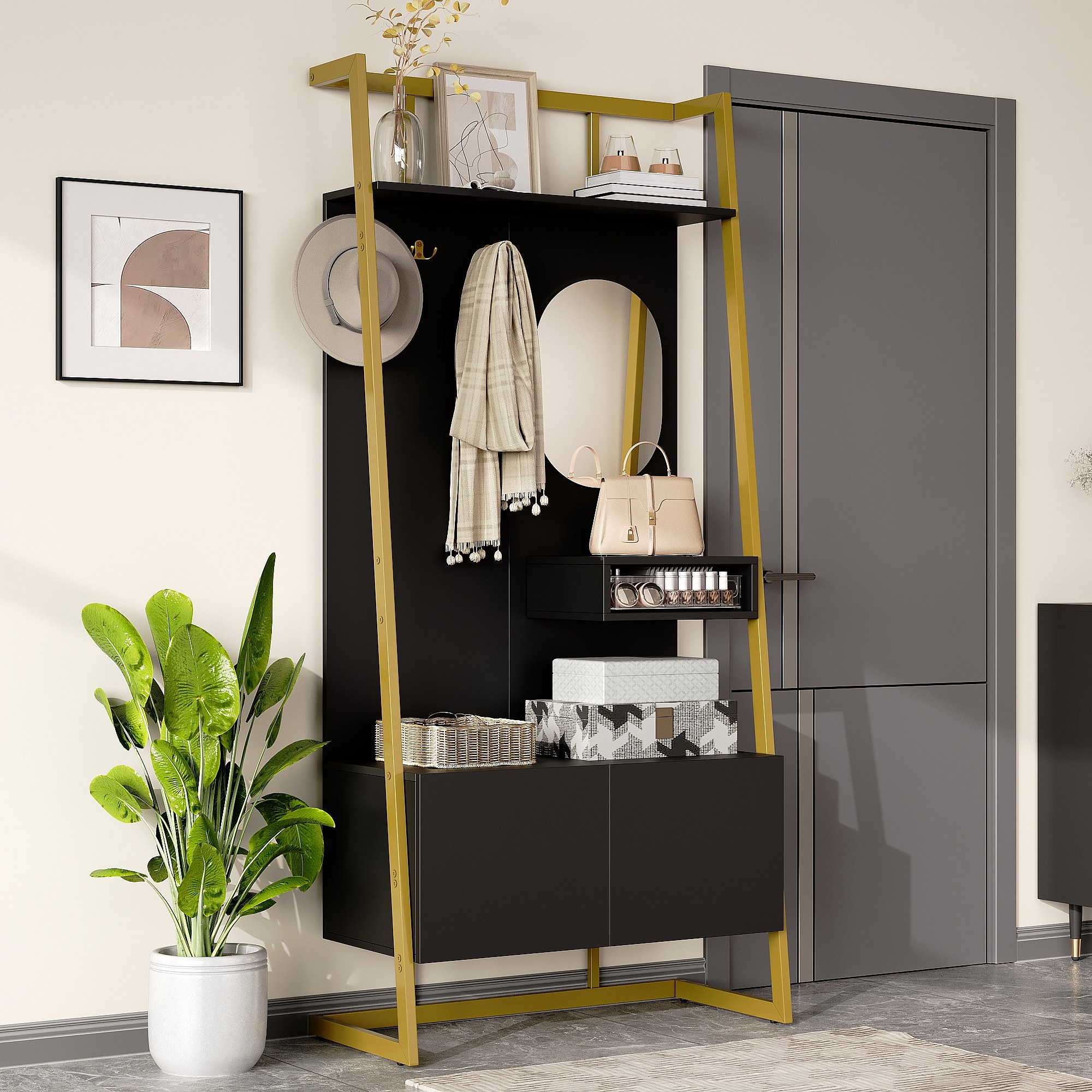 Vestiaire/armoire de rangement avec miroir + meubles de chaussures - crochets en métal - 78 x 38.5 x 180.5 cm - MDF - noir