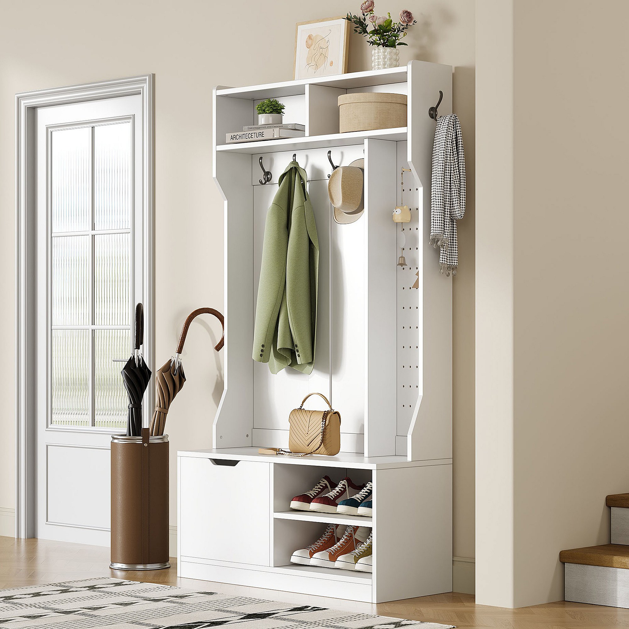 Vestiaire/porte-manteau 7 en 1 avec banc à chaussures + 7 crochets + porte + 2 tiroirs - aggloméré - blanc