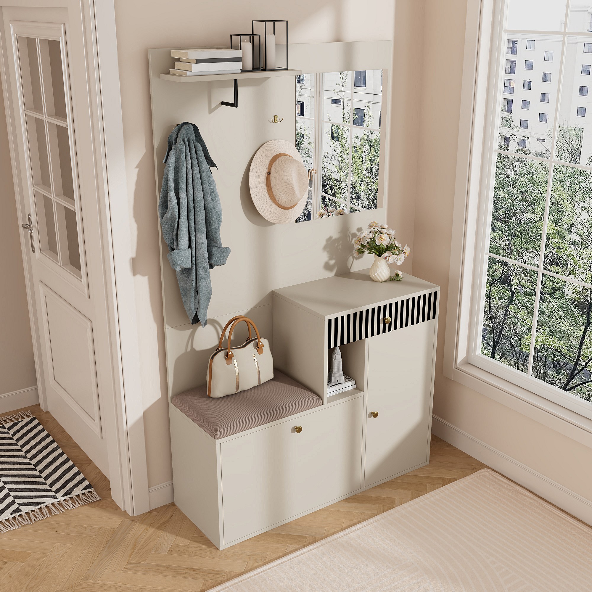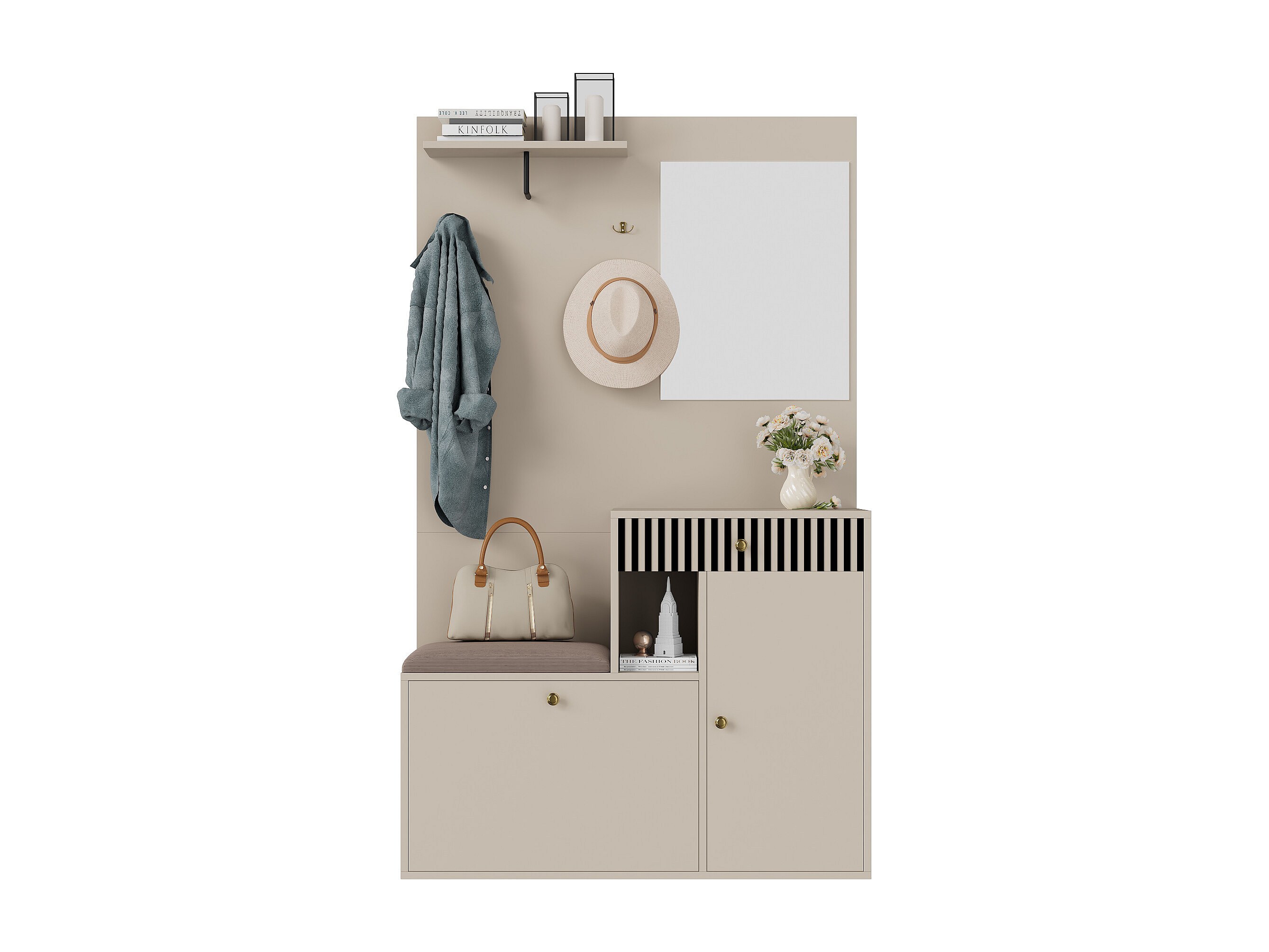 Vestiaire avec miroir + coussins + meuble de chaussures - 110 x 37 x 185.5 cm - MDF - beige