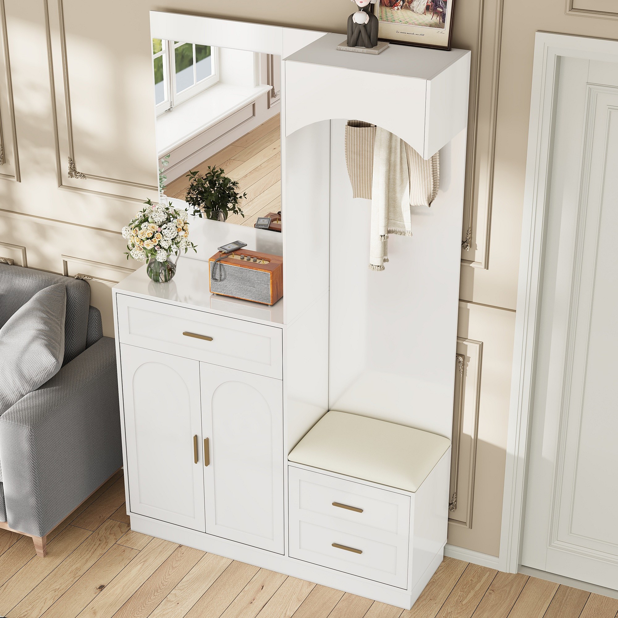 Ensemble de penderie 4 pièces avec miroir + 2 étagères à chapeaux + meuble à chaussures brillant - aggloméré - blanc