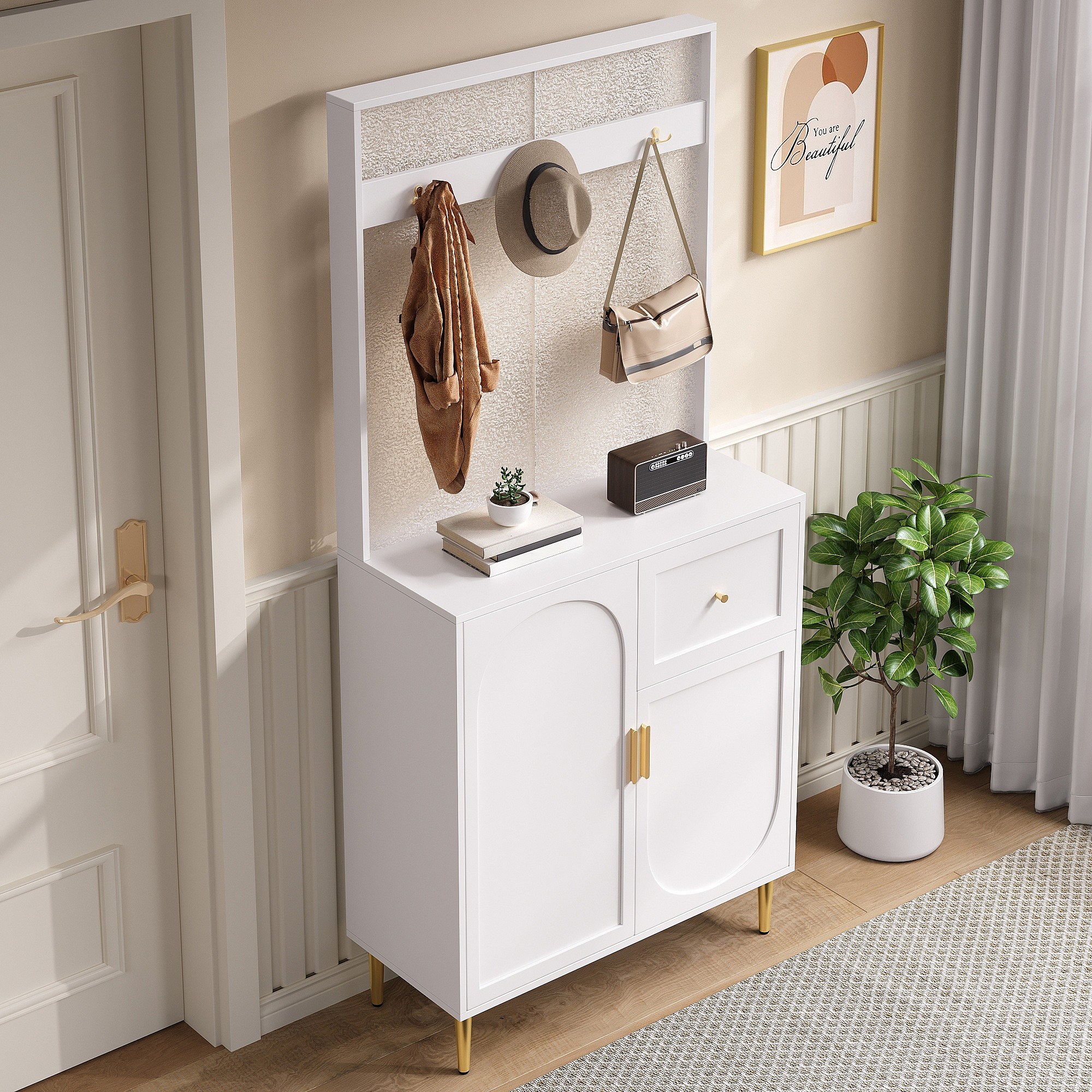Vestiaire/porte-manteau 7 en 1 avec banc à chaussures + 7 crochets + porte + 2 tiroirs - aggloméré - blanc