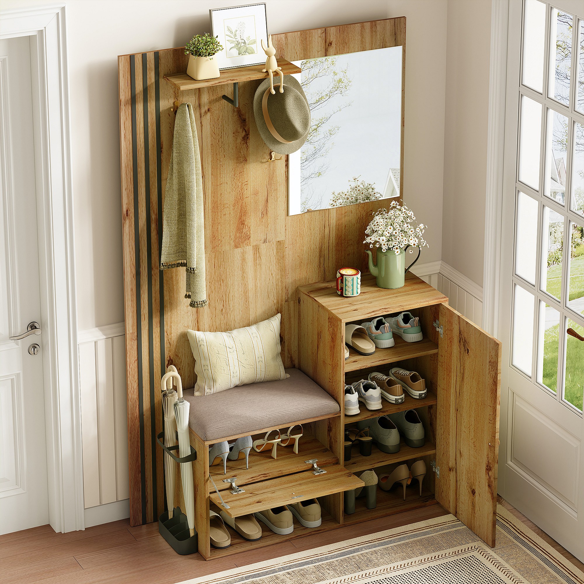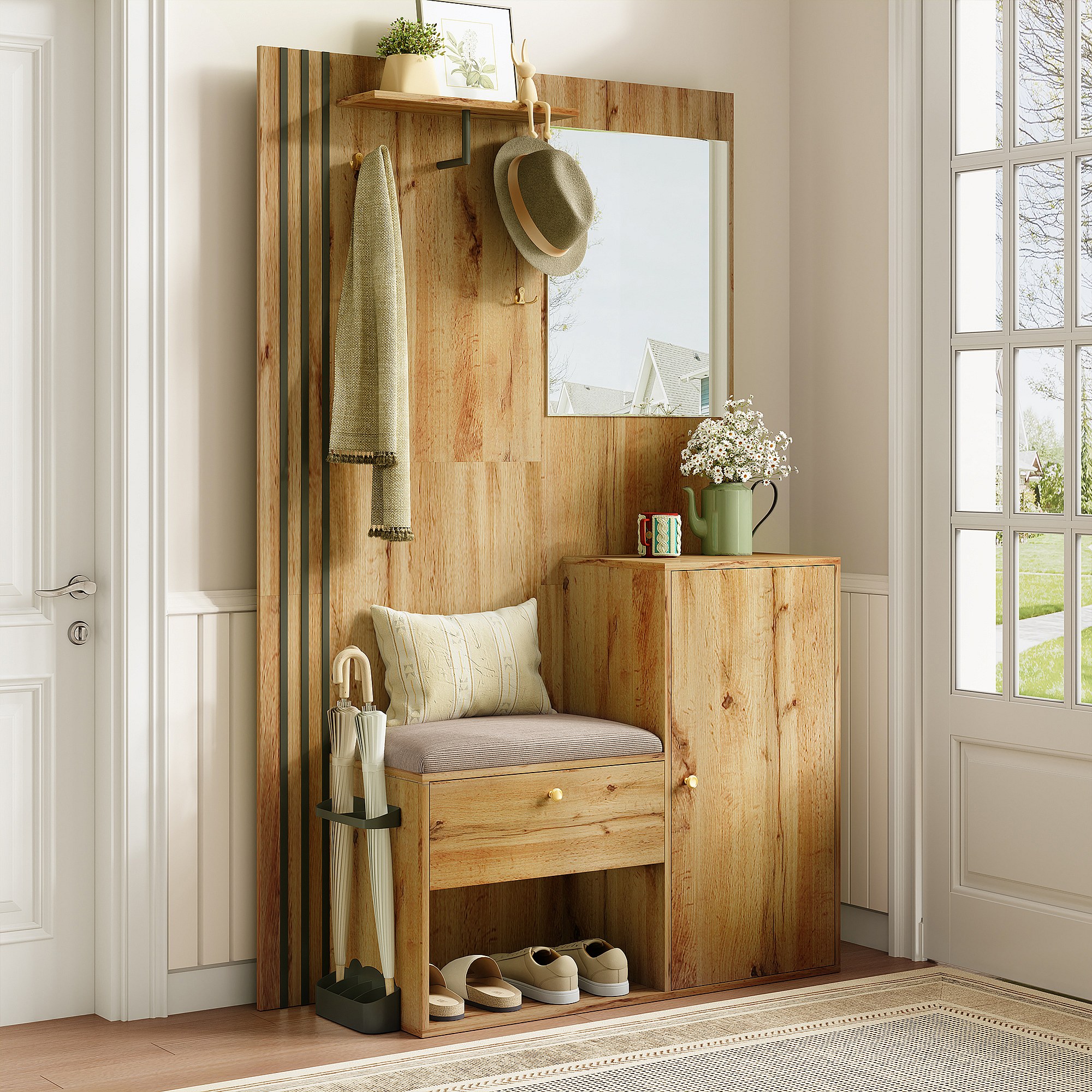 Vestiaire avec miroir + coussins + meuble de chaussures - 110 x 37 x 185.5 cm cm - MDF - naturel