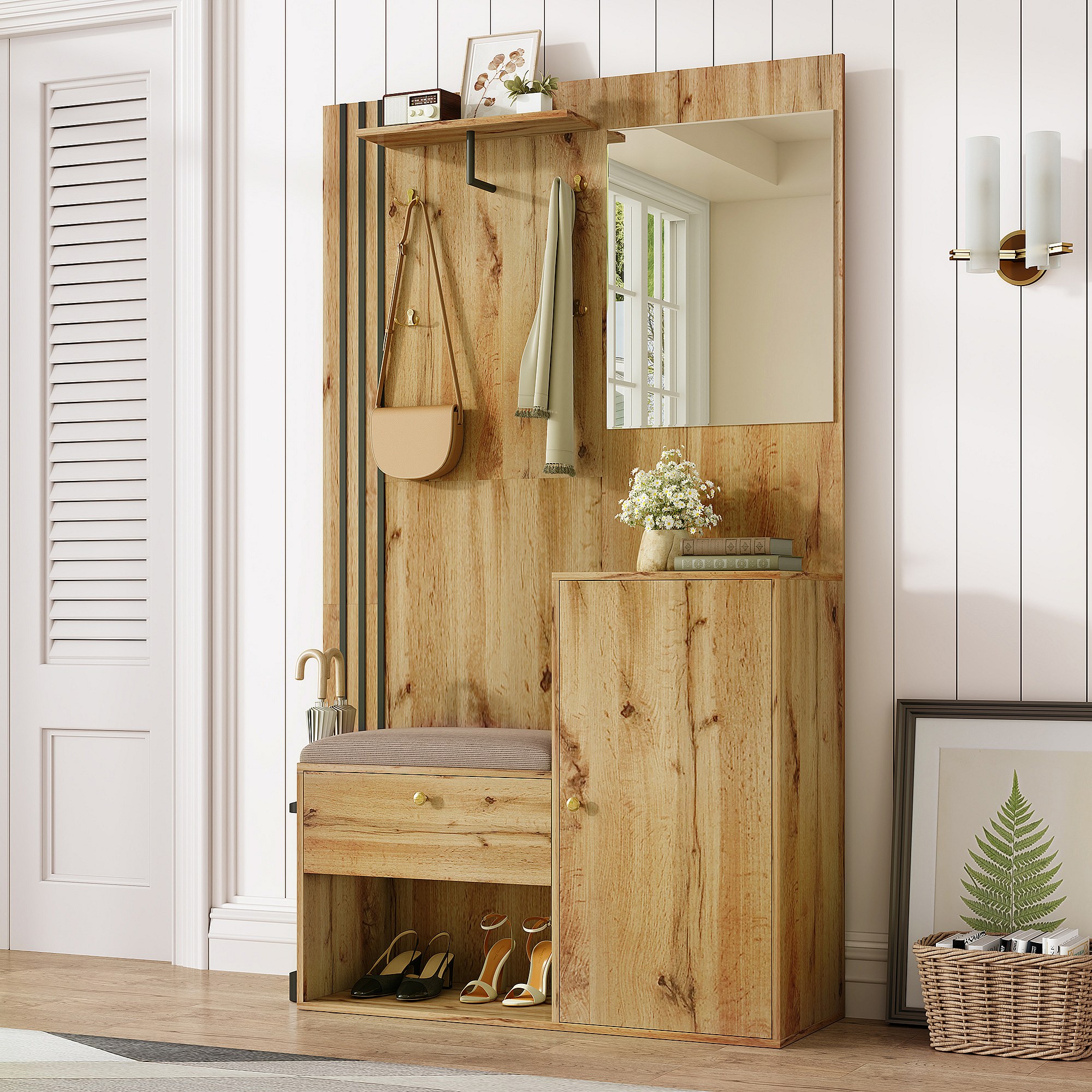 Vestiaire/ensemble de garde-robe avec miroir + coussin + meuble de chaussures - 115 x 37 x 185 cm - MDF - naturel