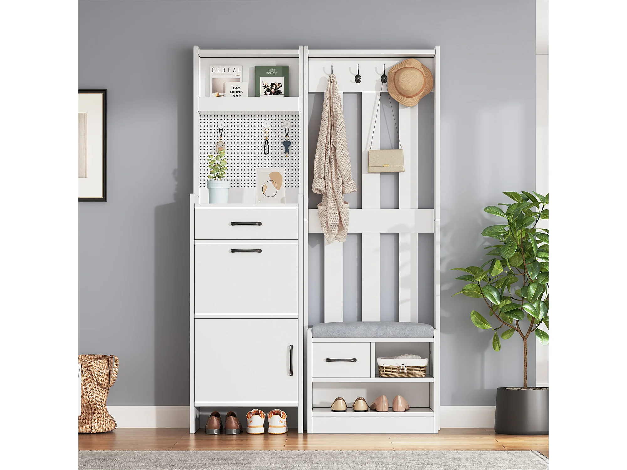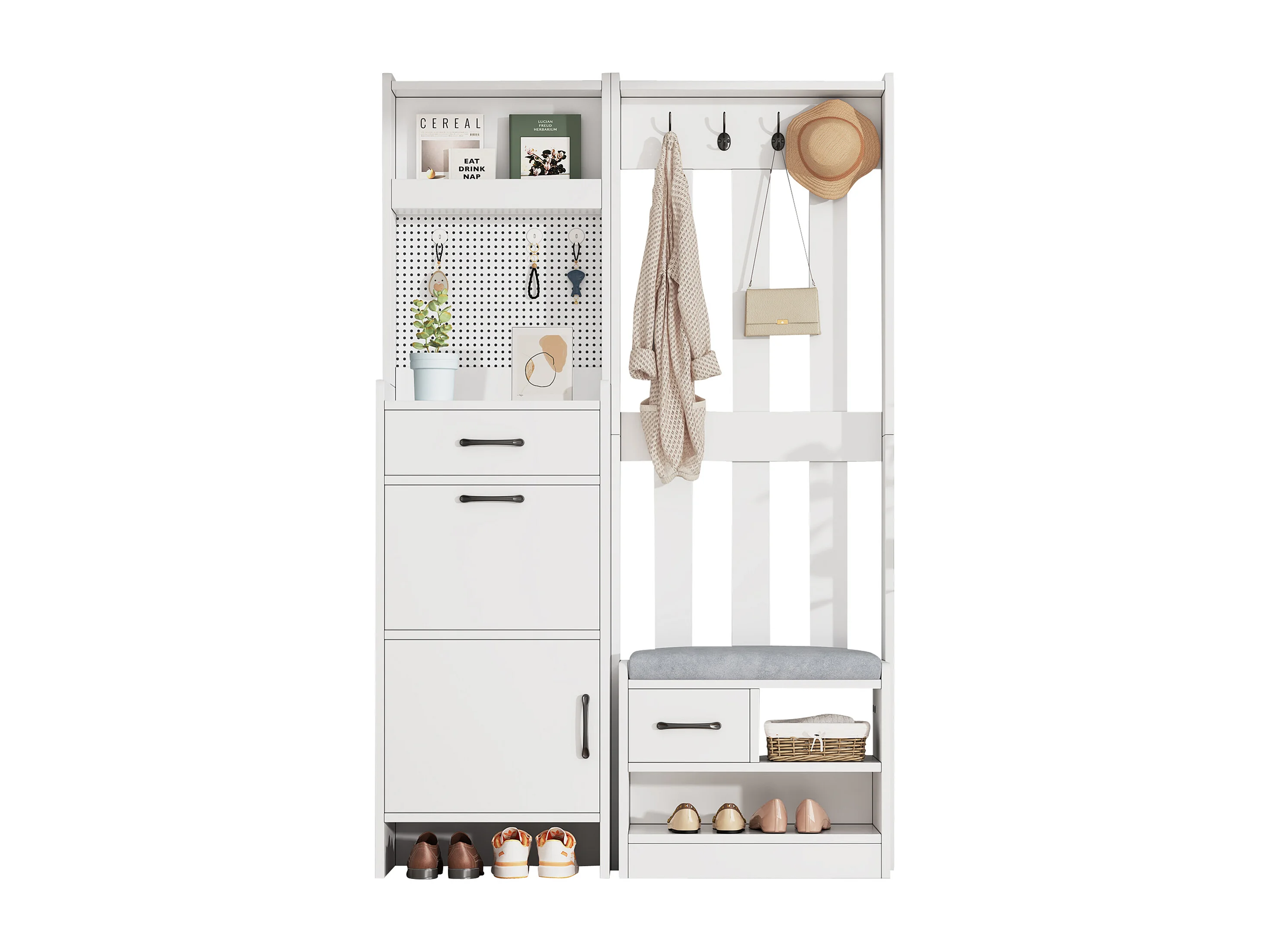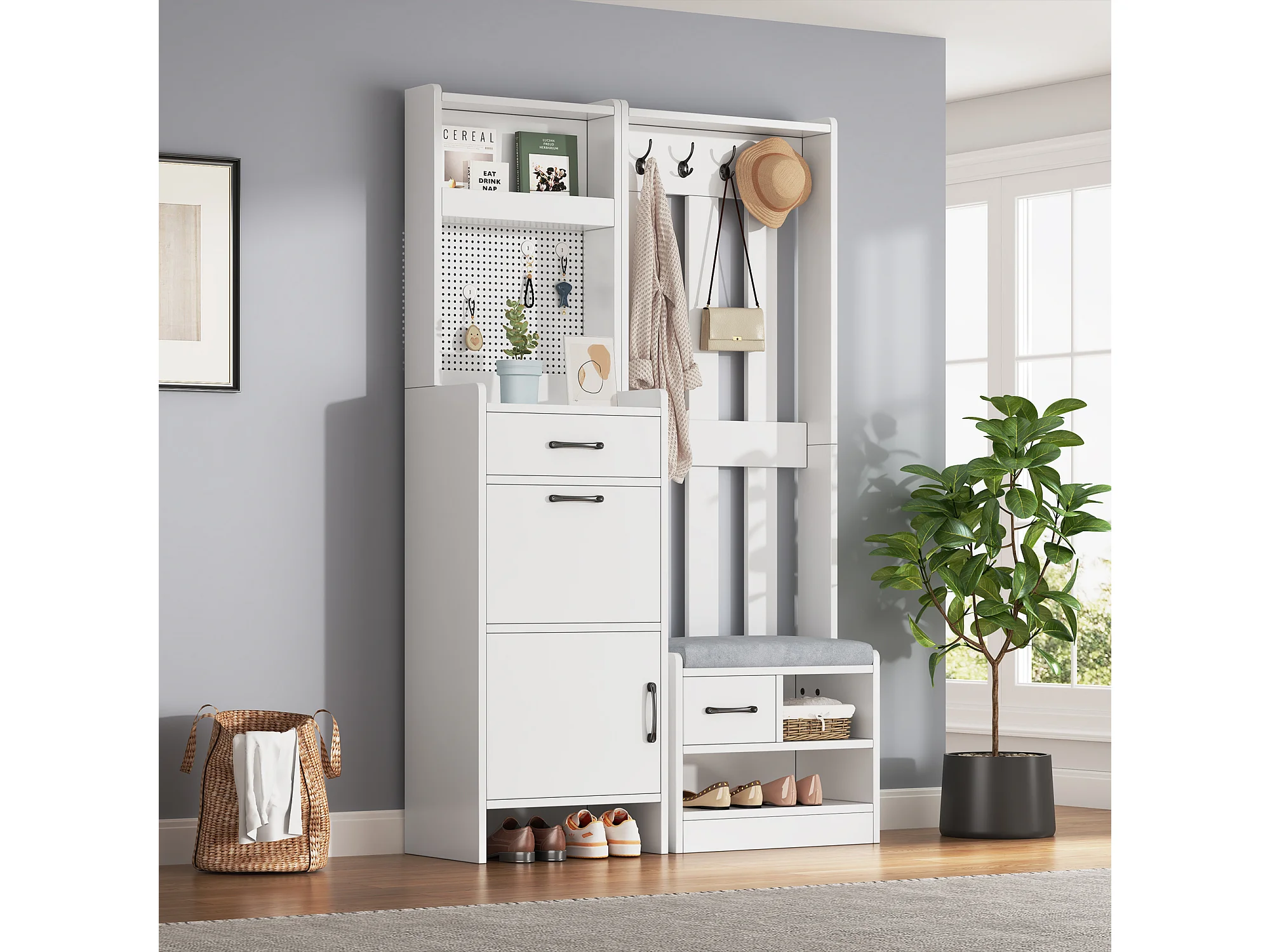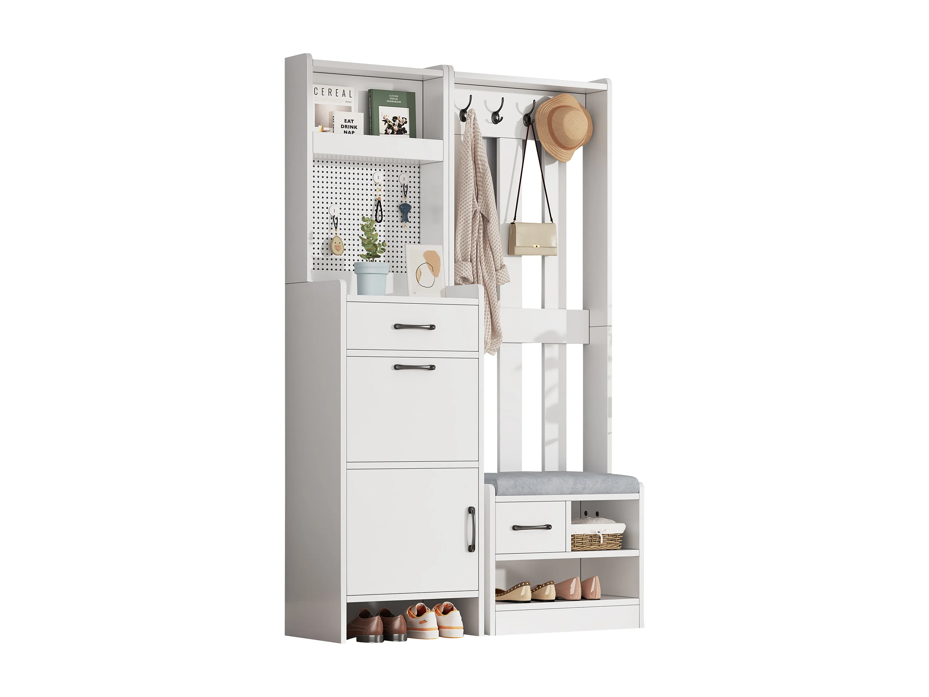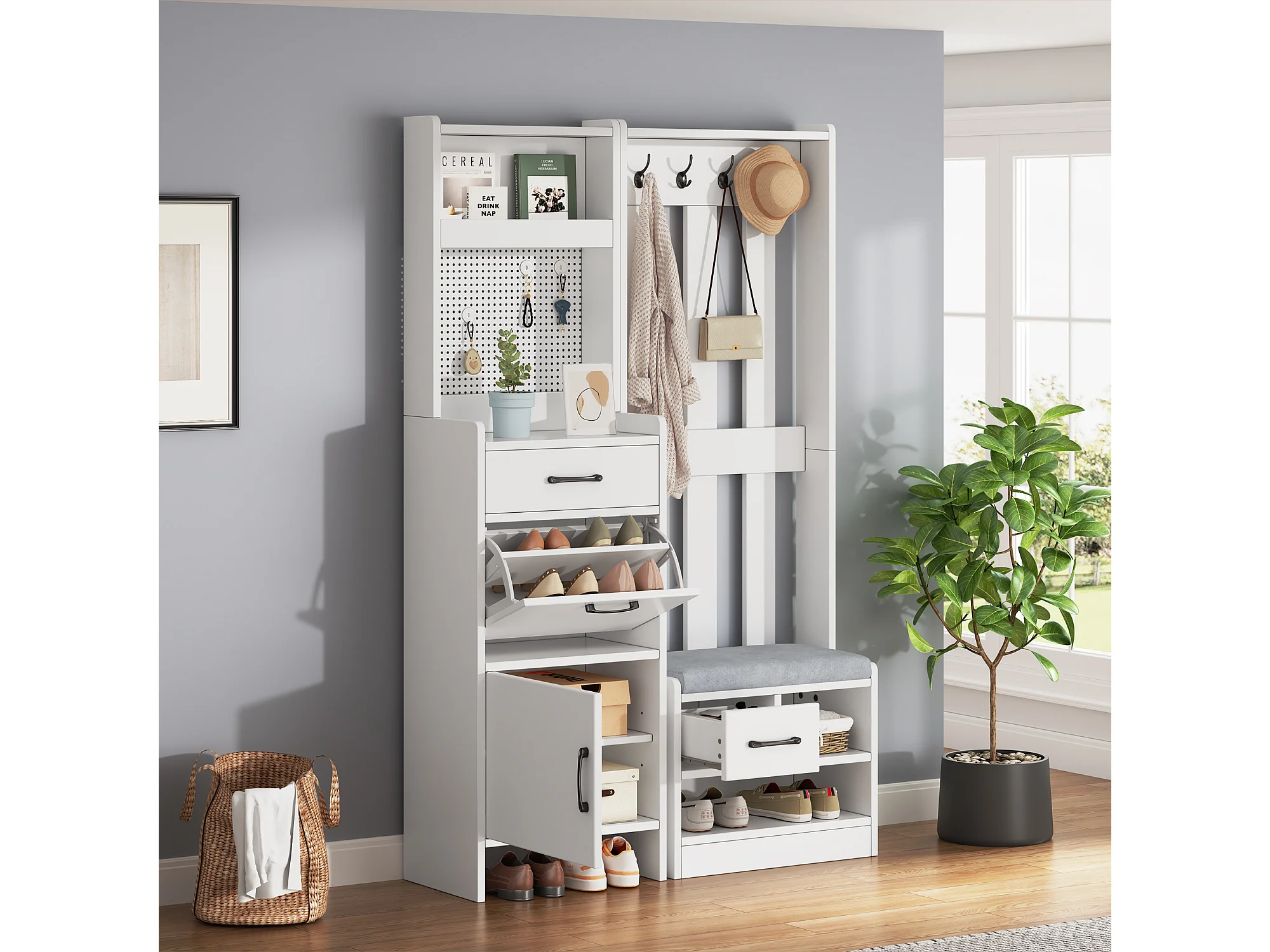 Vestiaire/porte-manteau 7 en 1 avec banc à chaussures + 7 crochets + porte + 2 tiroirs - aggloméré - blanc