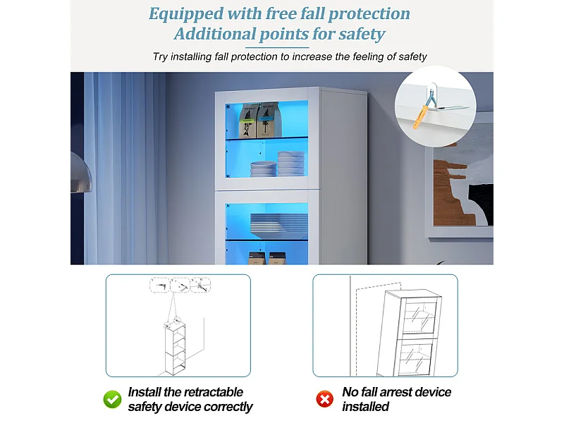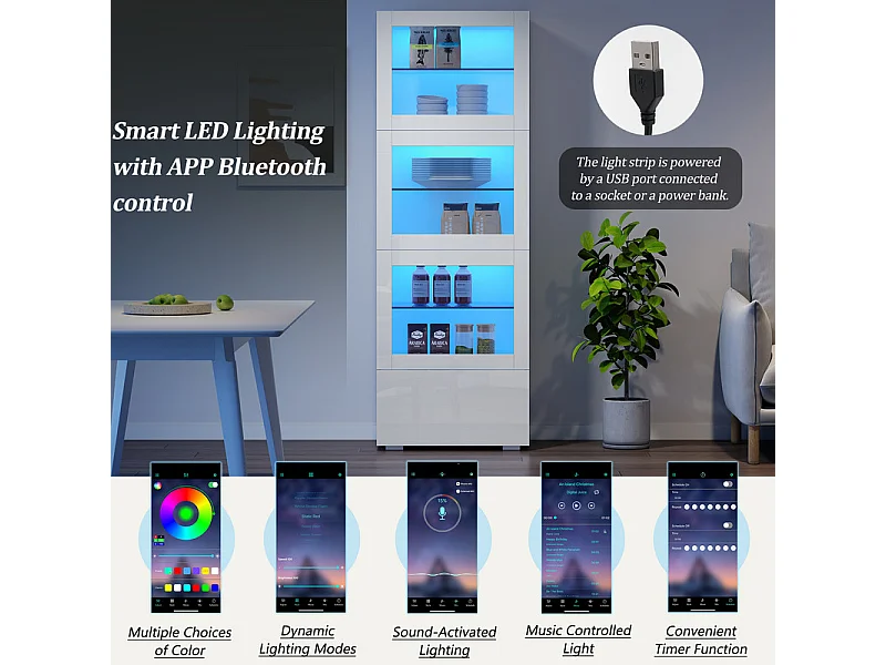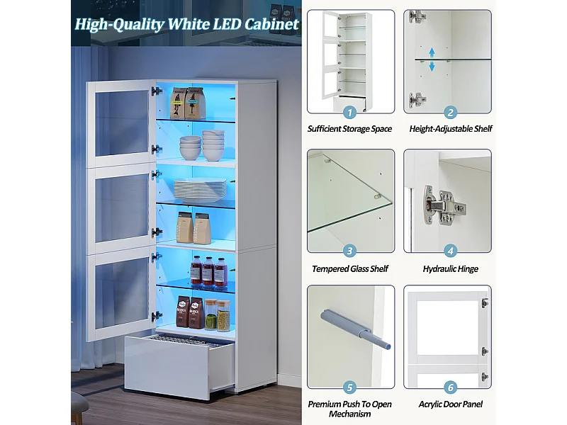 Vitrine 3 portes en acrylique et 1 tiroir, 5 étagères, avec Lumières LED, MDF, 60x40x173CM