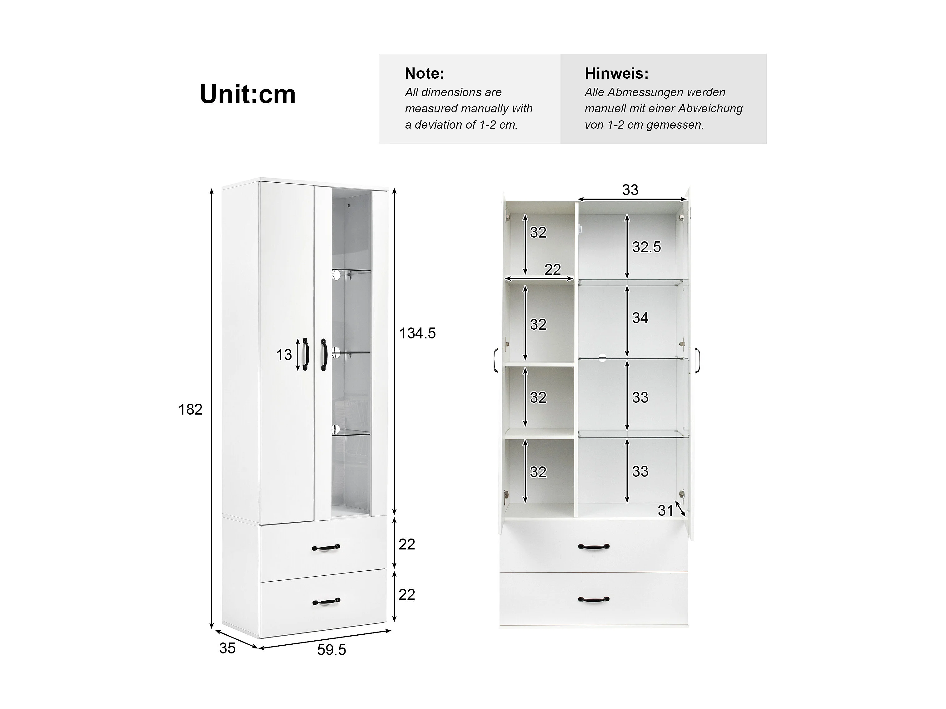 Vitrine 59.5x35x182 cm LED 2 portes 2 tiroirs et étagères en verre - meuble de rangement - bois - blanc