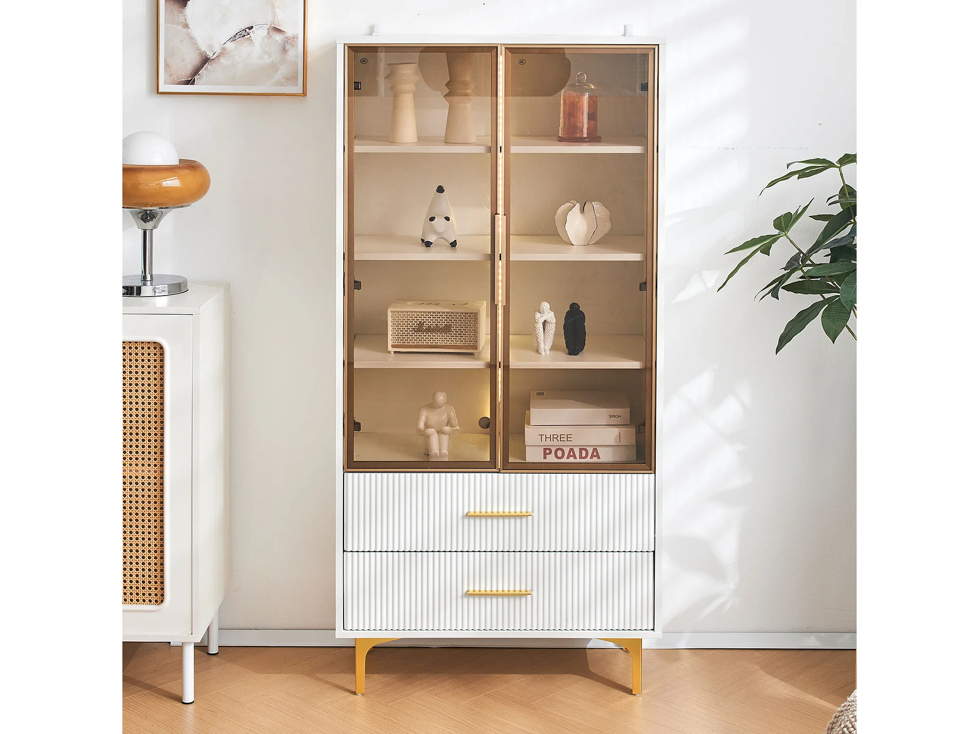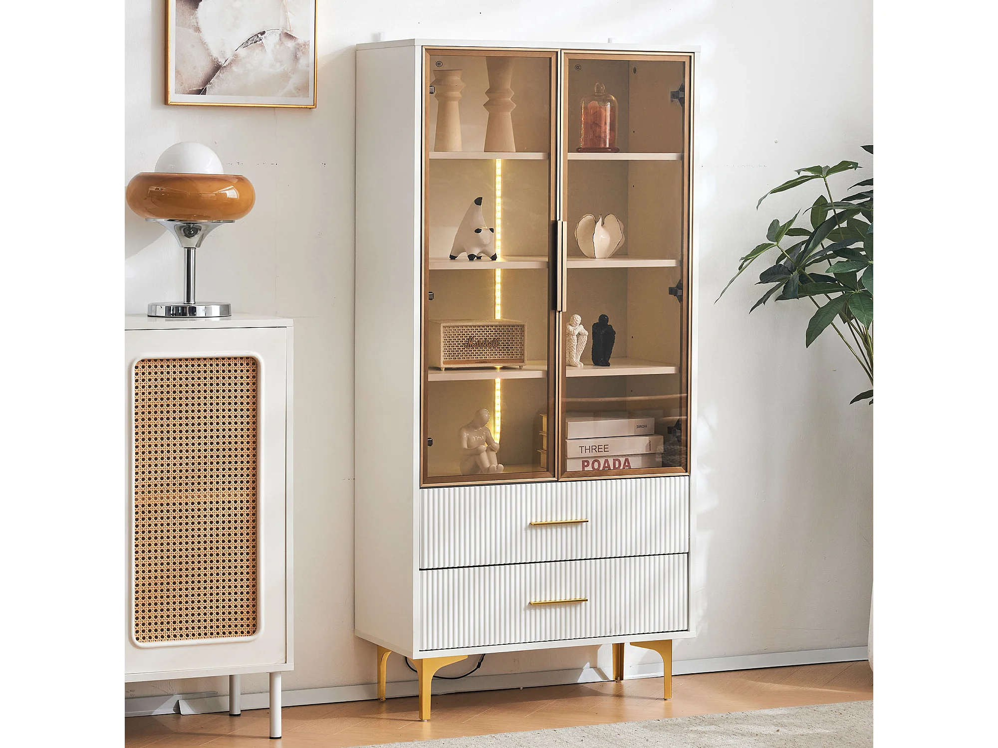 Vitrine 70x35x150 cm LED 2 portes en verre 2 tiroirs de rangement - étagères réglables - blanc
