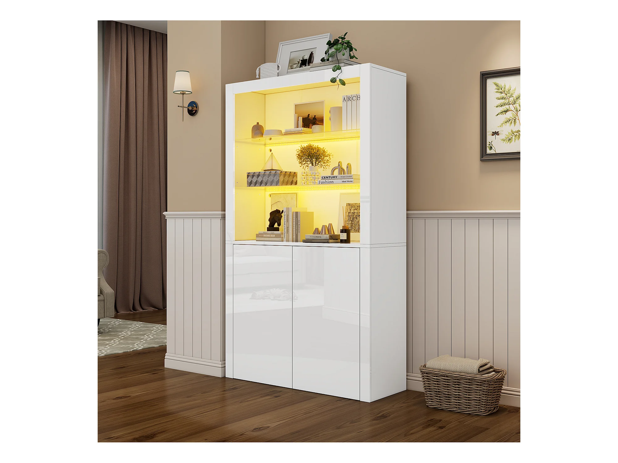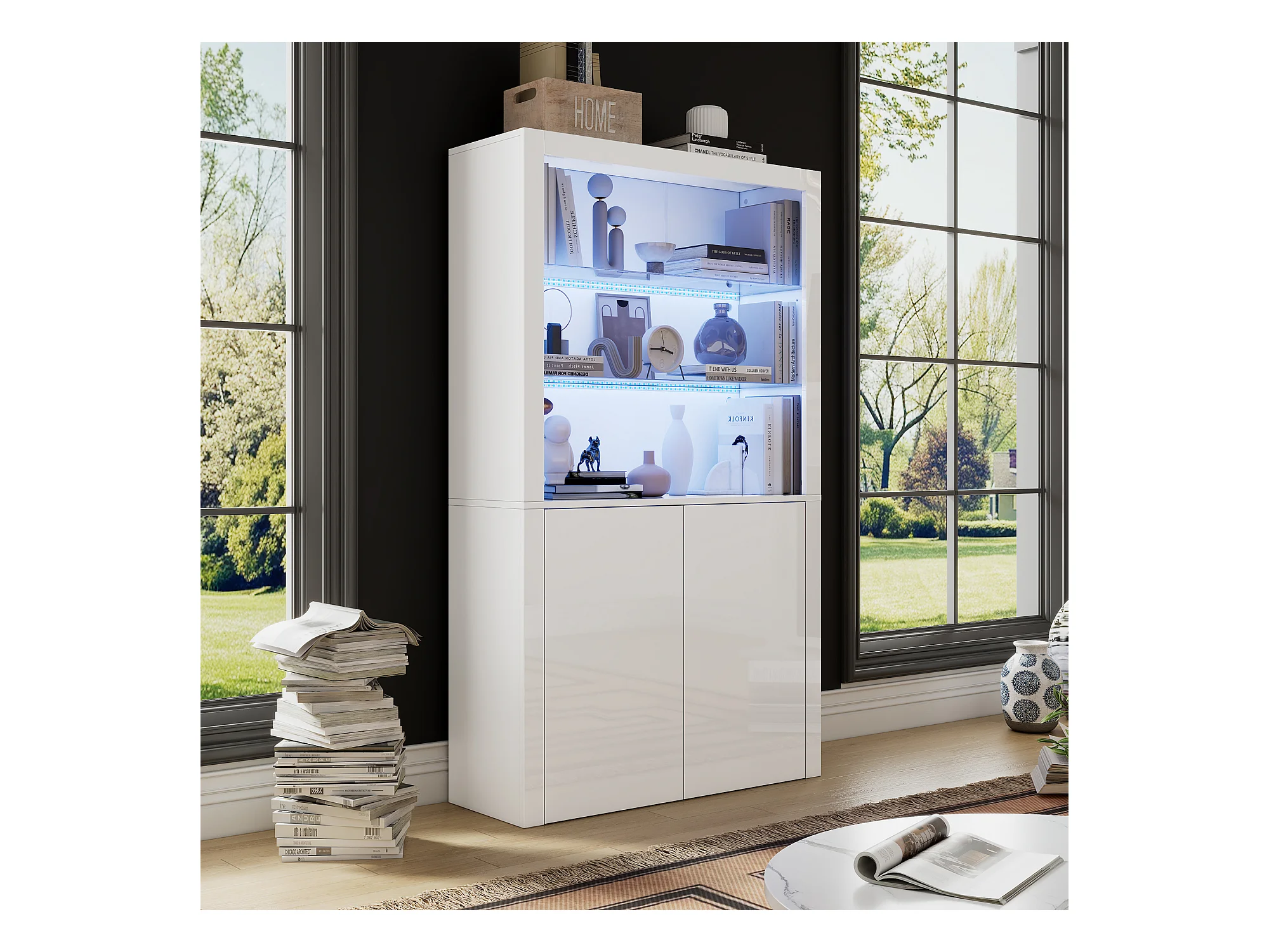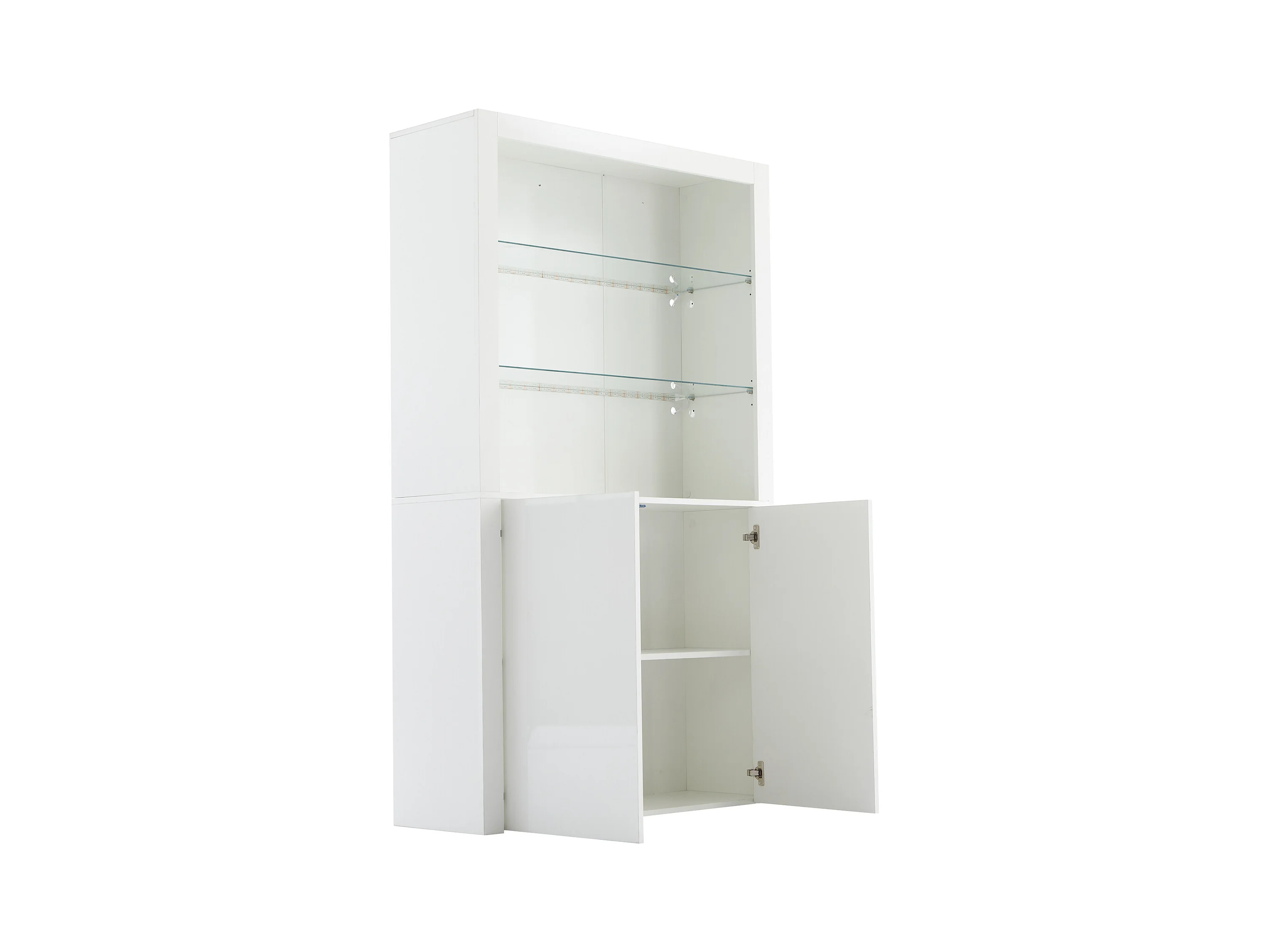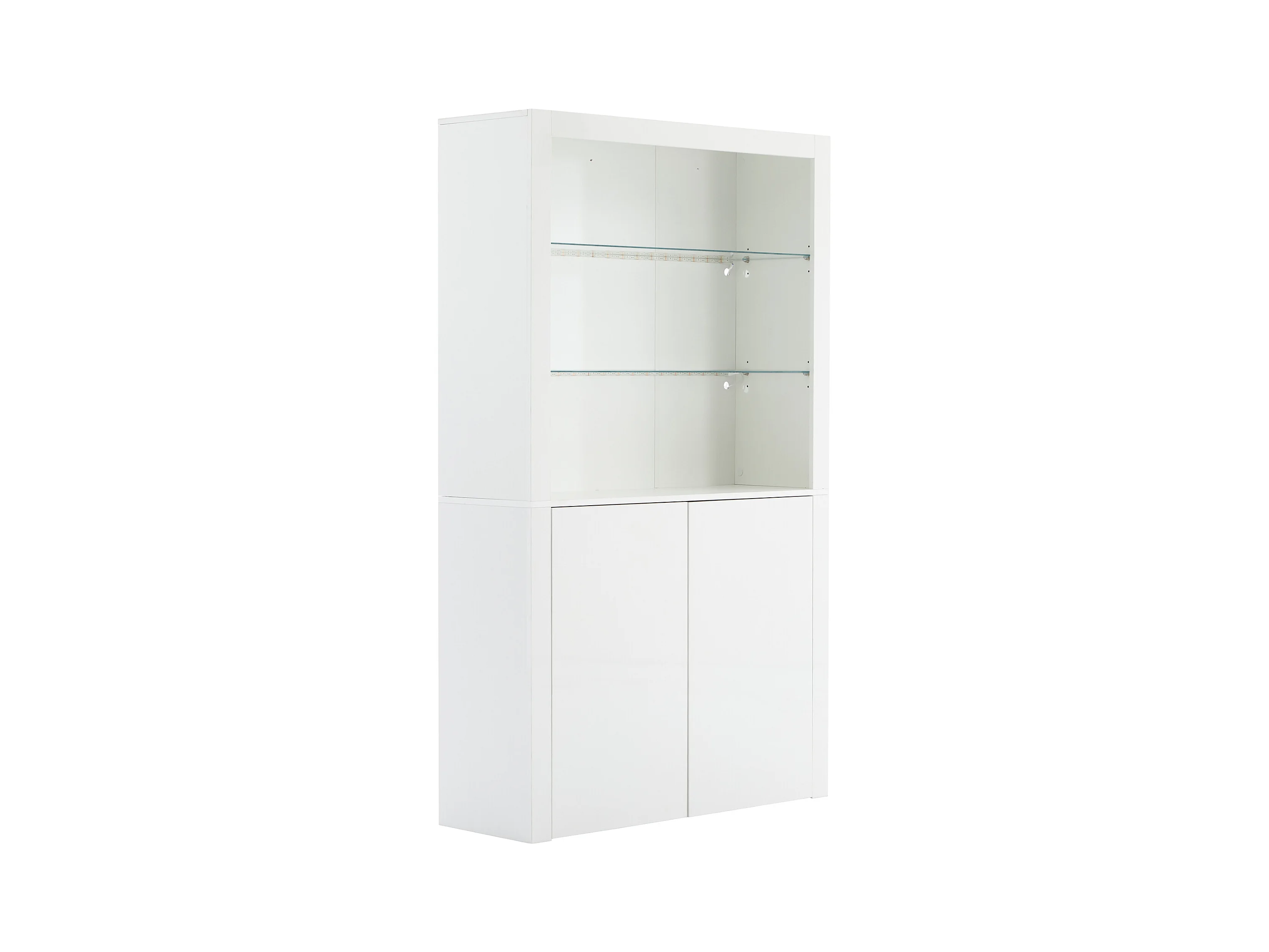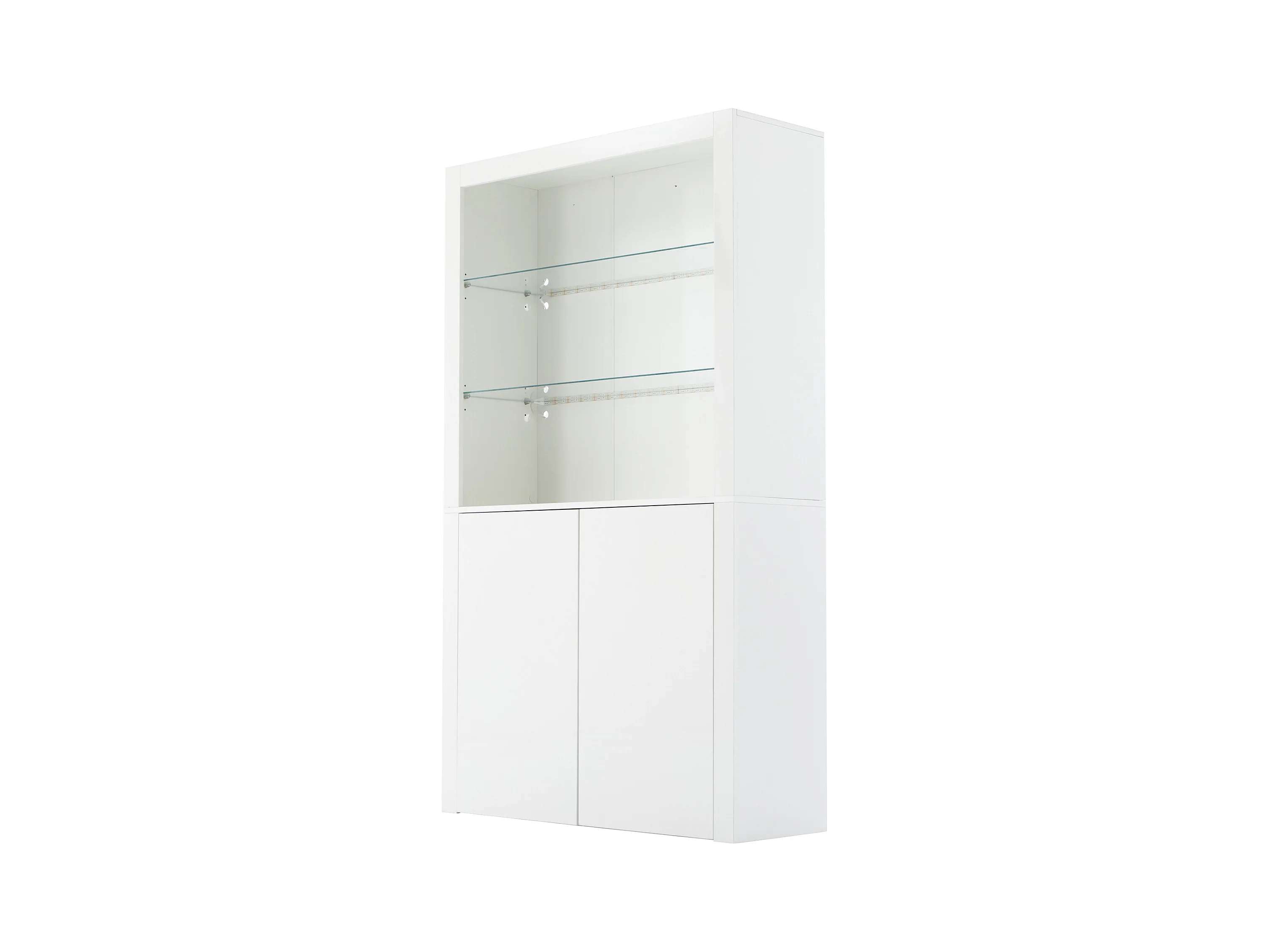 Vitrine avec 2 portes et tablettes en verre trempé, corps en blanc laqué, LED inclus - 100x35x170cm