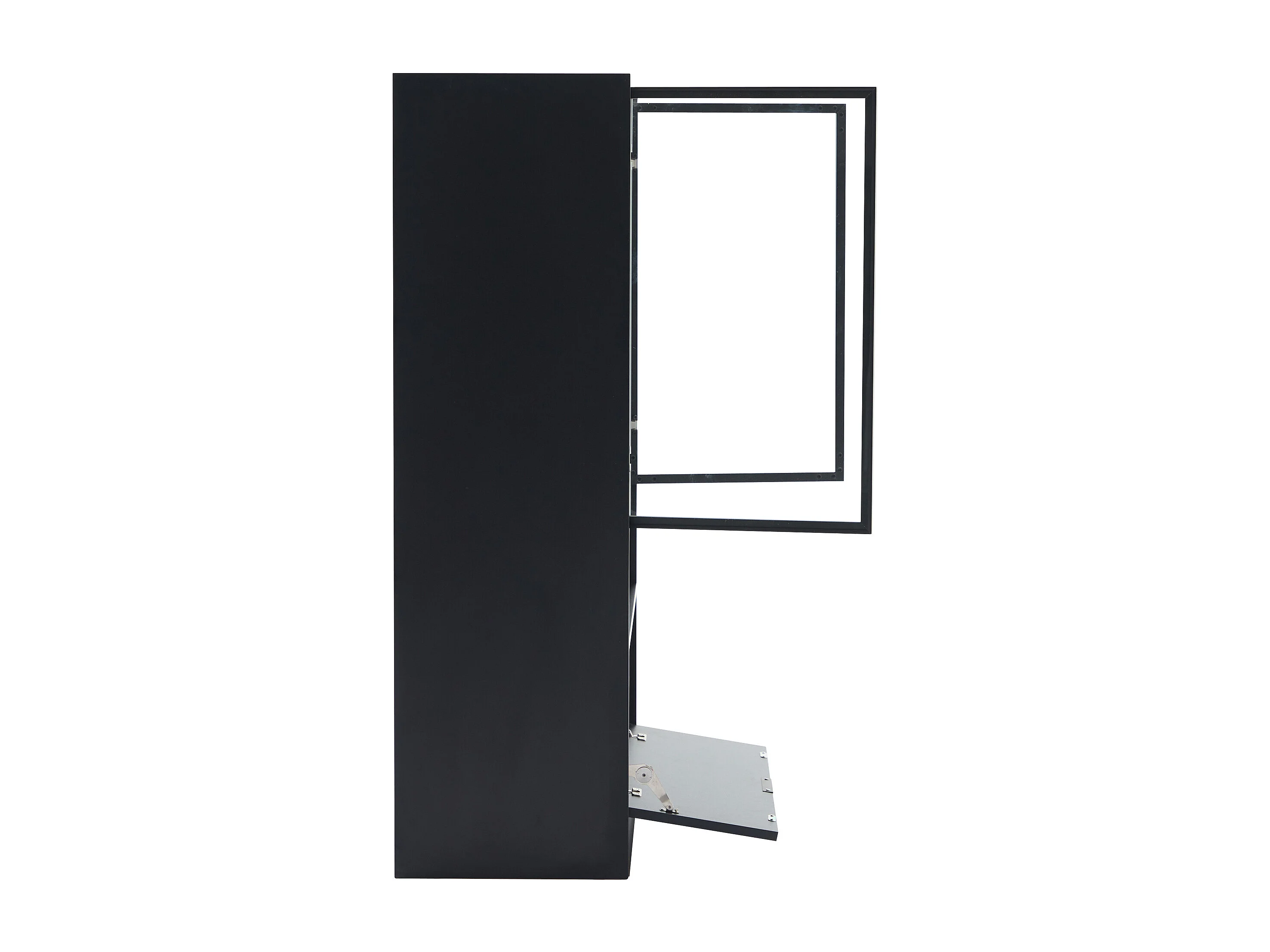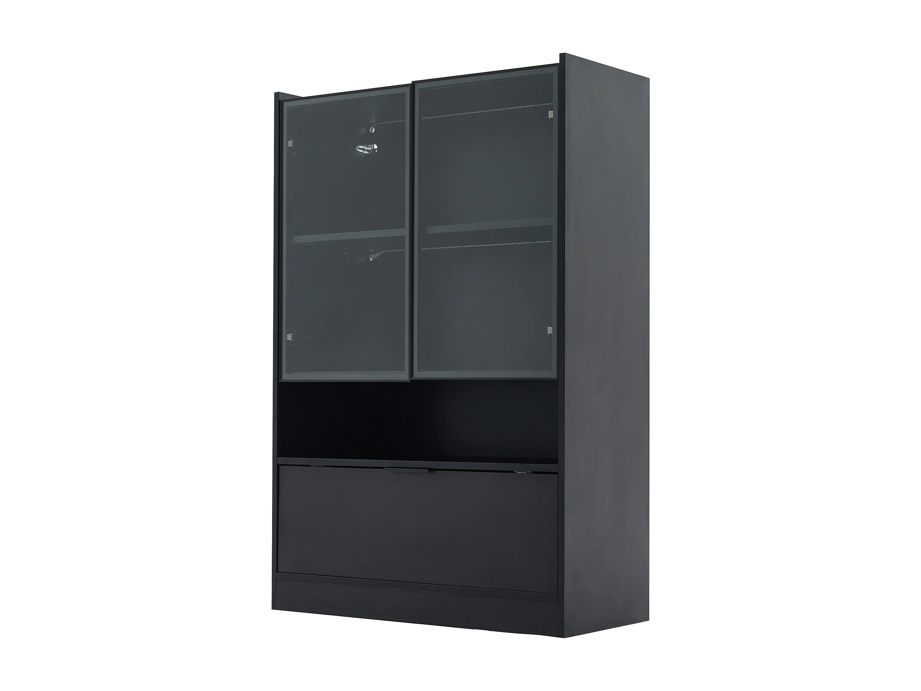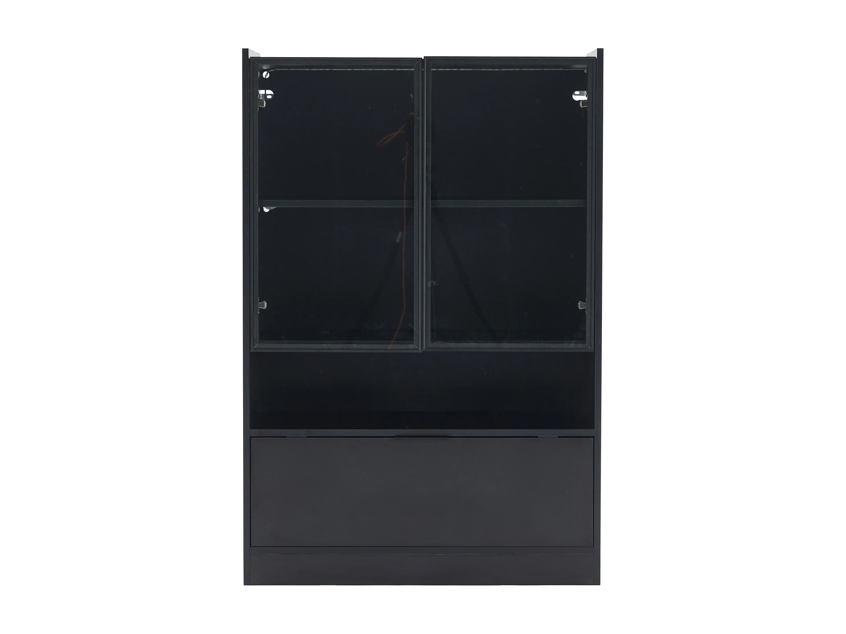 Vitrine noire avec LEDs, porte en acrylique et tiroir- Etagères en verre - Finition brillante