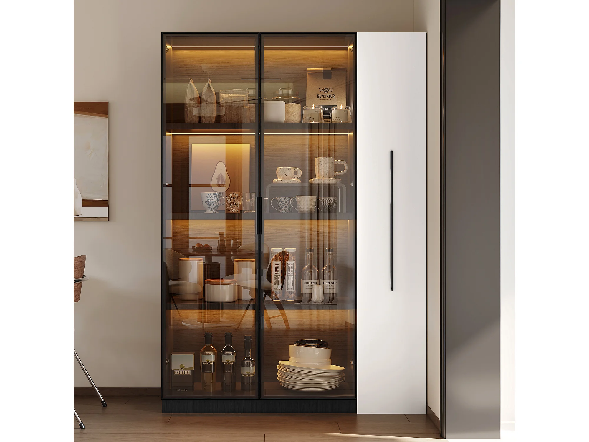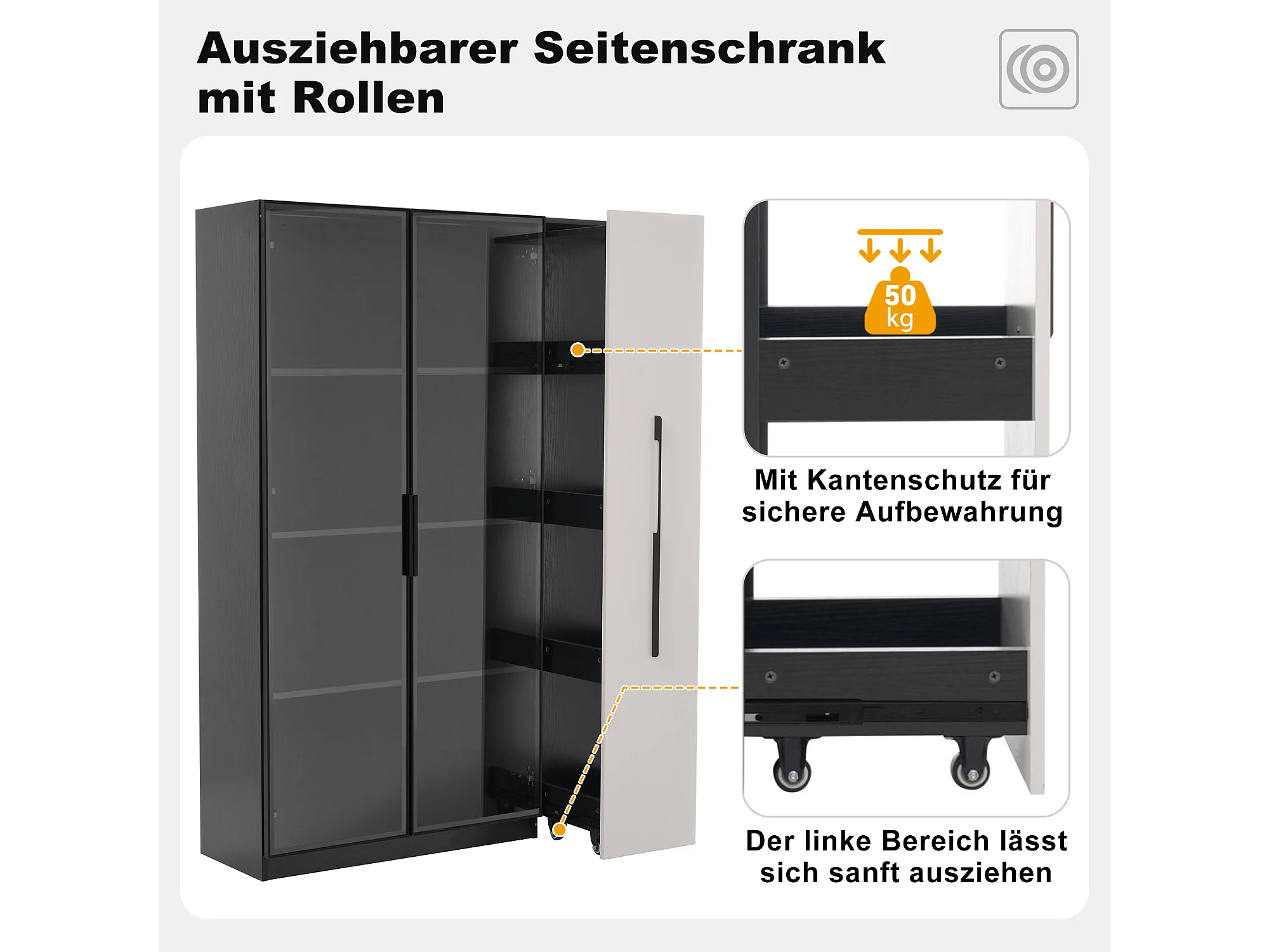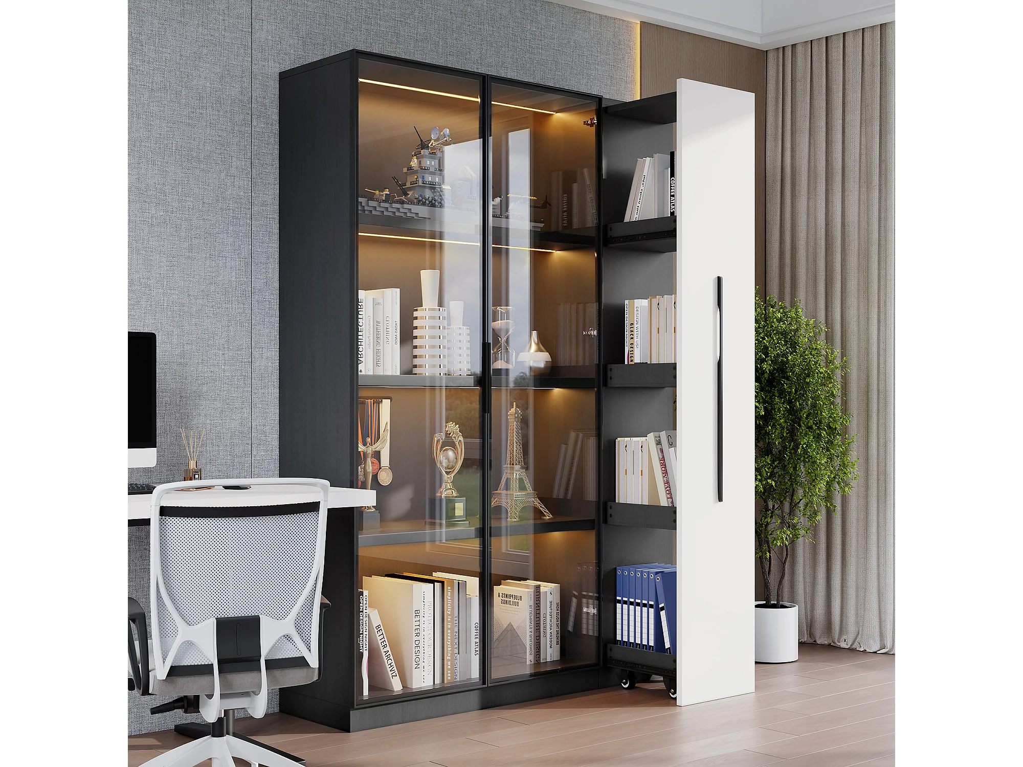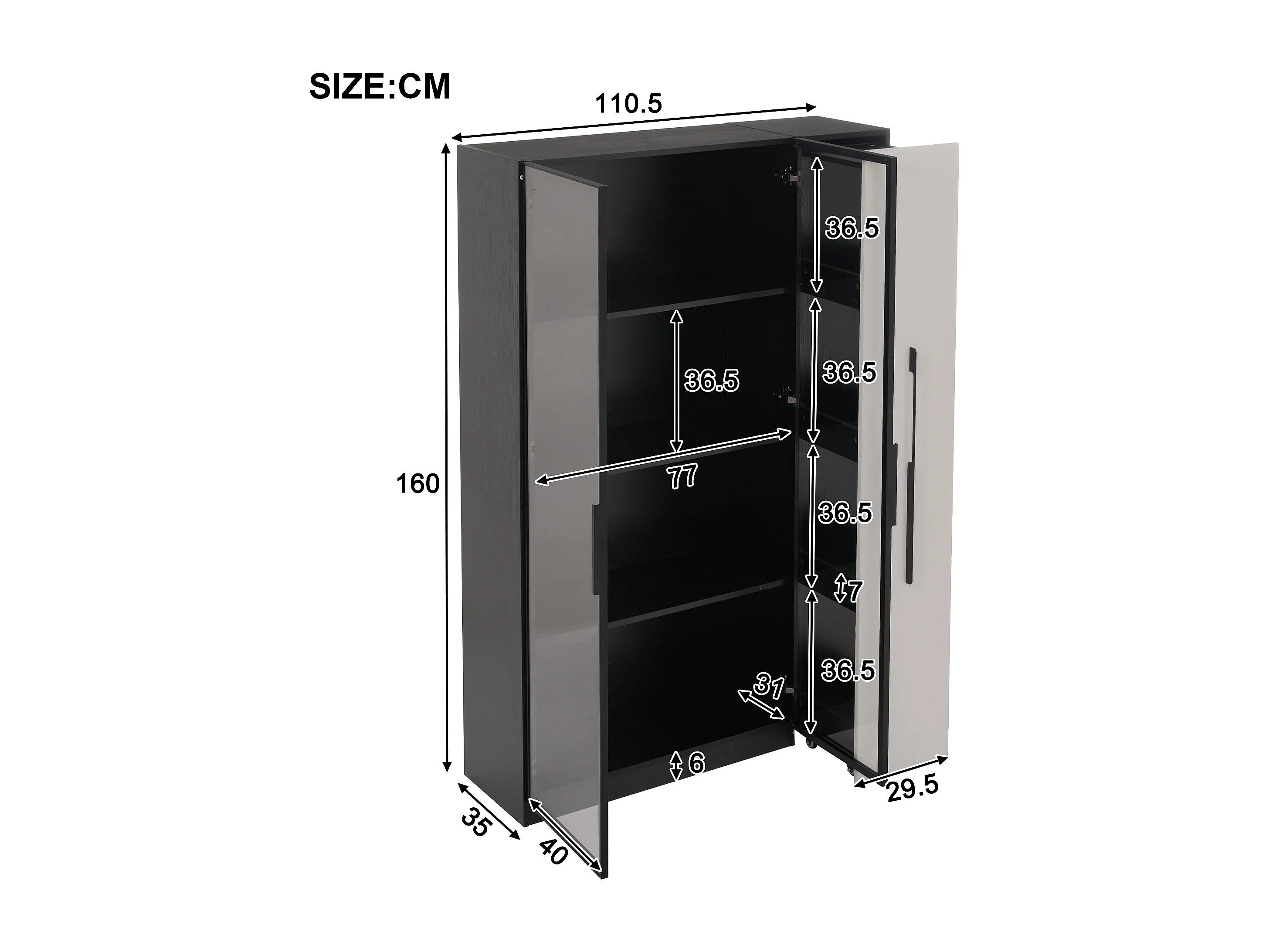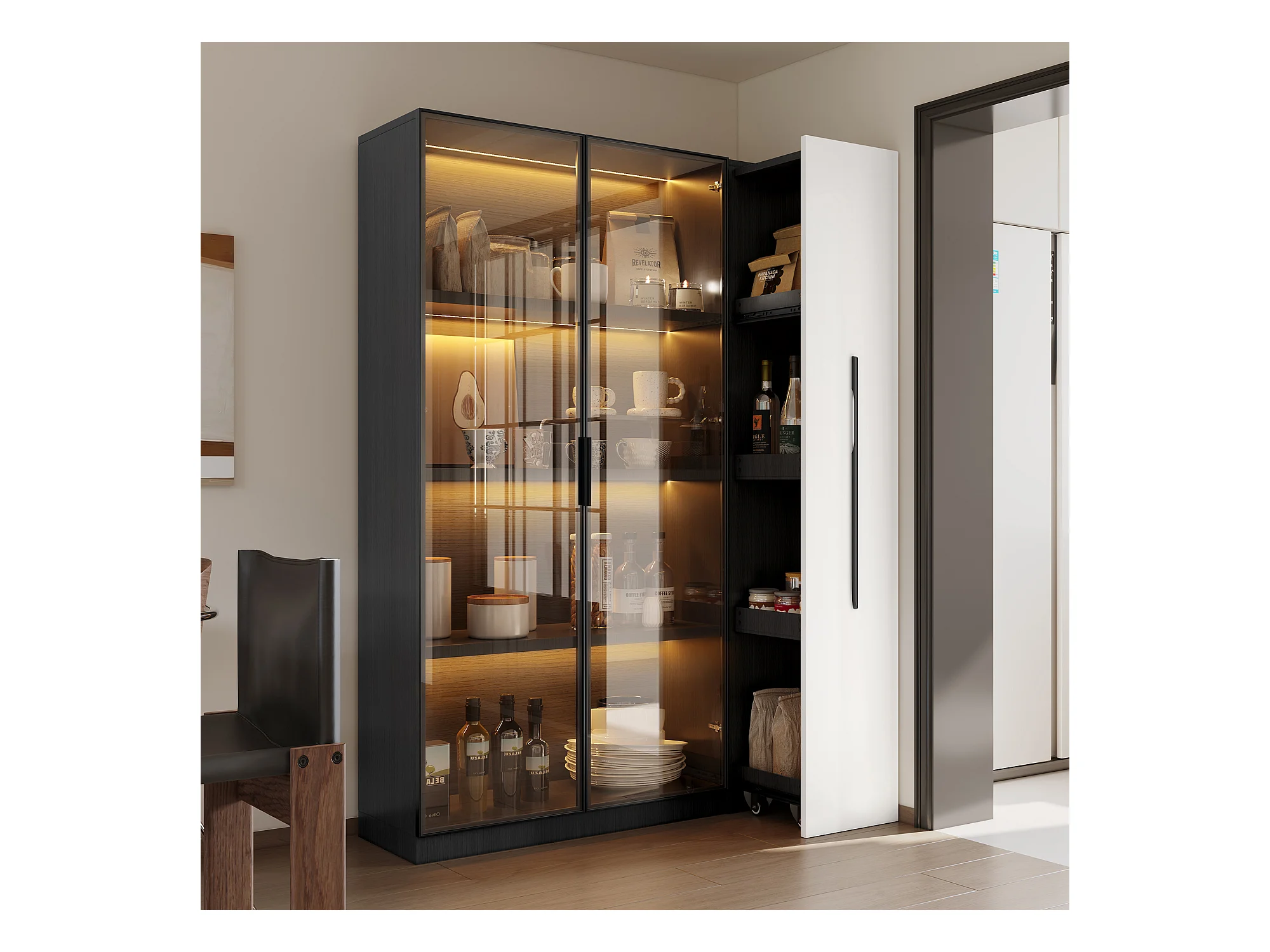 Vitrine avec porte vitrée - 110.5 x 35 x 160 cm - avec Leds + tiroir latéral - MDF - noir + blanc