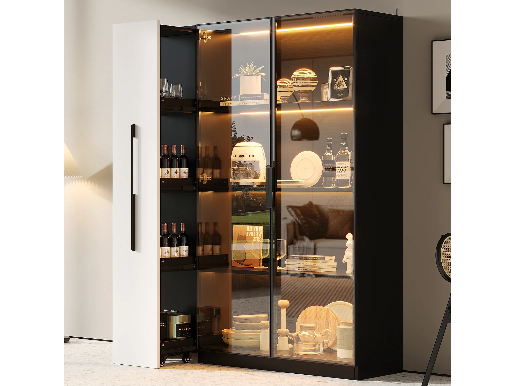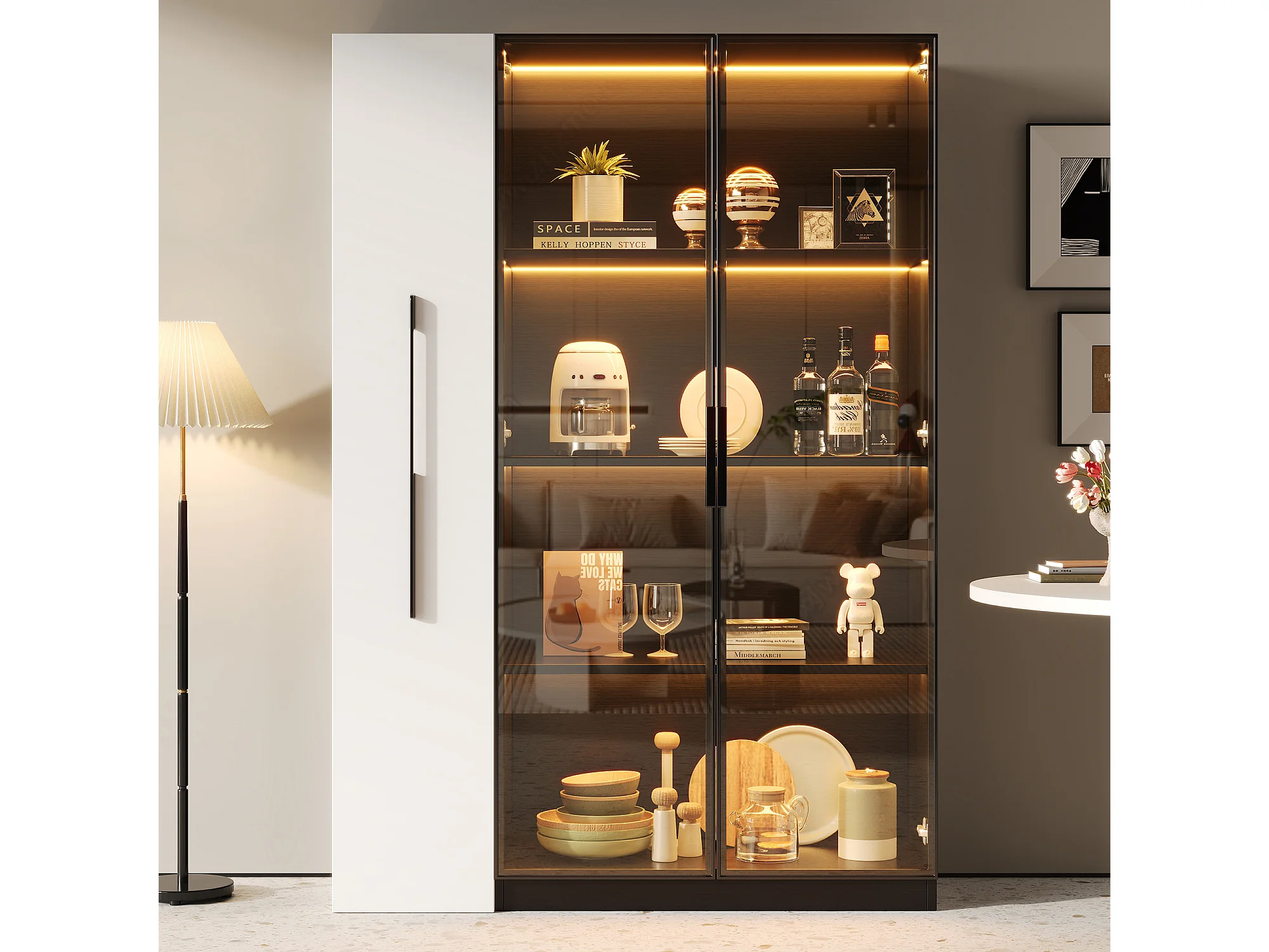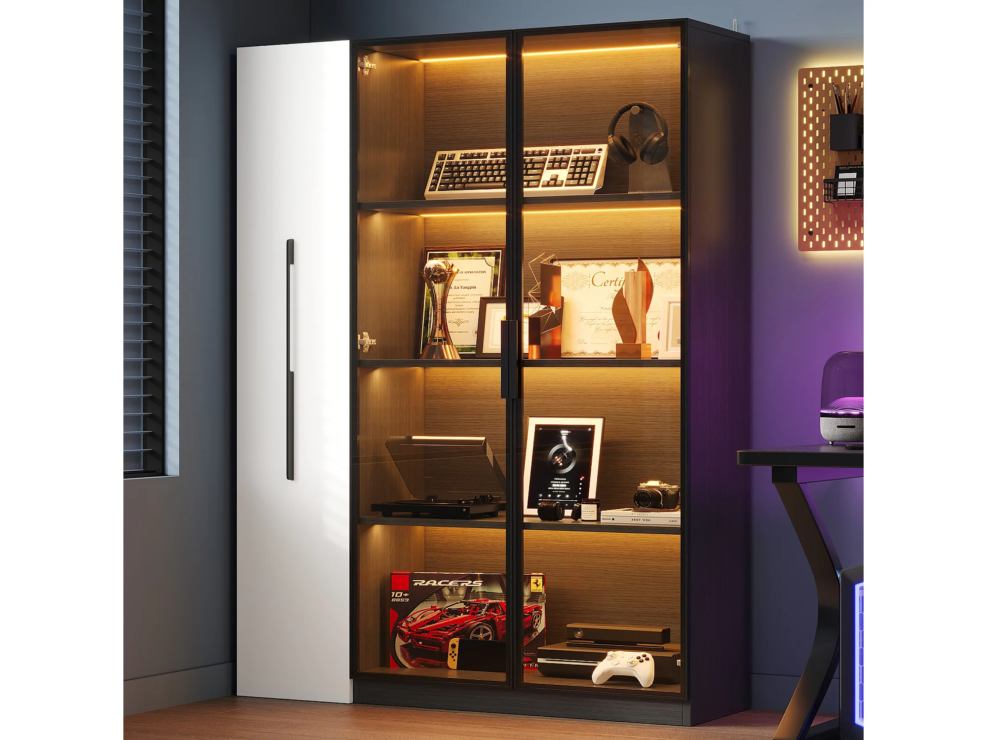 Vitrine avec porte vitrée et Leds - 110.5 x 35 x 160 cm - avec bibliothèque latéral coulissant - MDF - noir