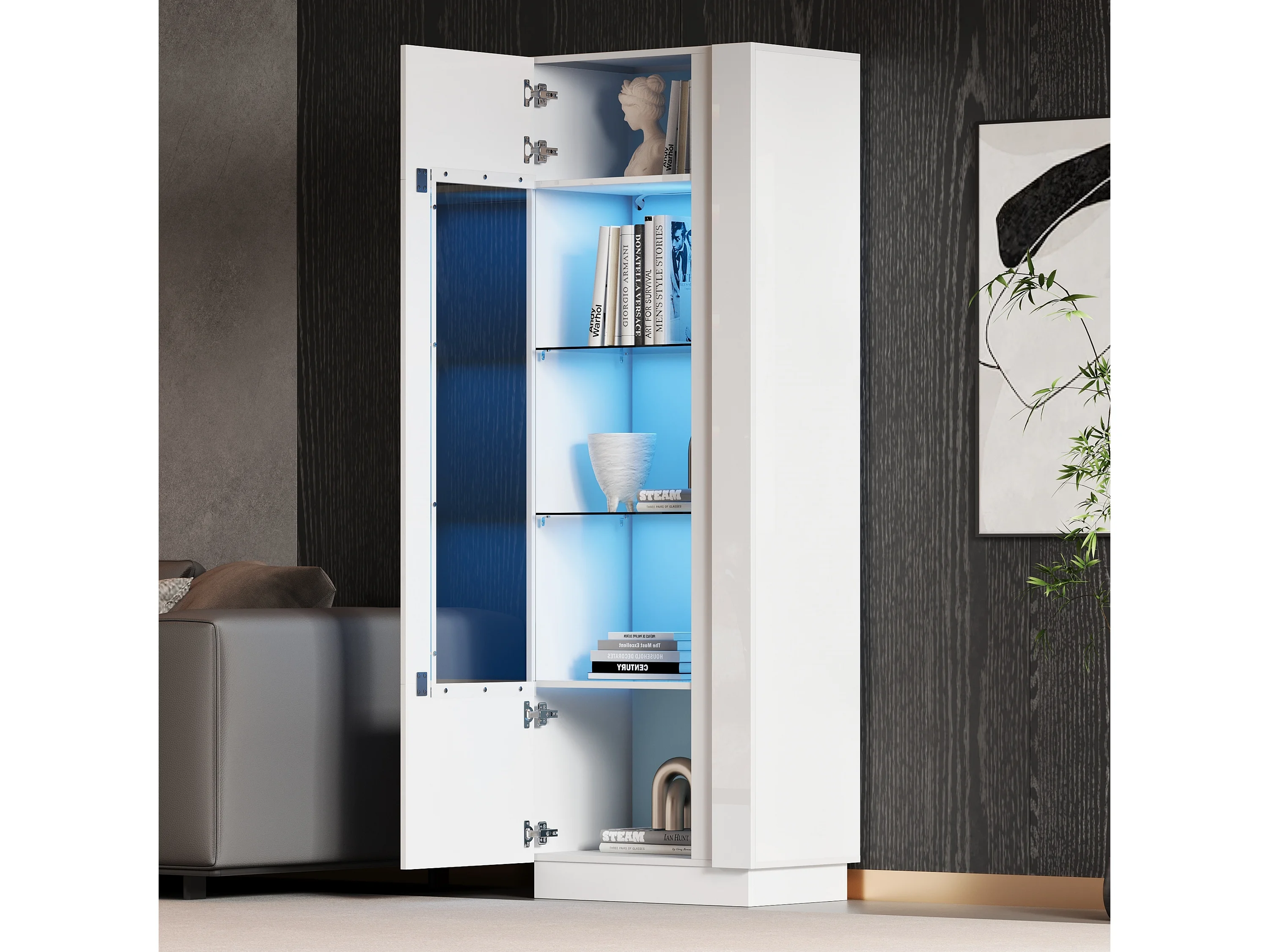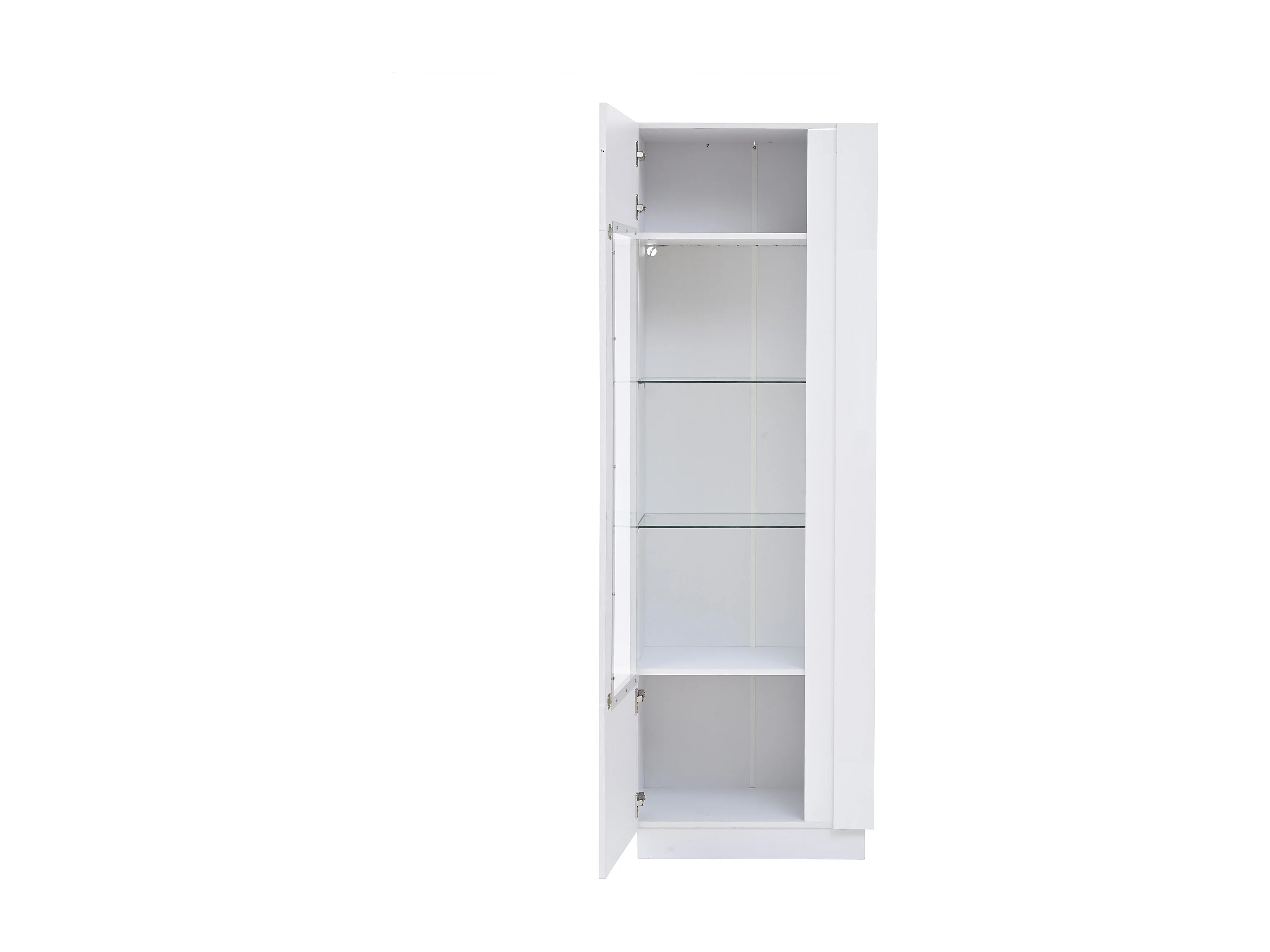 Vitrine blanche avec 1 porte en acrylique et étagères de rangement, éclairage LED