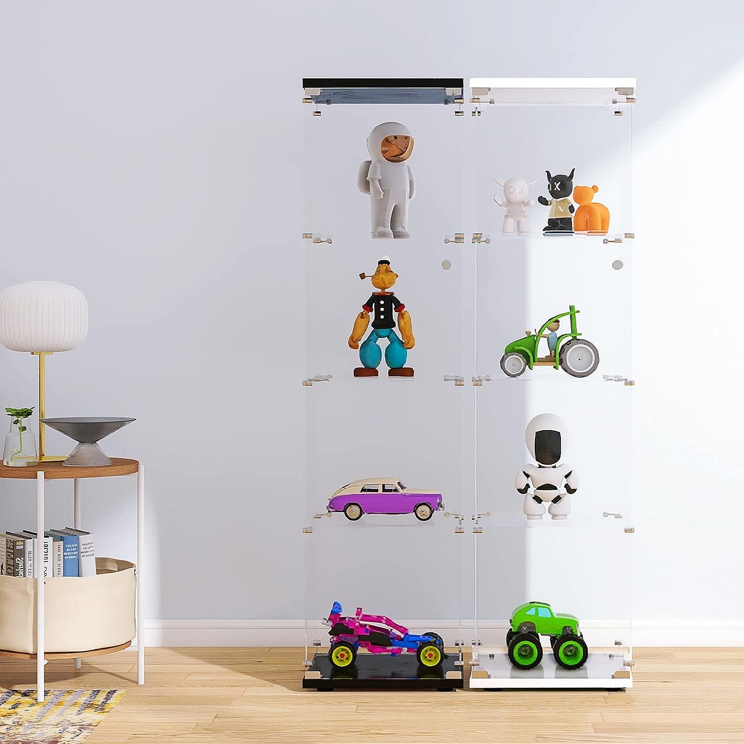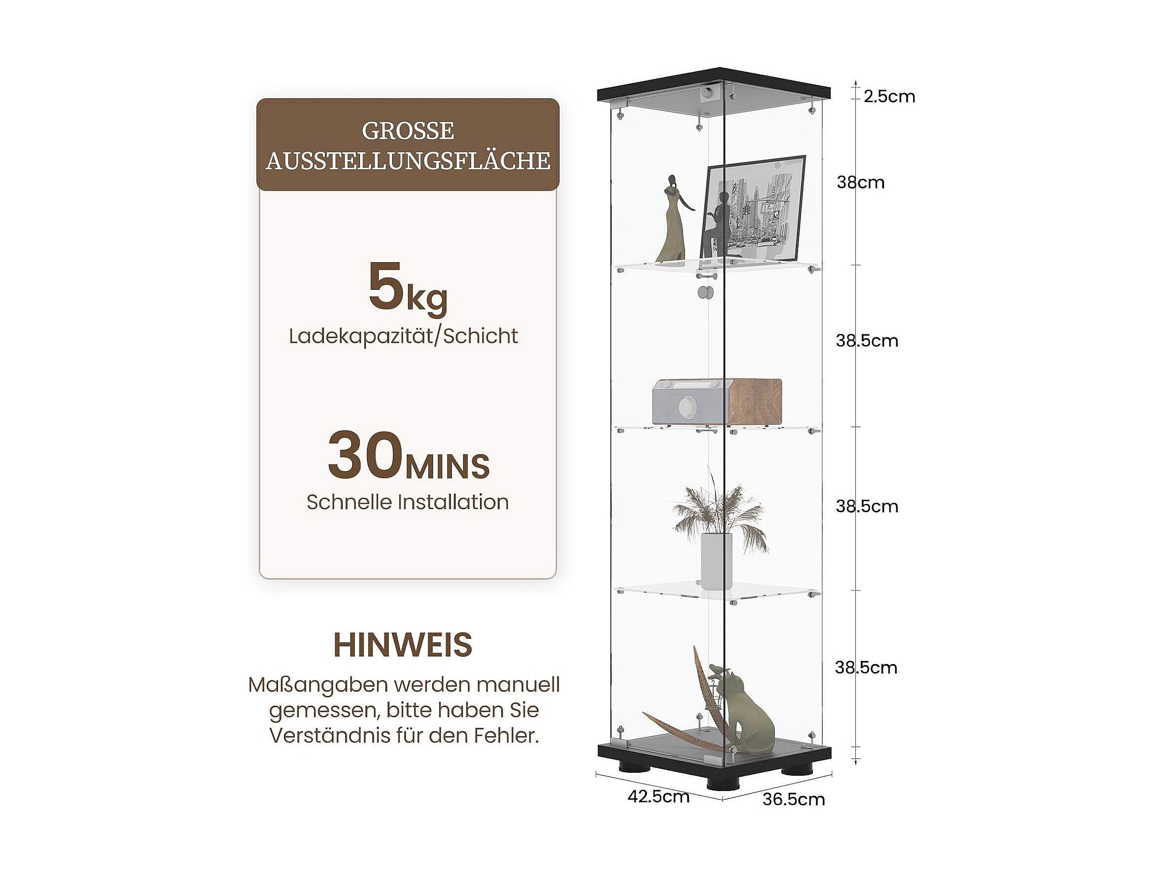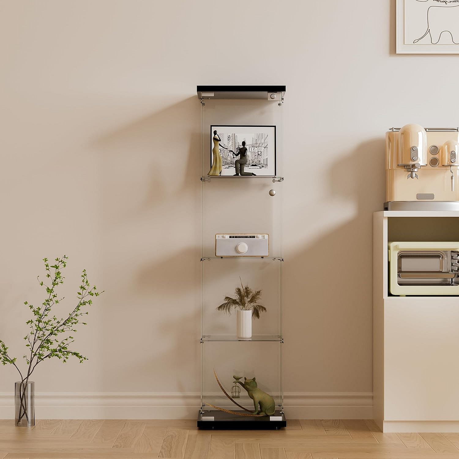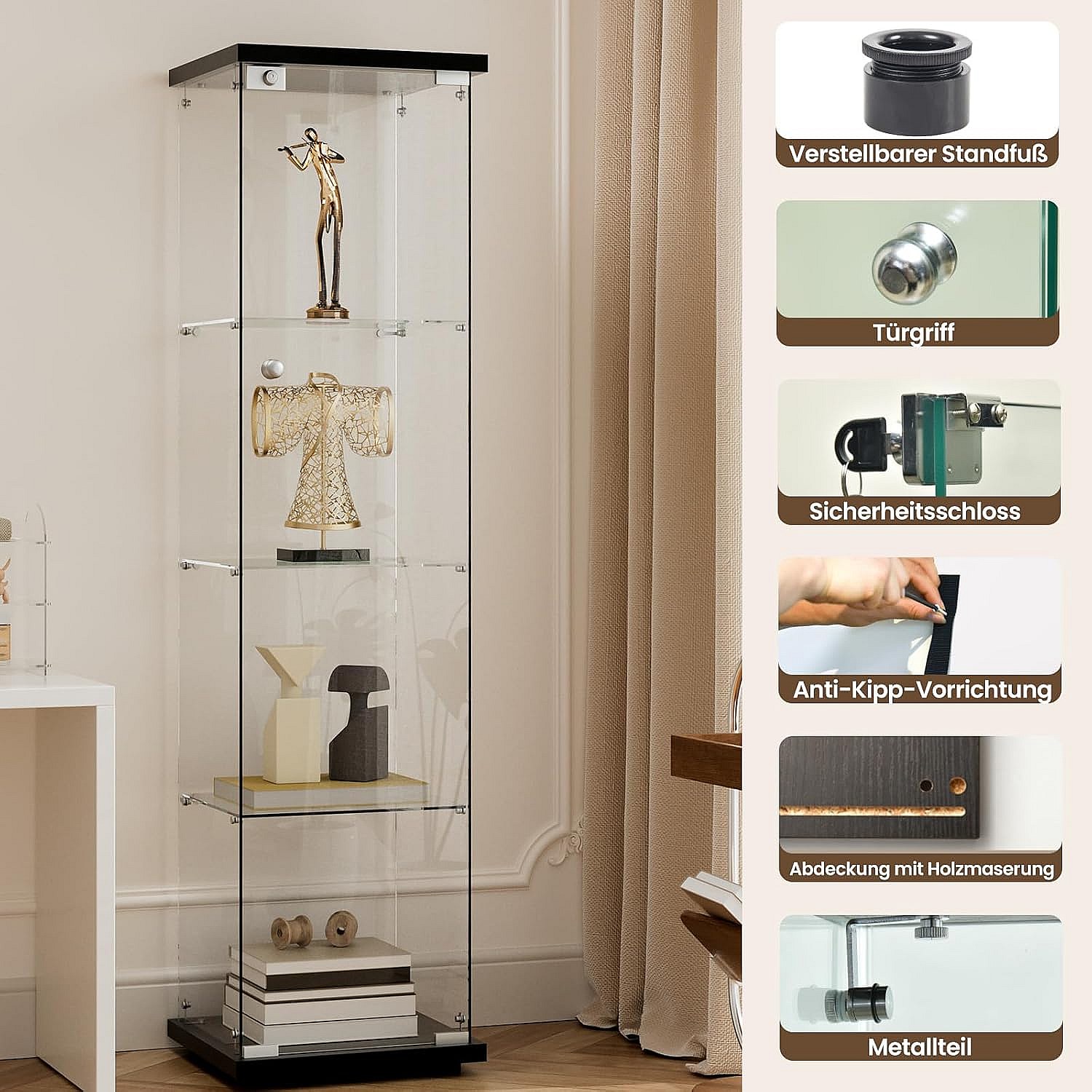 Vitrine en verre 4 étagères, 1 porte, 164x42x36 cm, meuble pour collection, noir, transparent