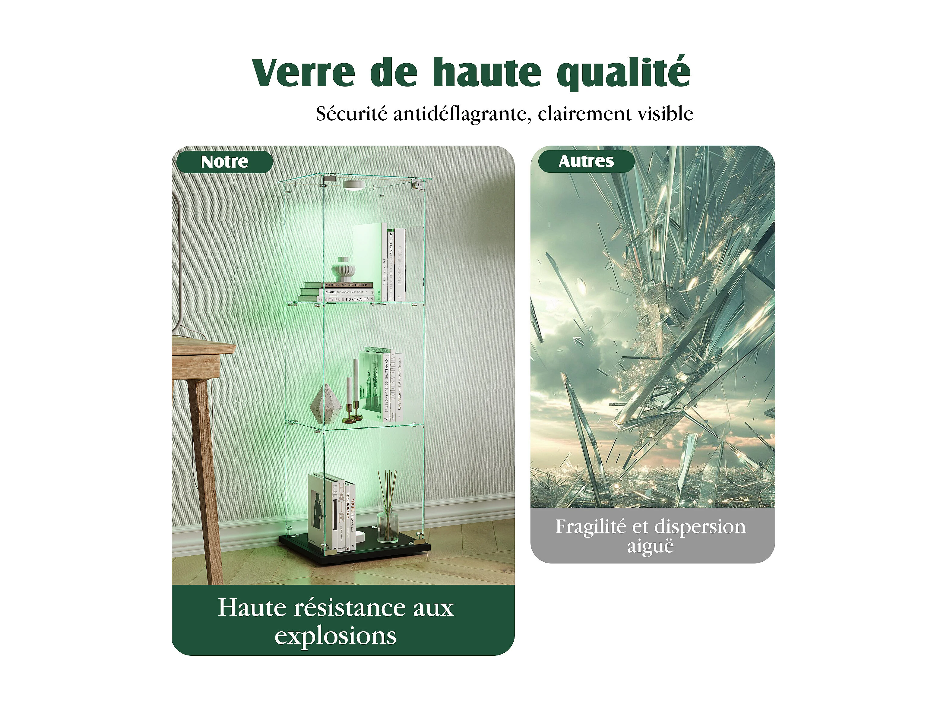 Vitrine en verre à 5 étagères avec éclairage LED personnalisable – Base noire