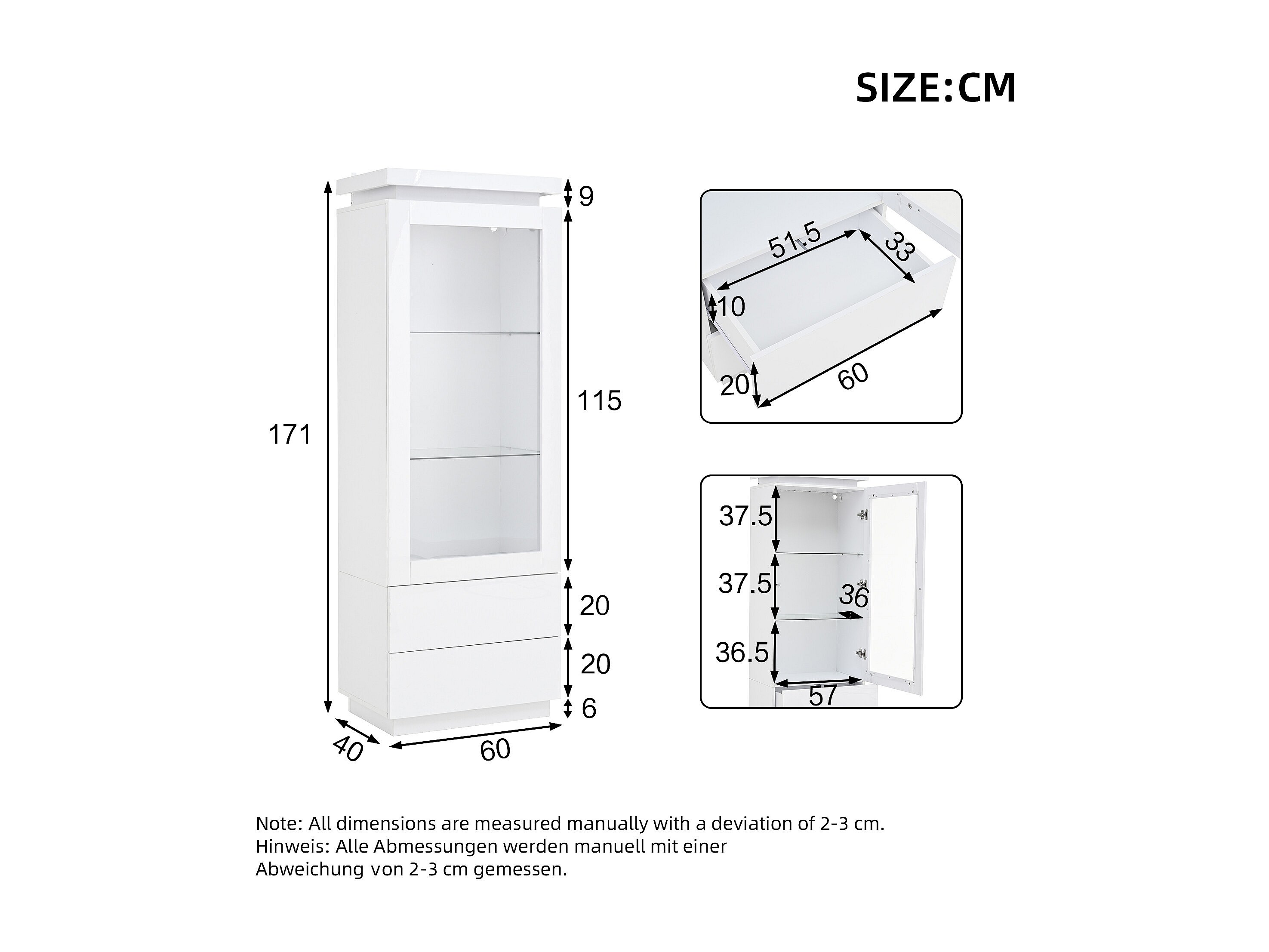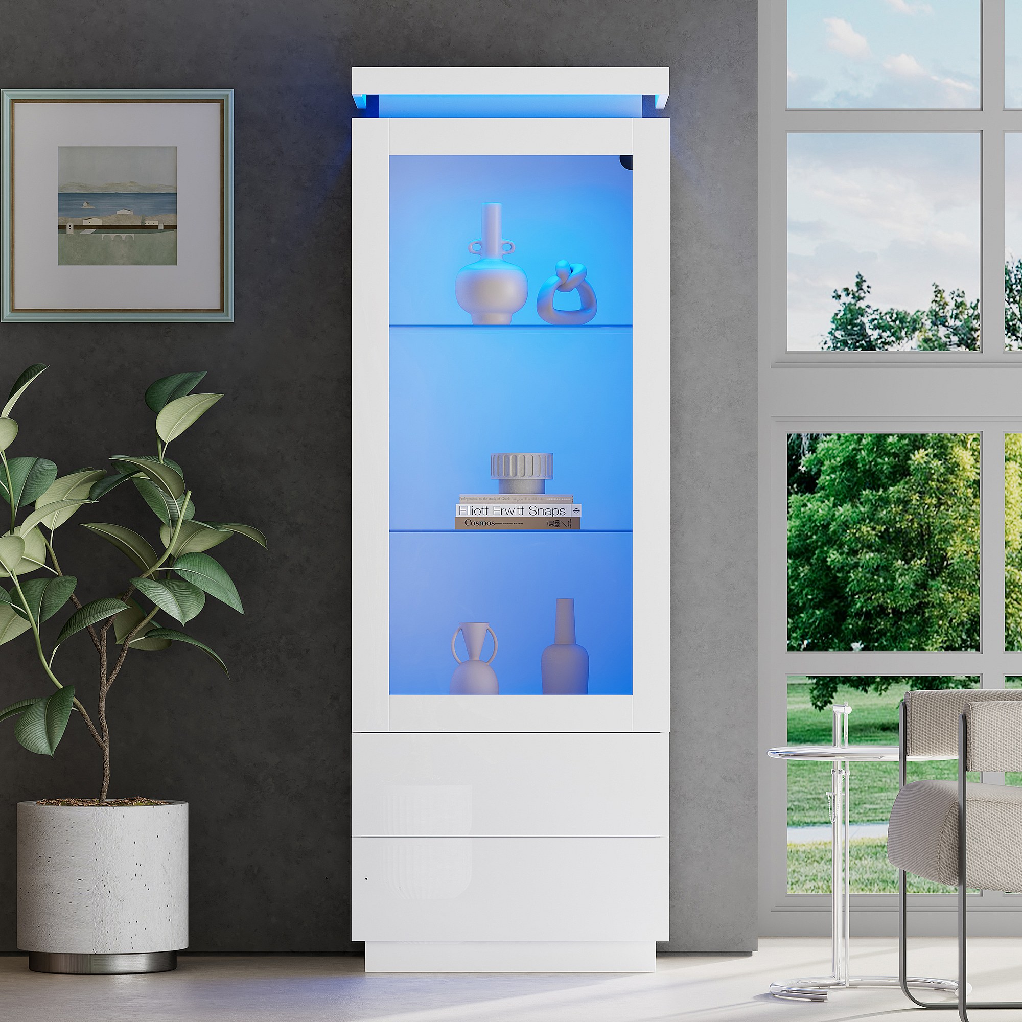Vitrine haute en verre brillant avec Leds - 60 x 40 x 171 cm - avec 2 tiroirs + portes vitrées - aggloméré - blanc