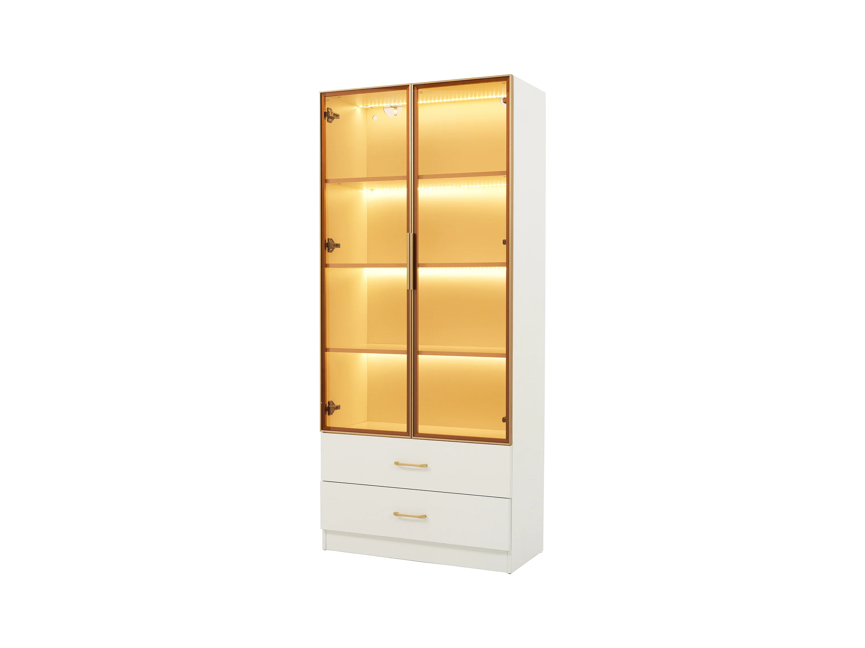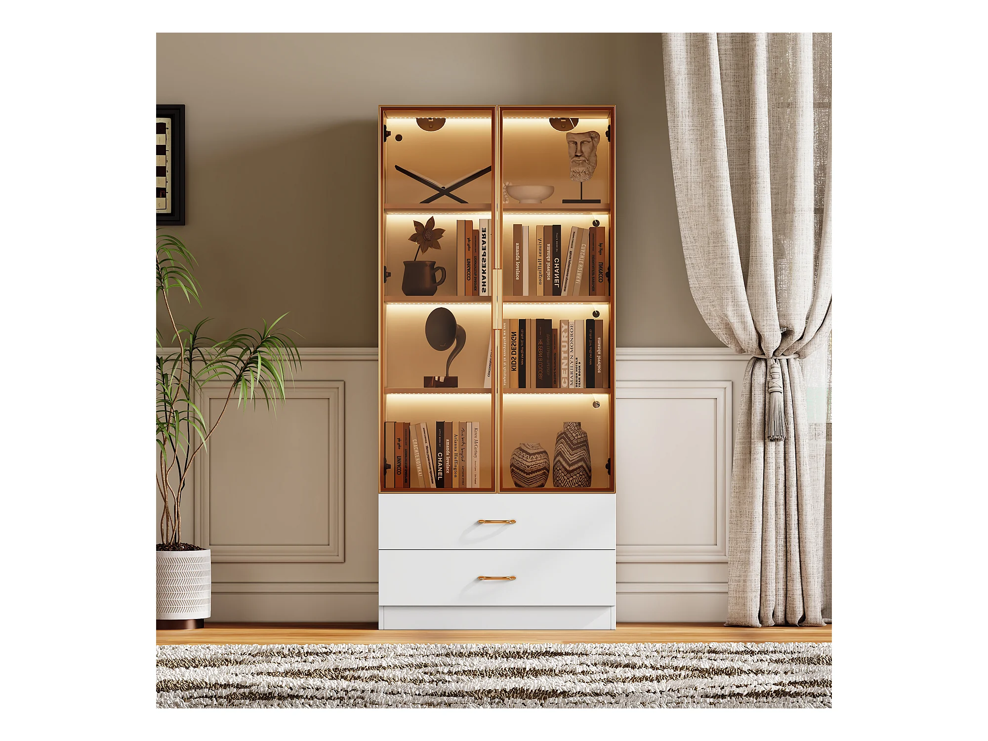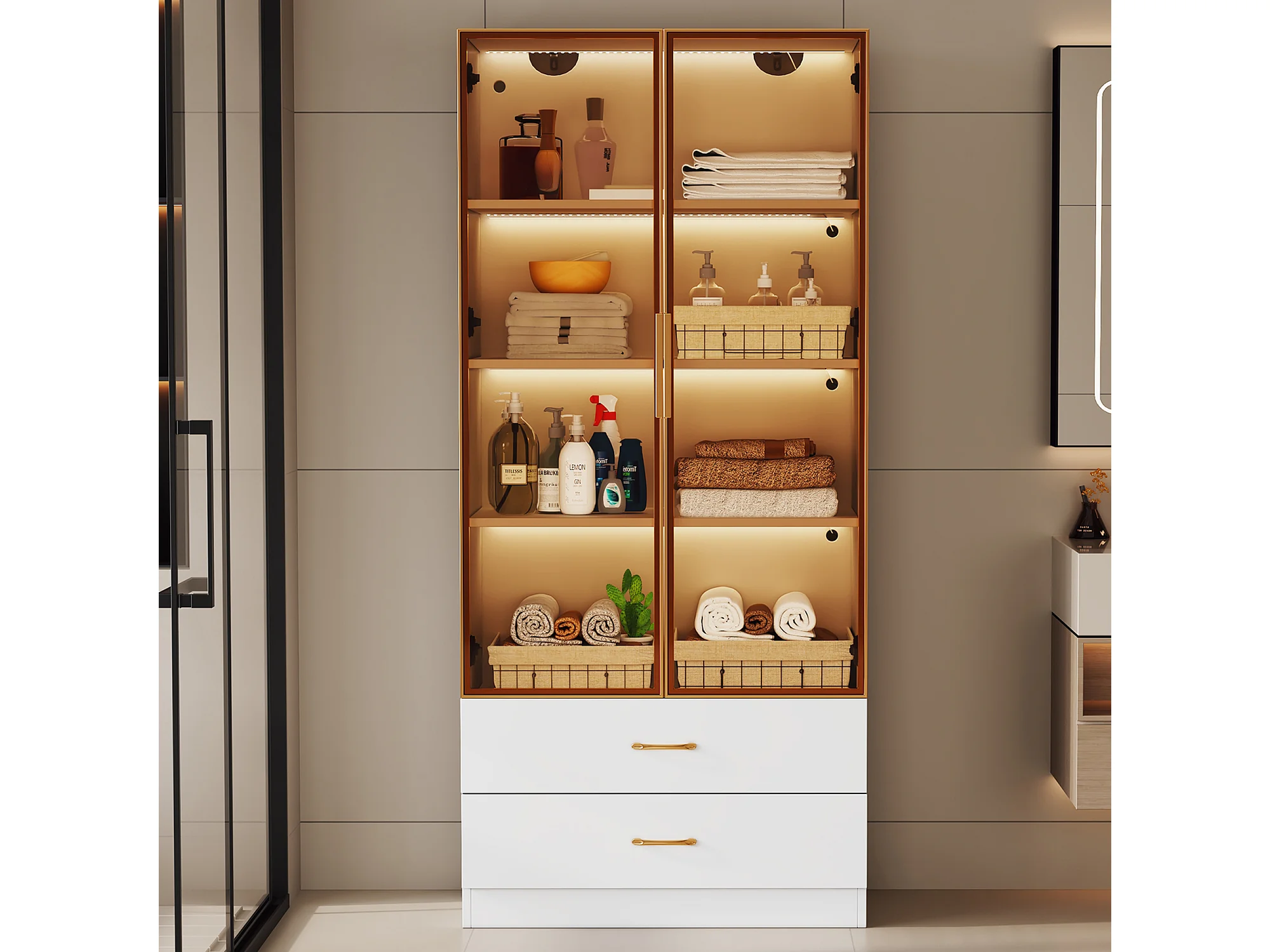 Vitrine、Meuble de salle de bain avec LED - 2 tiroirs et 2 portes vitrées - Blanc