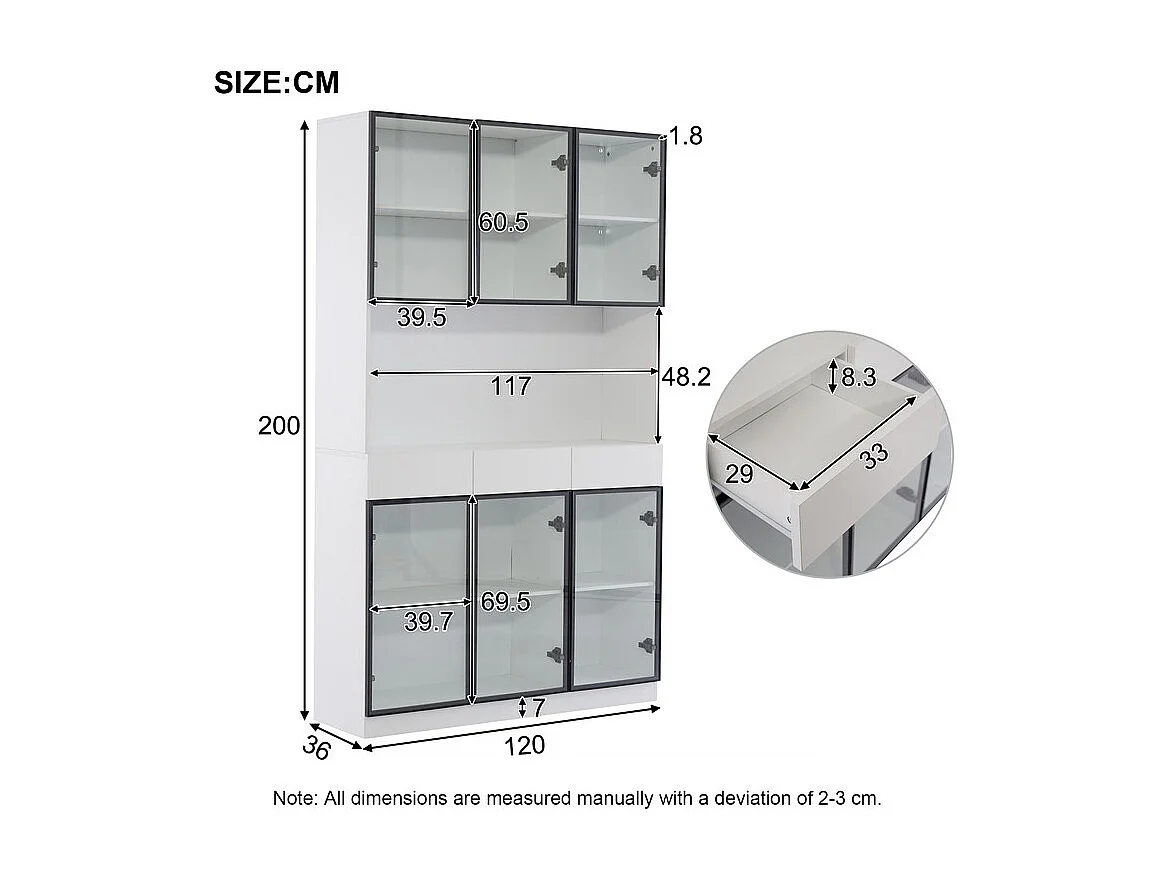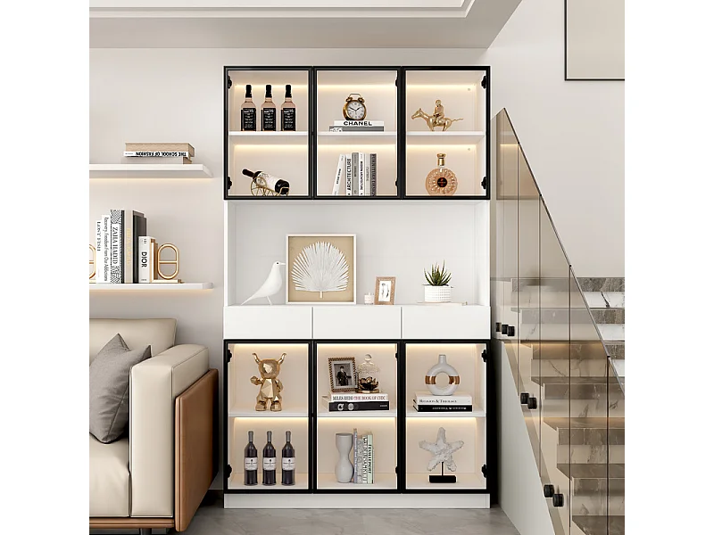 Vitrine Murale - 6 portes en verre et 3 tiroirs - avec RGB LED - Panneau de particule - 120x36x200cm