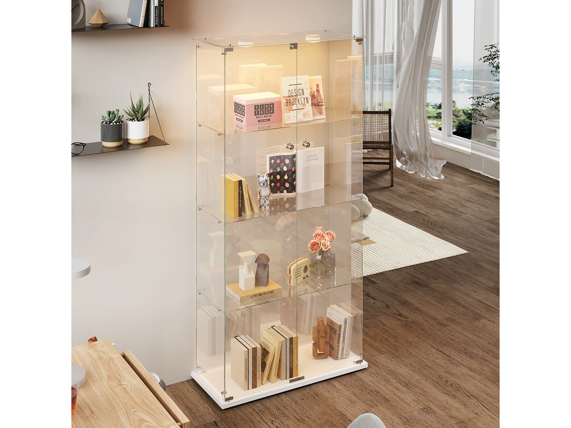 Vitrine vitrée avec lampe à tapotement, meuble de présentation, 2 portes verrouillables, 4 étagères, 163 x 78,5 x 35 cm, blanc