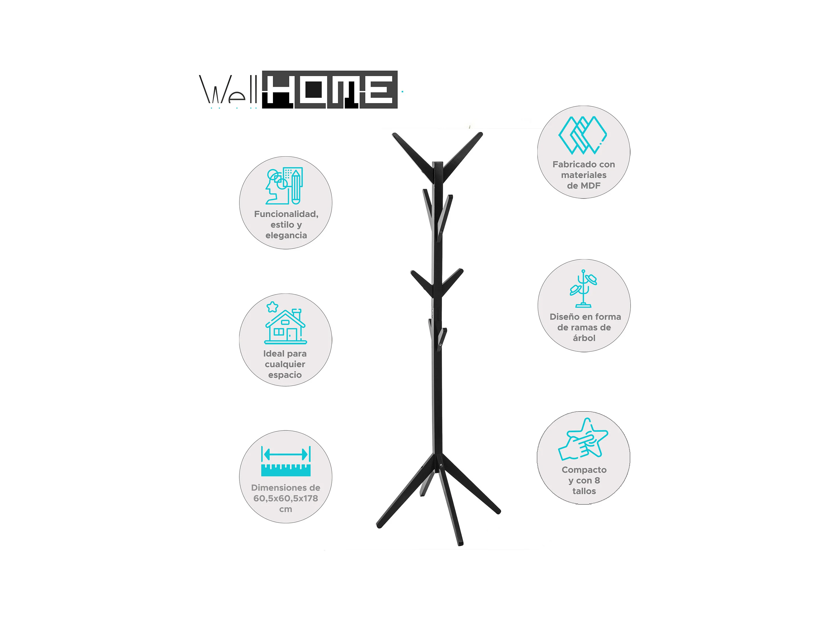Portant en bois massif Parya Home en forme d’arbre avec 8 crochets et structure en bois de caoutchouc noir