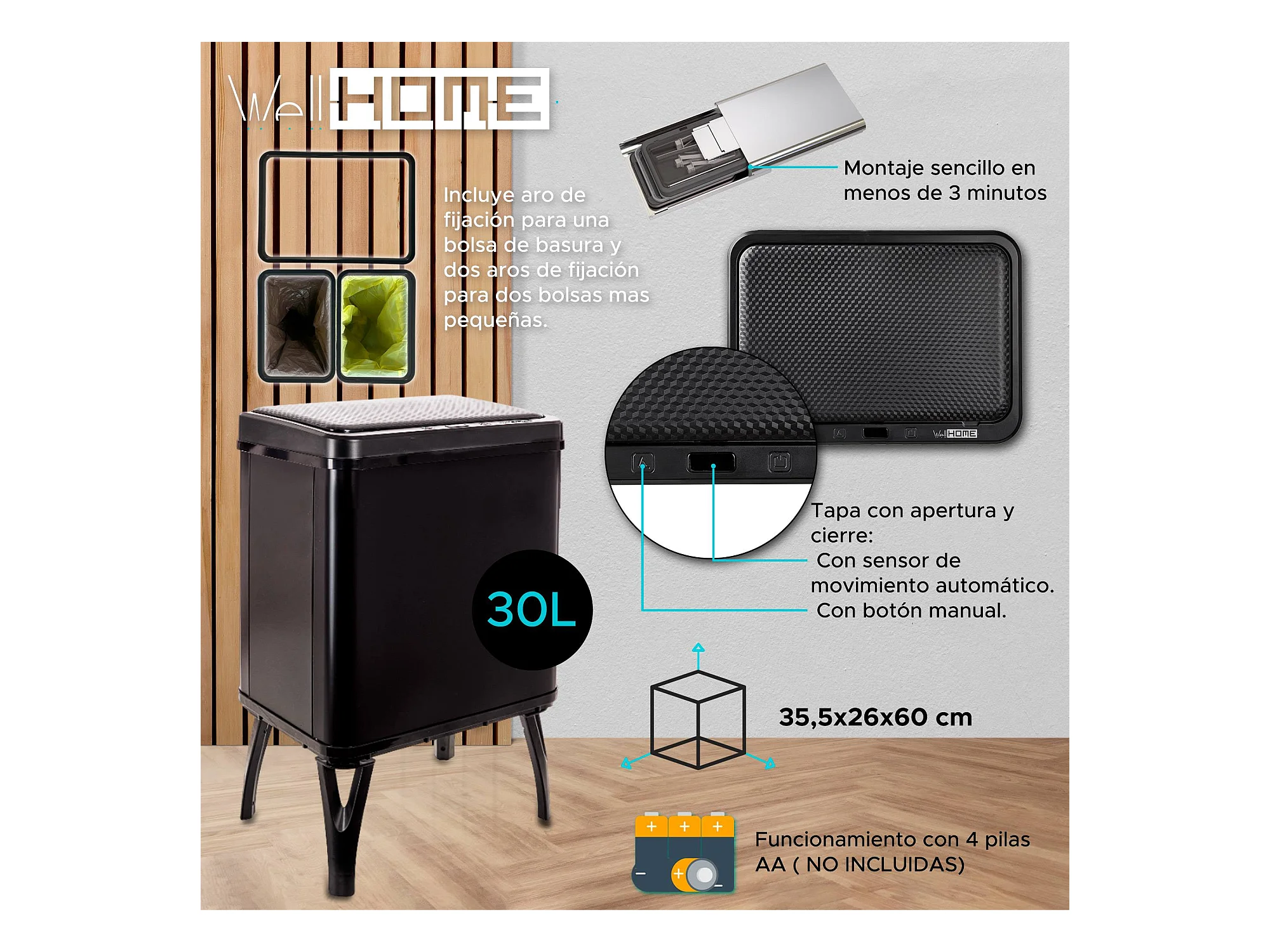 WELL HOME - Poubelle intelligente SANS pieds avec ouverture automatique et contact manuel 30L, 35,5x26x60cm, Noir