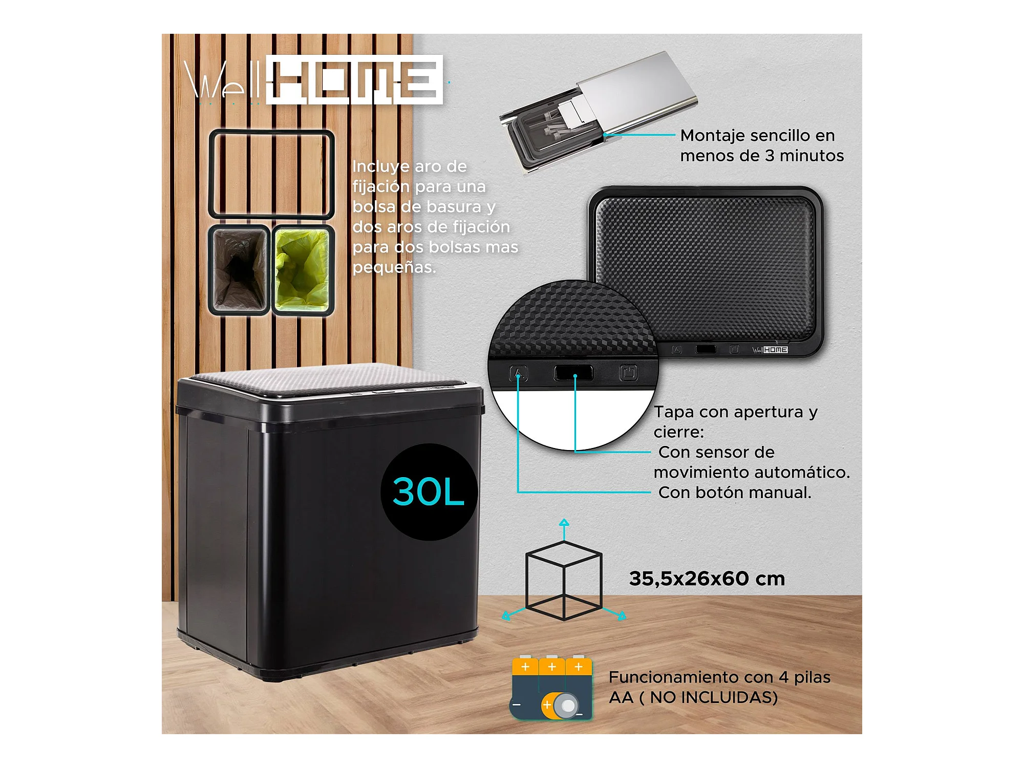 WELL HOME - Poubelle intelligente SANS pieds avec ouverture automatique et contact manuel 30L, 35,5x26x60cm, Noir