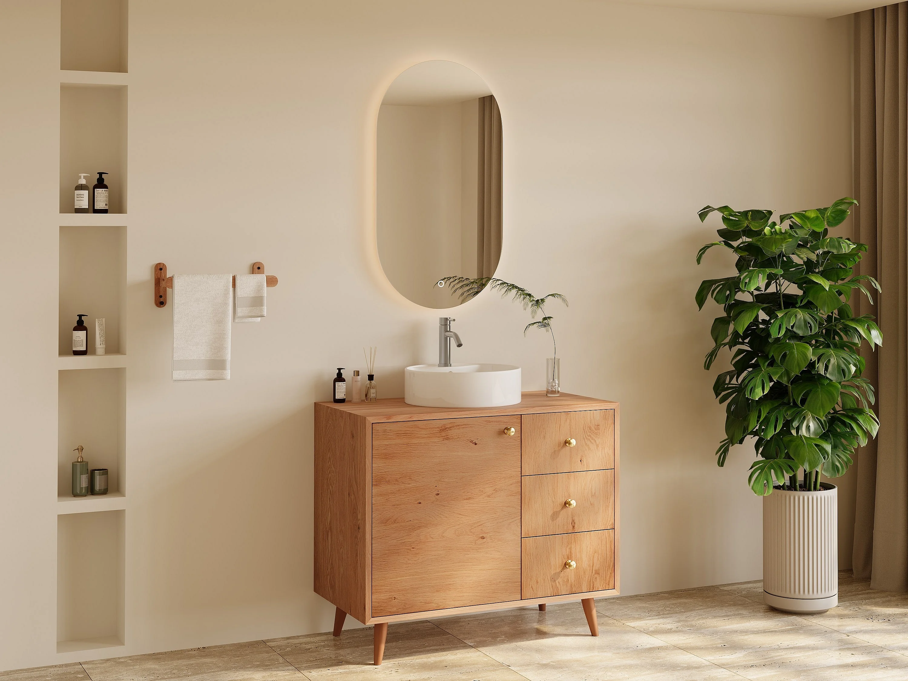 Meuble de salle de bain en chêne massif avec vasque à poser ronde et robinet - Naturel clair - 93 cm - ZARENO