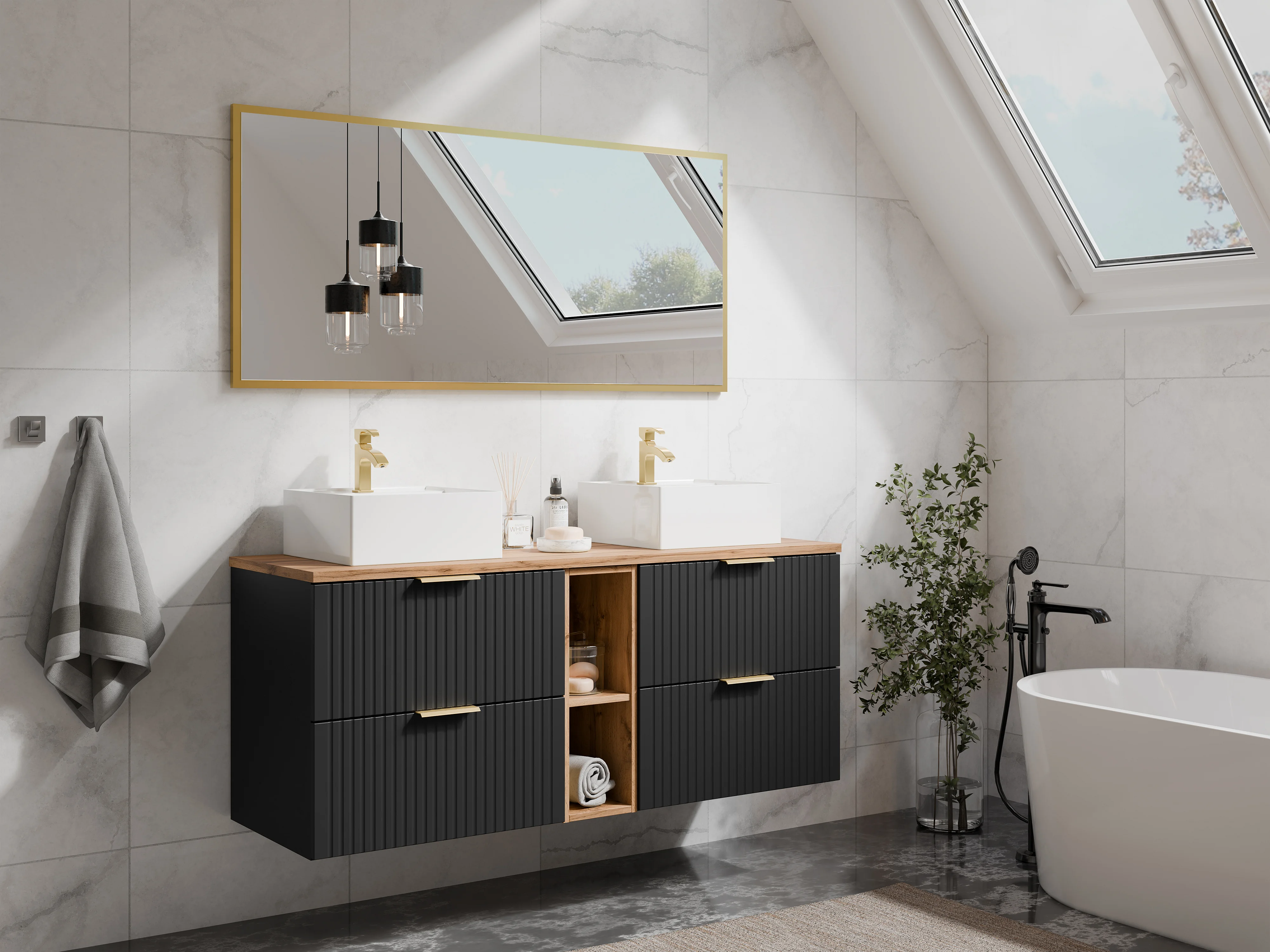Meuble sous vasque suspendu strié avec niches - Noir et naturel clair - L140 cm - ZEVARA
